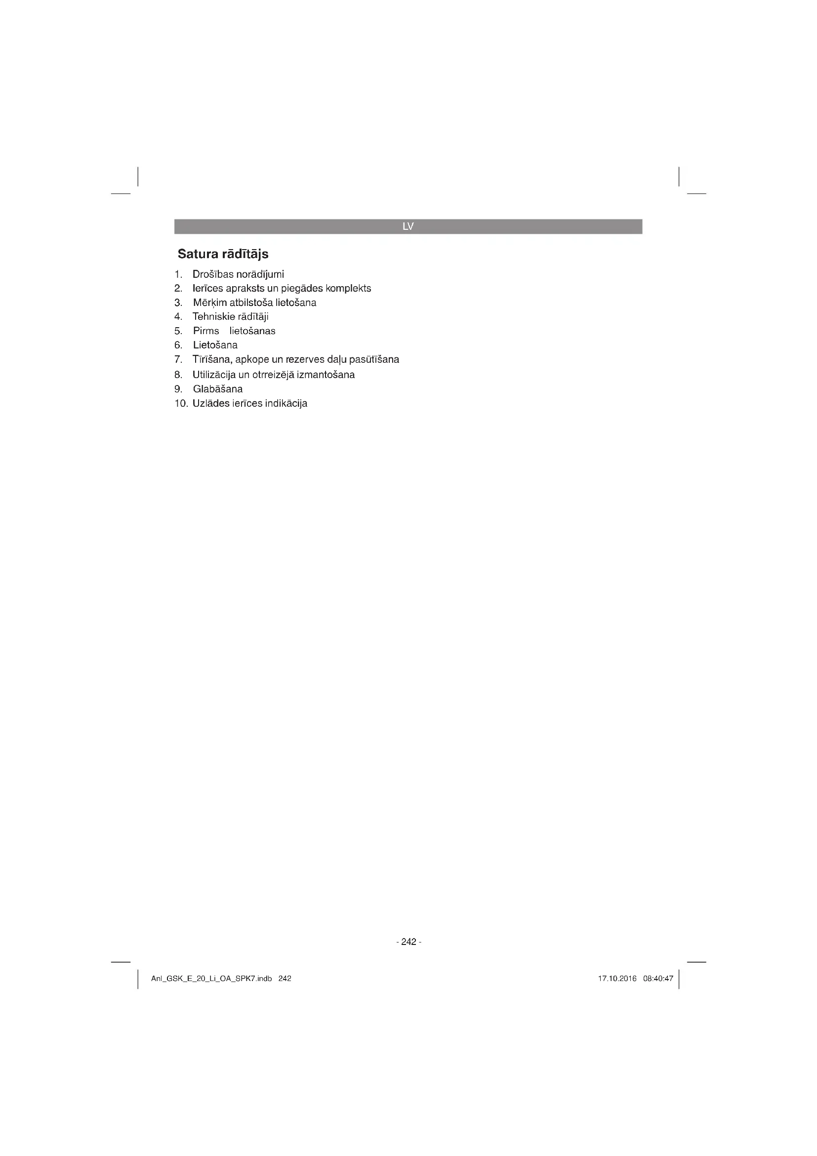 Tikai ES valstīm Neizmetiet elektroierīces sadzīves atkritumos! Saskaņā ar Eiropas direktīvu 2012/19/EK par nolietotajām elektriskajām un elektroniskajām ierīcēm un tās transponēšanu nacionālajā likumdošanā nolietotās elektroierīces ir jāsavāc atsevišķi un jānodod atkārtotai izmantošanai atbilstoši apkārtējās vides prasībām. Otrreizējā izmantošana kā alternatīva atpakaļnosūtīšanas prasībai: Tā vietā, lai nosūtītu atpakaļ nolietoto elektroierīci, tās īpašniekam kā alternatīva ir uzlikts pienākums sadarboties pienācīgas izmantošanas ietvaros īpašuma tiesību nodošanas gadījumā. Nolietoto ierīci šajā gadījumā var nodot arī atpakaļpieņemšanas uzņēmumā, kas veic tās likvidēšanu atbilstoši nacionālajam likumam par cirkulācijas saimniecību un atkritumiem. Tas neattiecas uz nolietotajām ierīcēm pievienoto piederumu detaļām un palīglīdzekļiem bez elektriskajām sastāvdaļām. Ražojuma dokumentācijas un pavaddokumentu pārdrukāšana vai citāda izplatīšana, arī fragmentāri ir atļauta tikai ar skaidru iSC GmbH piekrišanu. Paturētas tiesības veikt tehniskas izmaiņas Anl_GSK_E_20_Li_OA_SPK7.indb 249Anl_GSK_E_20_Li_OA_SPK7.indb 249 17.10.2016 08:40:4817.10.2016 08:40:48LV