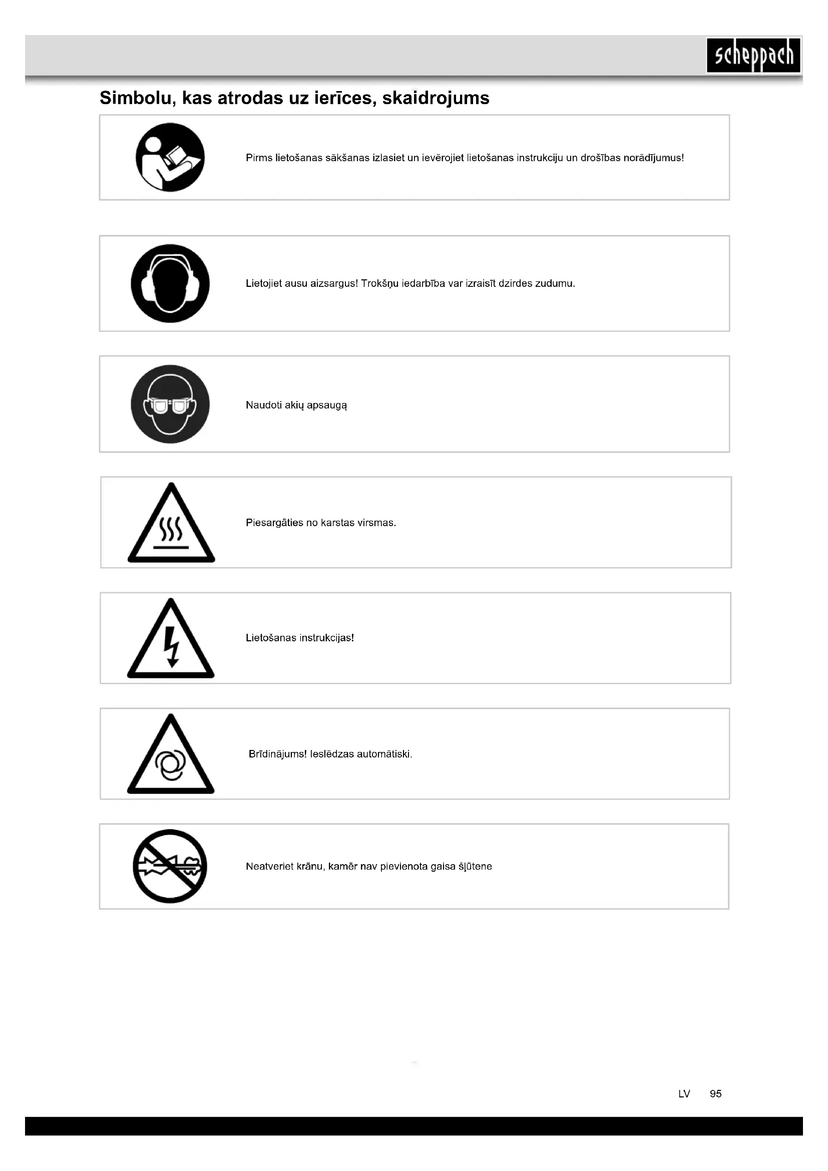 - Patikrinkite greitai išardomą movą, prireikus pakeiskite.95LV Simbolu, kas atrodas uz ierīces, skaidrojums Pirms lietošanas sākšanas izlasiet un ievērojiet lietošanas instrukciju un drošības norādījumus! Lietošanas instrukcijas! Brīdinājums! Ieslēdzas automātiski. Lietojiet ausu aizsargus! Trokšņu iedarbība var izraisīt dzirdes zudumu. Piesargāties no karstas virsmas. Neatveriet krānu, kamēr nav pievienota gaisa šļūtene Naudoti akių apsaugą96 LV Ierīces apraksts