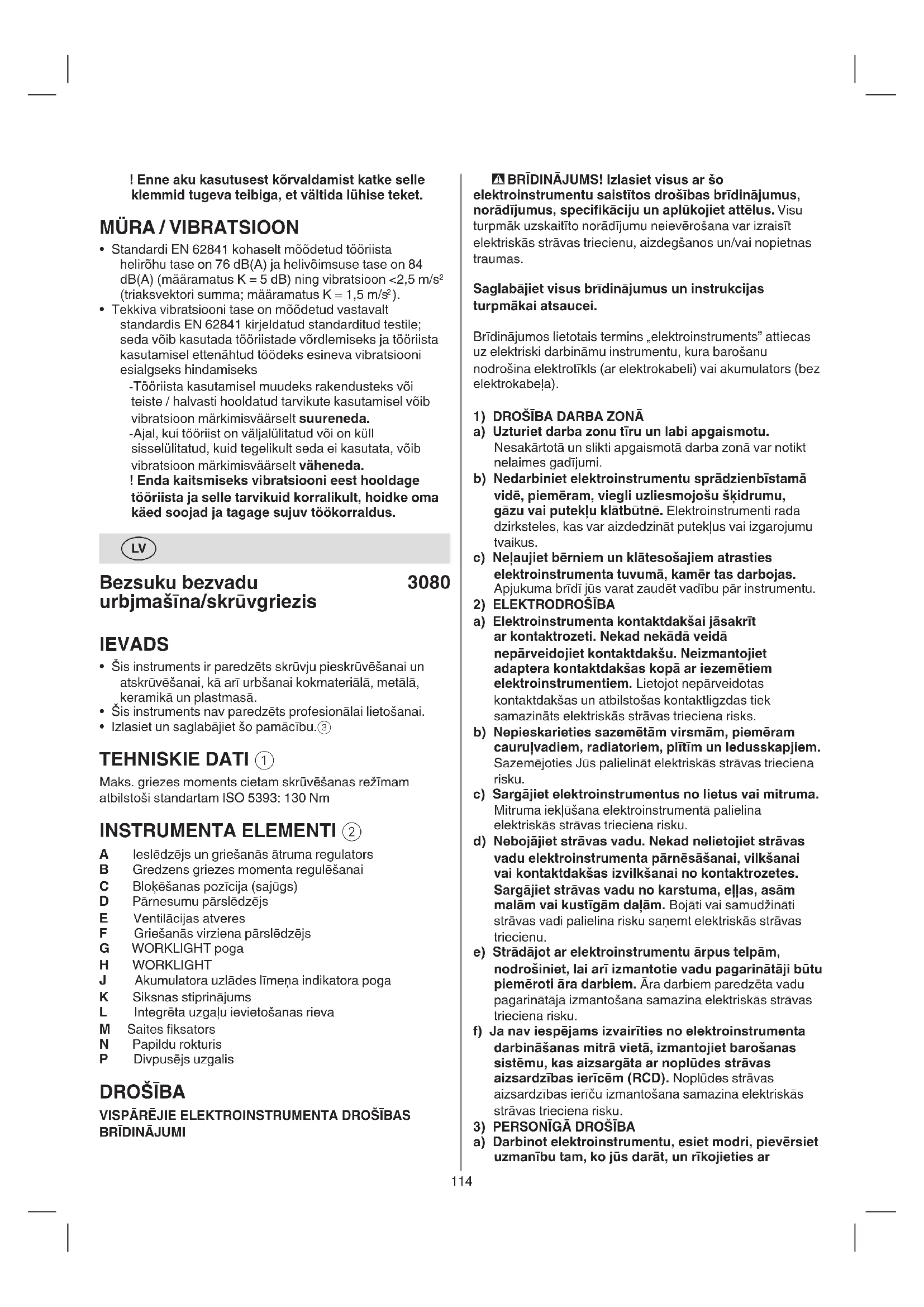 - Vibrācijas līmenis ir noteikts, izmantojot standartā EN 62841 paredzēto procedūru; to var izmantot, lai salīdzinātu instrumentus un provizoriski izvērtētu vibrācijas iedarbību, lietojot instrumentu minētajiem mērķiem - instrumenta izmantošana citiem mērķiem vai ar citiem vai nepietiekami koptiem piederumiem var ievērojami palielināt kopējo vibrācijas iedarbības pakāpi - laika periodi, kad instruments ir izslēgts vai arī ir ieslēgts, taču darbs ar to nenotiek, var ievērojami samazināt kopējo vibrācijas iedarbības pakāpi, samazinot iedarbības līmeni ! pasargājiet sevi no vibrācijas iedarbības, veicot instrumenta un tā piederumu tehnisko apkopi, novēršot roku atdzišanu un pareizi organizējot darbu119 nepasitikėkite ir nepraraskite budrumo, kad paisytumėte saugaus įrankio naudojimo taisyklių. Užtenka akimirkos išsiblaškymo, kad dėl neatsargaus veiksmo sunkiai susižalotumėte.