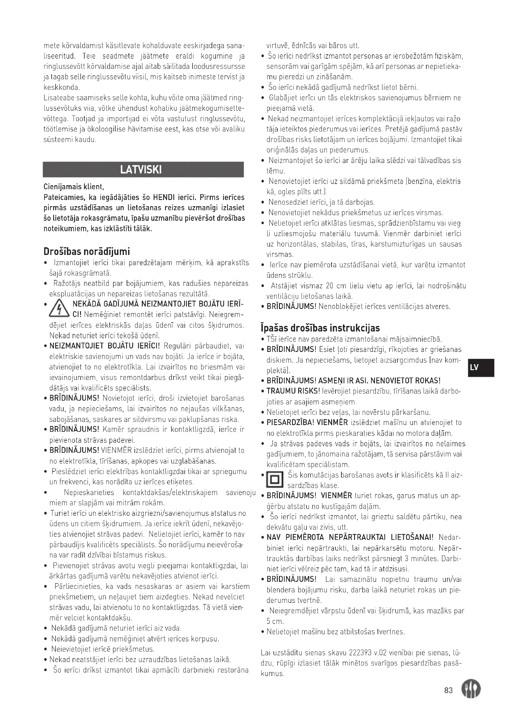 kritumus pārstrādei, lūdzu, sazinieties ar savu vietējo atkritu- mu savākšanas uzņēmumu. Ražotājs un importētājs neuzņe- mas atbildību par pārstrādi, apstrādi un ekoloģisku likvidēšanu ne tieši, ne izmantojot publisku sistēmu. LIETUVIŲ Gerb. kliente, Dėkojame, kad įsigijote šį „HENDI“ prietaisą. Prieš montuo