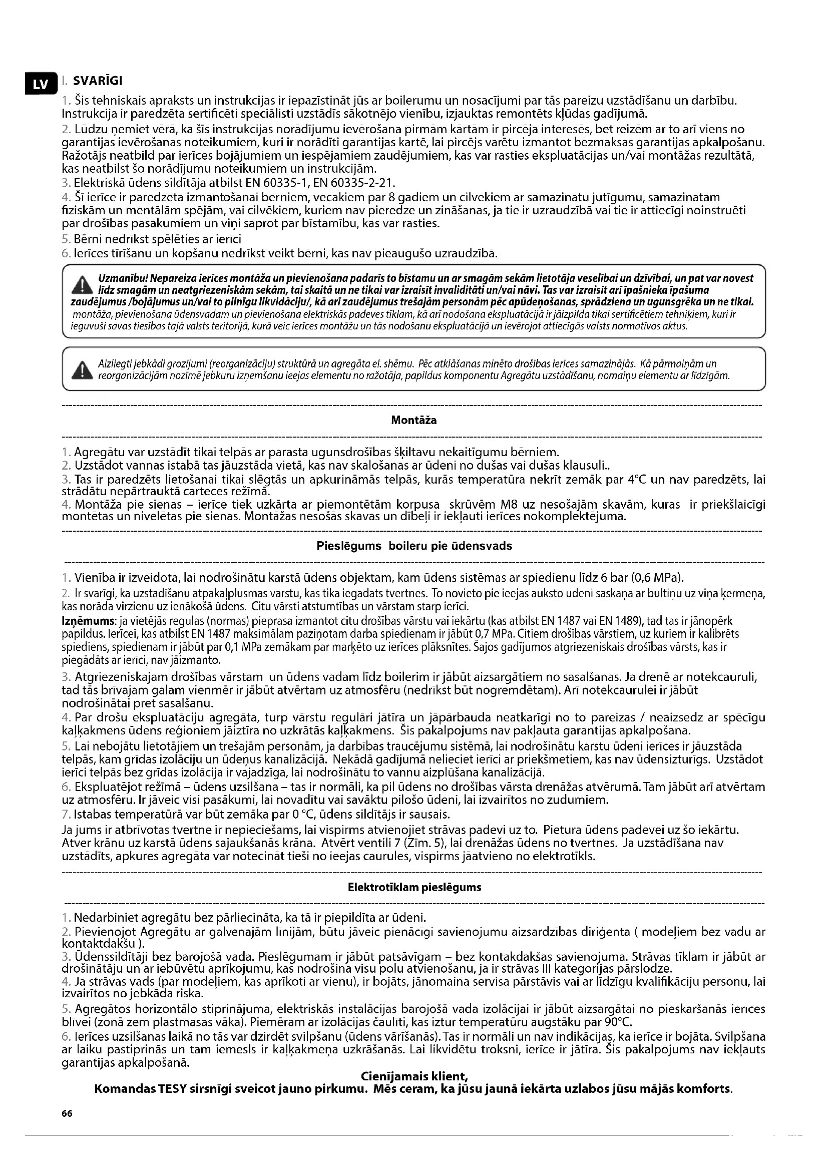 2. Pievienojot Agregātu ar galvenajām līnijām, būtu jāveic pienācīgi savienojumu aizsardzības diriģenta ( modeļiem bez vadu ar kontaktdakšu ). 3. Ūdenssildītāji bez barojošā vada. Pieslēgumam ir jābūt patsāvīgam – bez kontakdakšas savienojuma. Strāvas tīklam ir jābūt ar drošinātāju un ar iebūvētu aprīkojumu, kas nodrošina visu polu atvienošanu, ja ir strāvas III kategorijas pārslodze. 4. Ja strāvas vads (par modeļiem, kas aprīkoti ar vienu), ir bojāts, jānomaina servisa pārstāvis vai ar līdzīgu kvalikāciju personu, lai izvairītos no jebkāda riska. 5. Agregātos horizontālo stiprinājuma, elektriskās instalācijas barojošā vada izolācijai ir jābūt aizsargātai no pieskaršanās ierīces blīvei (zonā zem plastmasas vāka). Piemēram ar izolācijas čaulīti, kas iztur temperatūru augstāku par 90°C. 6. Ierīces uzsilšanas laikā no tās var dzirdēt svilpšanu (ūdens vārīšanās). Tas ir normāli un nav indikācijas, ka ierīce ir bojāta. Svilpšana ar laiku pastiprinās un tam iemesls ir kaļķakmeņa uzkrāšanās. Lai likvidētu troksni, ierīce ir jātīra. Šis pakalpojums nav iekļauts garantijas apkalpošanā. Cienījamais klient, Komandas TESY sirsnīgi sveicot jauno pirkumu. Mēs ceram, ka jūsu jaunā iekārta uzlabos jūsu mājās komforts.67Latviešu