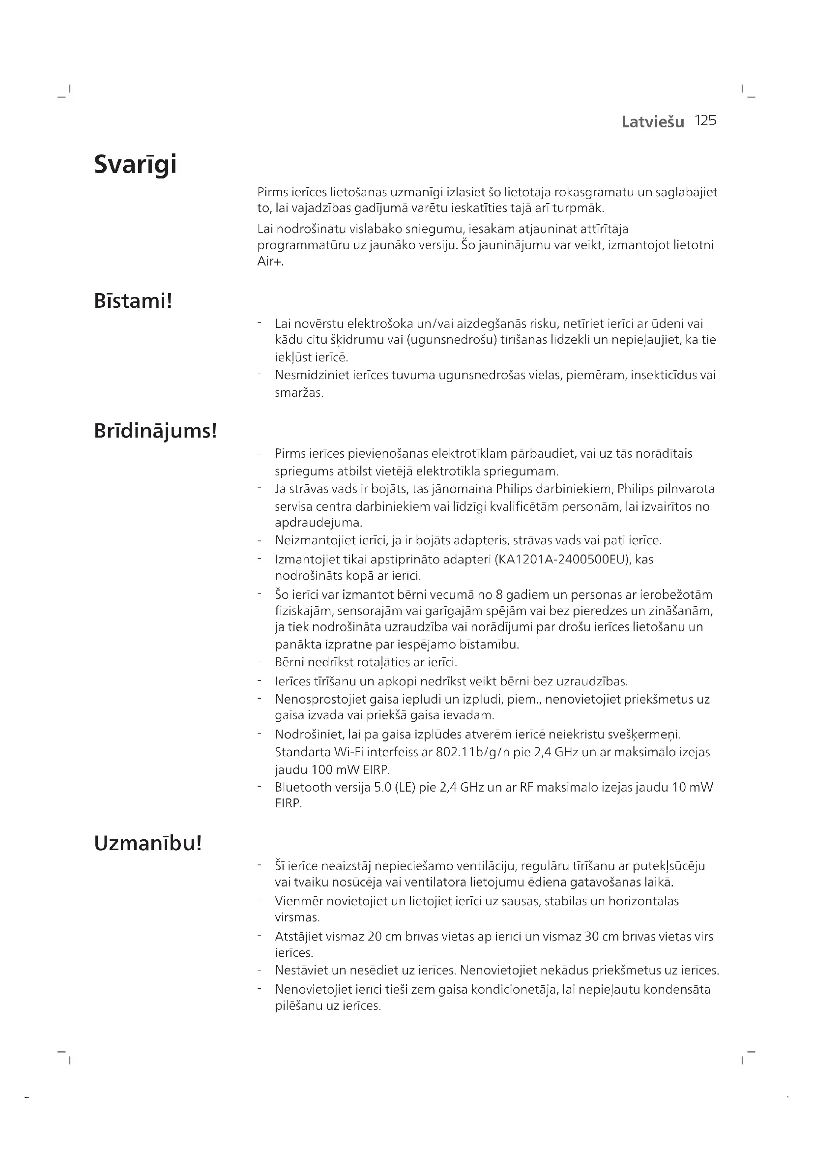 Latviešu Svarīgi Pirms ierīces lietošanas uzmanīgi izlasiet šo lietotāja rokasgrāmatu un saglabājiet to, lai vajadzības gadījumā varētu ieskatīties tajā arī turpmāk. Lai nodrošinātu vislabāko sniegumu, iesakām atjaunināt attīrītāja programmatūru uz jaunāko versiju. Šo jauninājumu var veikt, izmantojot lietotni Air+. Bīstami!