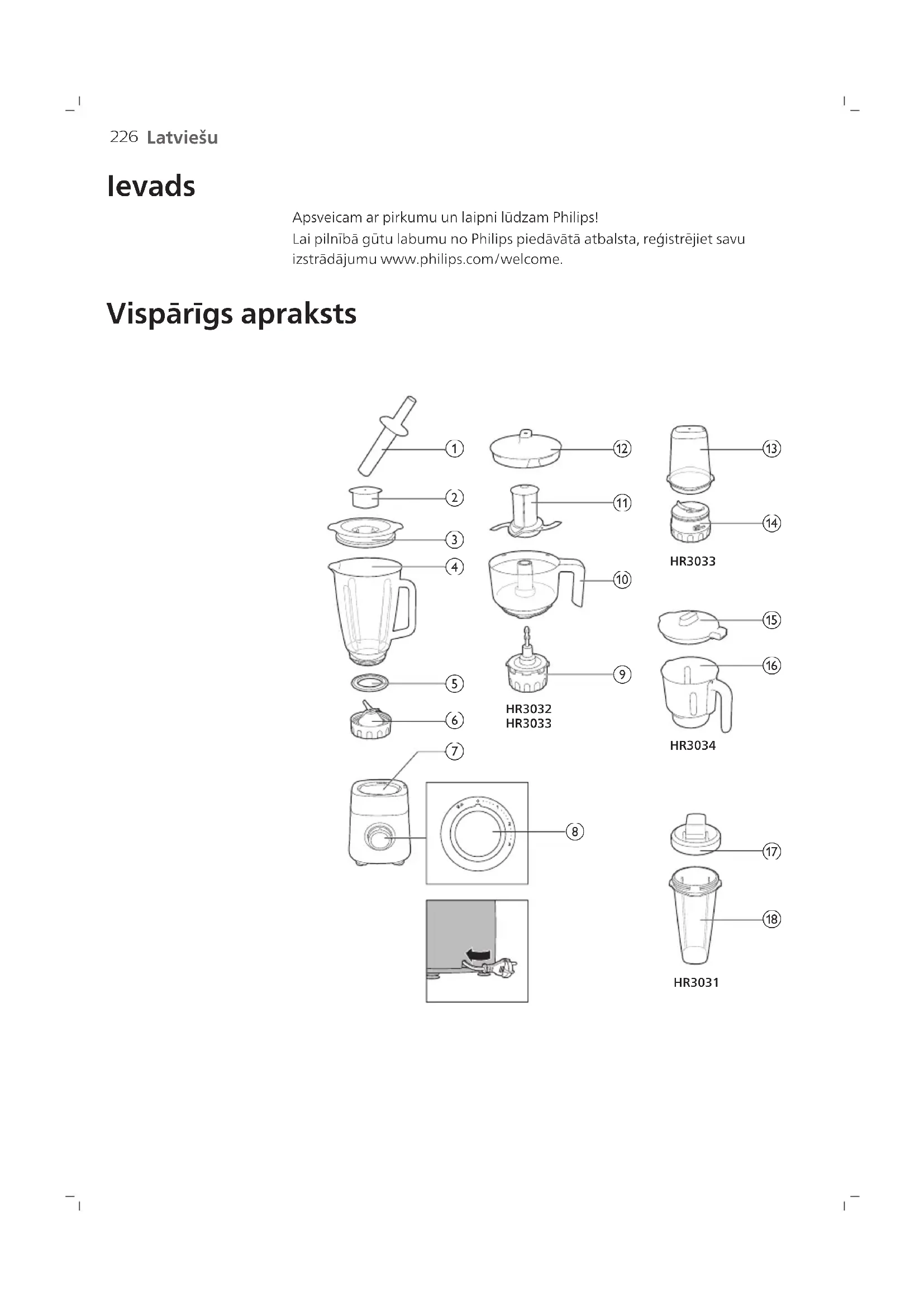 Latviešu Ievads Apsveicam ar pirkumu un laipni lūdzam Philips! Lai pilnībā gūtu labumu no Philips piedāvātā atbalsta, reģistrējiet savu izstrādājumu www.philips.com/welcome. Vispārīgs apraksts HR3034HR3031 HR3033HR3032 HR3033