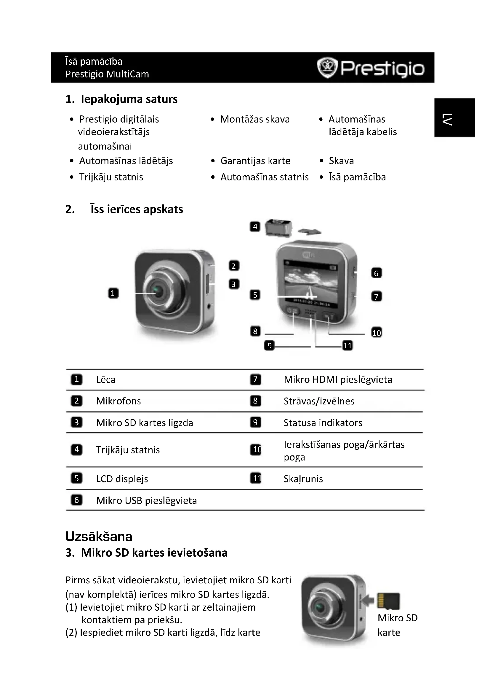 Mikro SD karte Pirms sākat videoierakstu, ievietojiet mikro SD karti (nav komplektā) ierīces mikro SD kartes ligzdā. (1) Ievietojiet mikro SD karti ar zeltainajiem kontaktiem pa priekšu. (2) Iespiediet mikro SD karti ligzdā, līdz karteĪsā pamācība Prestigio MultiCam