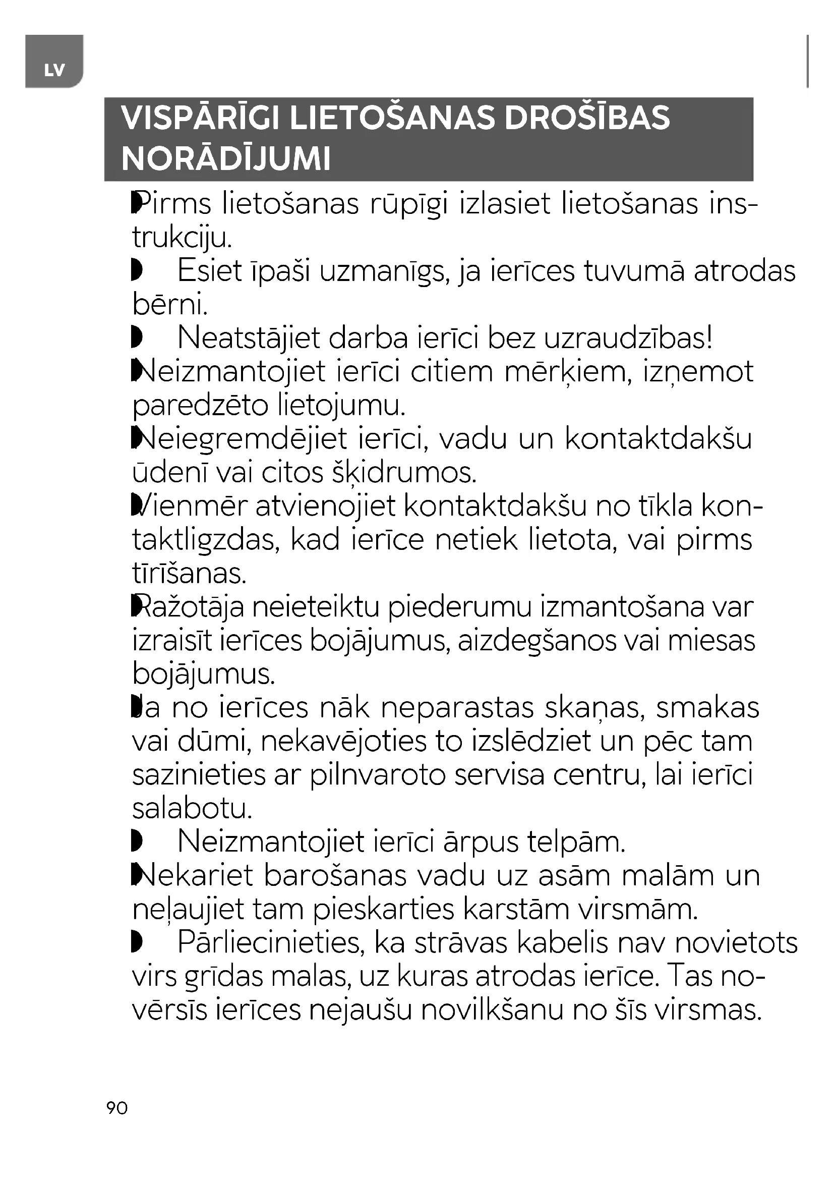 Nekariet barošanas vadu uz asām malām un neļaujiet tam pieskarties karstām virsmām. Pārliecinieties, ka strāvas kabelis nav novietots virs grīdas malas, uz kuras atrodas ierīce. Tas no- vērsīs ierīces nejaušu novilkšanu no šīs virsmas.91