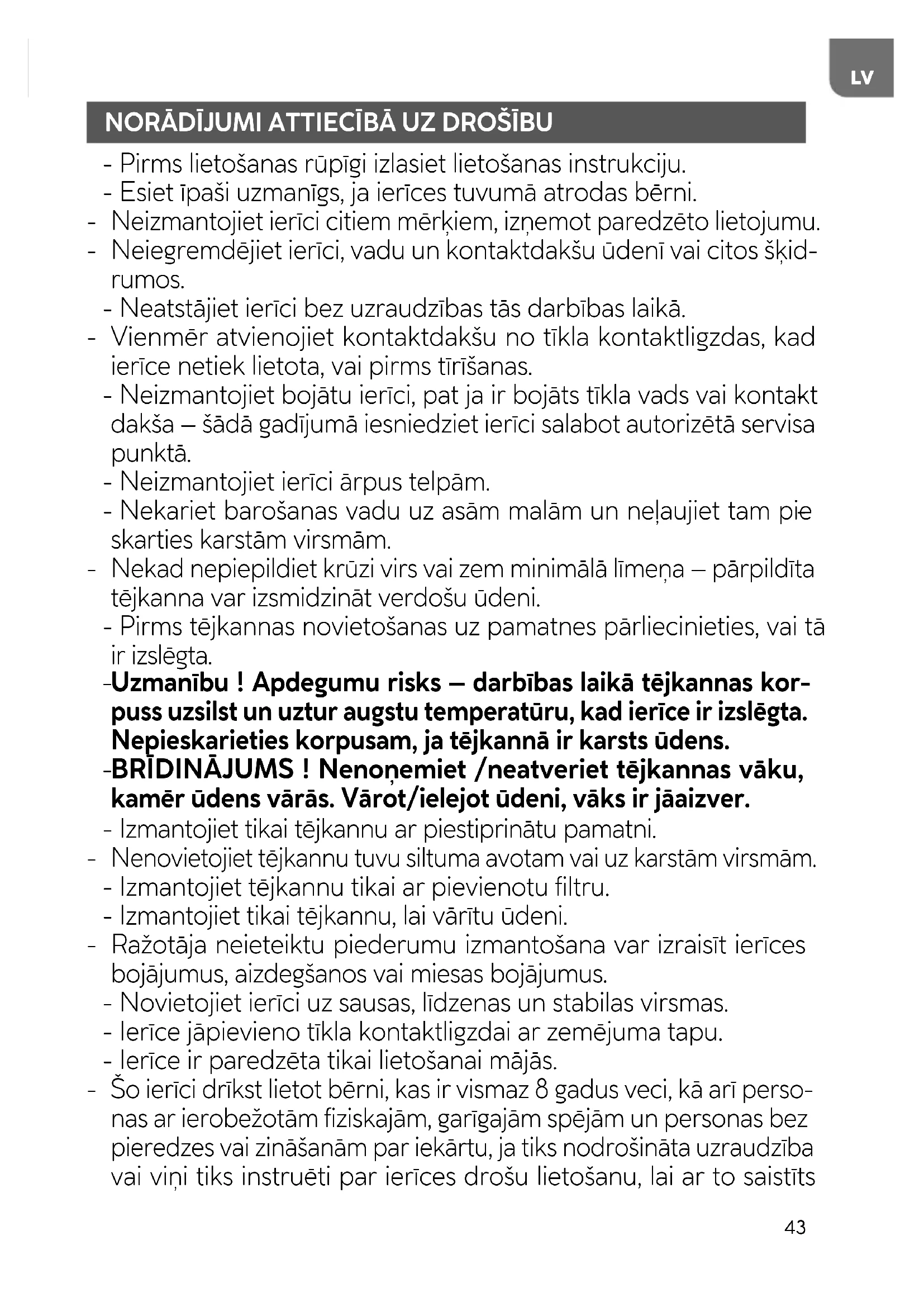 NORĀDĪJUMI ATTIECĪBĀ UZ DROŠĪBU - Pirms lietošanas rūpīgi izlasiet lietošanas instrukciju. - Esiet īpaši uzmanīgs, ja ierīces tuvumā atrodas bērni.