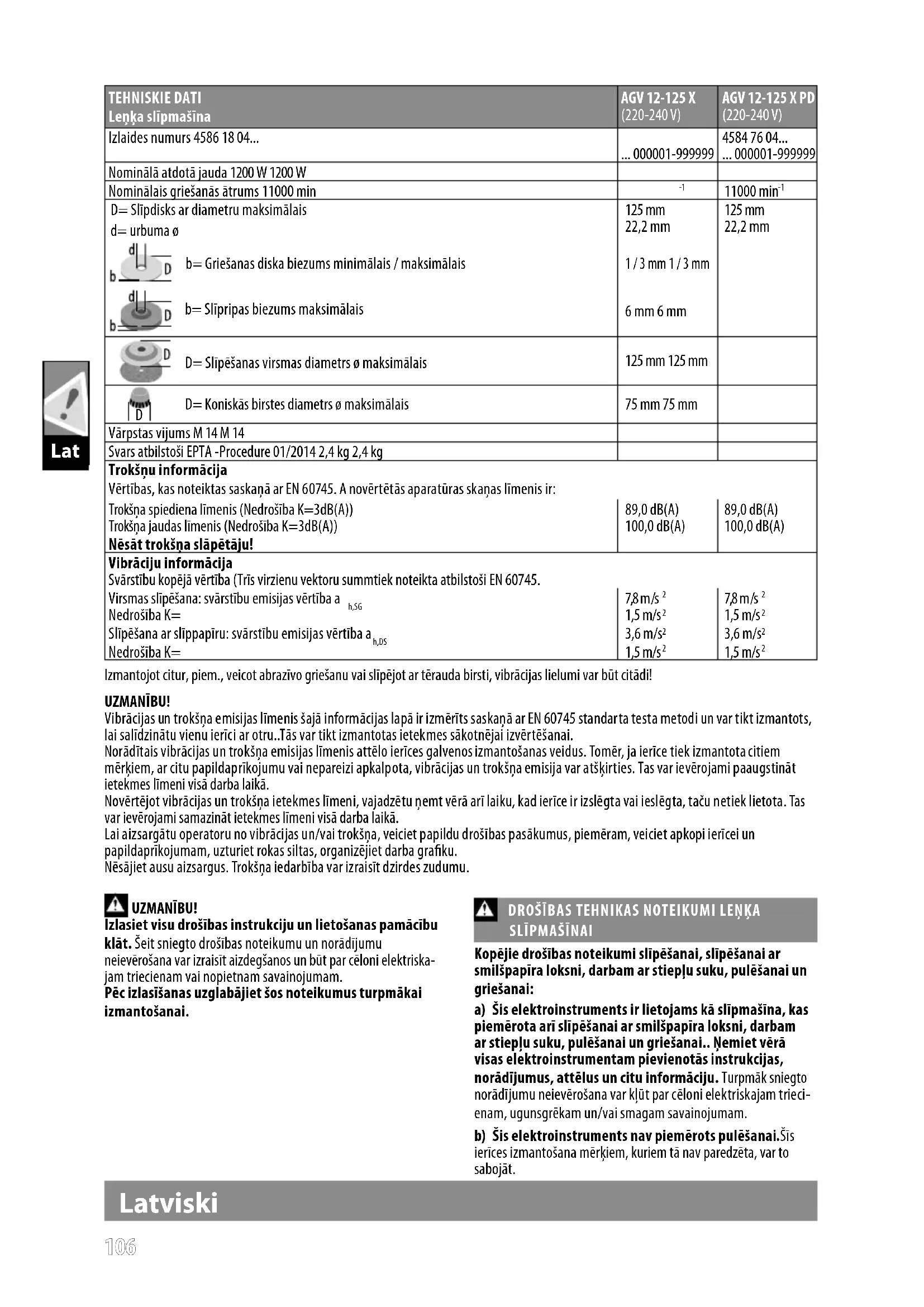 Kopējie drošības noteikumi slīpēšanai, slīpēšanai ar smilšpapīra loksni, darbam ar stiepļu suku, pulēšanai un griešanai: a) Šis elektroinstruments ir lietojams kā slīpmašīna, kas piemērota arī slīpēšanai ar smilšpapīra loksni, darbam ar stiepļu suku, pulēšanai un griešanai.. Ņemiet vērā visas elektroinstrumentam pievienotās instrukcijas, norādījumus, attēlus un citu informāciju. Turpmāk sniegto norādījumu neievērošana var kļūt par cēloni elektriskajam trieci- enam, ugunsgrēkam un/vai smagam savainojumam. b) Šis elektroinstruments nav piemērots pulēšanai.Šīs ierīces izmantošana mērķiem, kuriem tā nav paredzēta, var to sabojāt.107107 Lat Latviski c) Neizmantojiet piederumus, kurus ražotājrma nav paredzējusi šim elektroinstrumentam un ieteikusi lietošanai kopā ar to. Iespēja nostiprināt piederumu uz elektro- in stru menta vēl negarantē tā drošu lietošanu. d) Iesaistāmā instrumenta pieļaujamajam apgriezienu skaitam jābūt vismaz tik augstam kā uz elektroinstru- menta norādītajam maksimālajam apgriezienu skaitam. Aprīkojums, kurš rotē ātrāk par pieļaujamo ātrumu, var salūzt un tikt atmests atpakaļ e) Darbinstrumentu ārējam diametram un biezumam jāatbilst elektroinstrumenta konstrukcijai un izmēriem. Ja darbinstrumenta izmēri ir izvēlēti nepareizi, tas pilnībā nenovieto- jas zem aizsarga un darba laikā apgrūtina instrumenta vadību. f) Papildpiederumu vītnei ir jāsakrīt ar slīpēšanas vārpstas vītni. Piederumiem, kas tiek piestiprināti ar atloku, ksācijas serdeņa urbumam papildpiederumā ir jāsakrīt ar lokalizācijas atloka diametru. Papildpiederumi, kas neder uz montāžas serdeņa, griežas ekscentriski, pārmērīgi spēcīgi vibrē un var izraisīt kontroles zudumu pār darba rīku. g) Neizmantojiet bojātus darbinstrumentus. Ik reizi pirms darbinstrumentu lietošanas pārbaudiet, vai tie nav bojāti, piemēram, vai slīpēšanas diski nav atslāņojušies vai ieplaisājuši, vai slīpēšanas pamatnē nav vērojamas plaisas un vai stiepļu suku veidojošās stieples nav vaļīgas vai atlūzušas. Ja elektroinstruments vai darbinstruments ir kritis no zināma augstuma, pārbaudiet, vai tas nav bojāts, vai arī izmantojiet darbam nebojātu darbinstrumentu. Pēc darbinstrumenta apskates un iestiprināšanas ļaujiet elektro- instrumentam darboties ar maksimālo griešanās ātrumu vienu minūti ilgi, turot rotējošo darbinstrumentu drošā attālumā no sevis un citām tuvumā esošajām personām. Bojātie darbinstrumenti šādas pārbaudes laikā parasti salūst. h) Lietojiet individuālos darba aizsardzības lī dzekļus. Atkarībā no veicamā darba rakstura izvēlieties pilnu sejas aizsargu, noslēdzošās aizsargbrilles vai parastās aizsargbrilles. Lai aizsargātos no lidojošajām slīpēšanas darbinstrumenta un apstrādājamā materiāla daļiņām, pēc vajadzības lietojiet putekļu aizsargmasku, ausu aizsargus un aizsargcimdus vai arī īpašu priekšautu. Lietotāja acis jāpasargā no lidojošajiem svešķermeņiem, kas dažkārt rodas darba gaitā. Putekļu aizsargmaskai vai respiratoram jāpasargā lietotāja elpošanas ceļi no putekļiem, kas veidojas darba laikā. Ilgstoši atrodoties stipra trokšņa iespaidā, var rasties paliekoši dzirdes traucējumi.