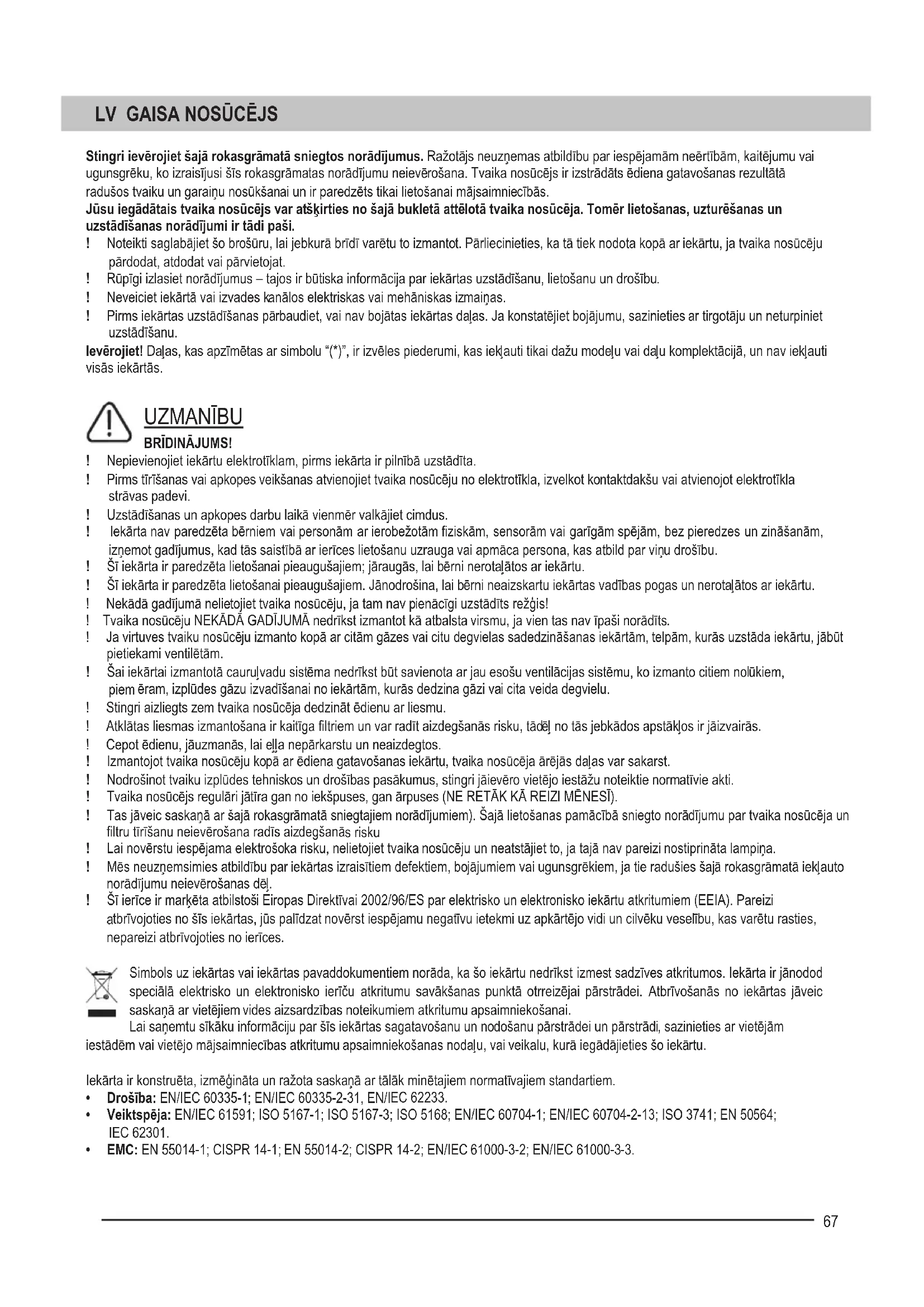 Stingri ievērojiet šajā rokasgrāmatā sniegtos norādījumus. Ražotājs neuzņemas atbildību par iespējamām neērtībām, kaitējumu vai ugunsgrēku, ko izraisījusi šīs rokasgrāmatas norādījumu neievērošana. Tvaika nosūcējs ir izstrādāts ēdiena gatavošanas rezultātā radušos tvaiku un garaiņu nosūkšanai un ir paredzēts tikai lietošanai mājsaimniecībās. Jūsu iegādātais tvaika nosūcējs var atšķirties no šajā bukletā attēlotā tvai ka nosūcēja. Tomēr lietošanas, uzturēšanas un uzstādīšanas norādījumi ir tādi paši. ! Noteikti saglabājiet šo brošūru, lai jebkurā brīdī varētu to izmantot. Pārliecinieties, ka tā tiek nodota kopā ar iekārtu, ja tvaika nosūcēju pārdodat, atdodat vai pārvietojat. ! Rūpīgi izlasiet norādījumus – tajos ir būtiska informācija par iekārtas uzstādīšanu, lietošanu un drošību. ! Neveiciet iekārtā vai izvades k anālos elektriskas vai mehāniskas izmaiņas. ! Pirms iekārtas uzstādīšanas pārbaudiet, vai nav bojātas iekārtas daļas. Ja konstatējiet bojājumu, sazinieties ar tirgotāju un neturpiniet uzstādīšanu. Ievērojiet! Daļas, kas apzīmētas ar simbolu “(*)”, ir izvēles piederumi, kas iekļauti tikai dažu modeļu vai daļu komplektācijā, un nav iekļauti visās iekārtās. UZMANĪBU BRĪDINĀJUMS! ! Nepievienojiet iekārtu elektrotīklam, pirms iekārta ir pilnībā uzstādīta. ! Pirms tīrīšanas vai apkopes veikšanas atvienojiet tvaika nosūcēju no elektrotīkla, izvelkot kontaktdakšu vai atvienojot elektrotīkla strāvas padevi. ! Uzstādīšanas un apkopes darbu laikā vienmēr valkājiet cimdus. ! Iekārta nav paredzēta bērniem vai personām ar ierobežotām fiziskām, sensorām vai garīgām spējām, bez pieredzes un zināša nām, izņemot gadījumus, kad tās saistībā ar ierīces lietošanu uzrauga vai apmāca persona, kas atbild par viņu drošību. ! Šī iekārta ir paredzēta lietošanai pieaugušajiem; jāraugās, lai bērni nerotaļātos ar iekārtu. ! Šī iek ārta ir paredzēta lietošanai pieaugušajiem. Jānodrošina, lai bērni neaizskartu iekārtas vadības pogas un nerotaļātos ar iekārtu. ! Nekādā gadījumā nelietojiet tvaika nosūcēju, ja tam nav p ienācīgi uzstādīts režģis! ! Tvaika nosūcēju NEKĀDĀ GADĪJUMĀ nedrīkst izmantot kā atbalsta virsmu, ja vien tas nav īpaši norādīts. ! Ja virtuves tvaiku nosūcēju izmanto kopā ar citām gāzes vai citu degvielas sadedzināšanas iekārtām, telpām, kurās uzstāda iekārtu, jābūt pietiekami ventilētām. ! Šai iekārtai izmantotā cauruļvadu sistēma nedrīkst būt savienota ar jau esošu ventilācijas sistēmu, ko izmanto citiem nol ūkiem, piem ēram, izplūdes gāzu izvadīšanai no iekārtām, kurās dedzina gāzi vai cita veida degvielu. ! Stingri aizliegts zem tvaika nosūcēja dedzināt ēdienu ar liesmu. ! Atklātas liesmas izmantošana ir kaitīga filtriem un var radīt aizdegšanās risku, tād ēļ no tās jebkādos apstākļos ir jāizvairās. ! Cepot ēdienu, jāuzmanās, lai eļļa nepārkarstu un neaizdegtos. ! Izmantojot tvaika nosūcēju kopā ar ēdiena gatavošanas iekārtu, tvaika no sūcēja ārējās daļas var sakarst. ! Nodrošinot tvaiku izplūdes tehniskos un drošības pasākumus, stingri jāievēro vietējo iestāžu noteiktie normatīvie akti. ! Tvaika nosūcējs regulāri jātīra gan no iekšpuses, gan ārpuses (NE RETĀK KĀ REIZI MĒNESĪ). ! Tas jāveic saskaņā ar šajā rokasgrāmatā sniegtajiem norādījumiem). Šajā lietošanas pamācībā sniegto norādījumu par tvaika nosūcēja un filtru tīrīšanu neievērošana radīs aizdegšanā s risku ! Lai novērstu iespējama elektrošoka risku, nelietojiet tvaika nosūcēju un neatstājiet to, ja tajā nav pareizi nostiprināta lampiņa. ! Mēs neuzņemsimies atbildību par iekārtas izraisītiem defektiem, bojājumiem vai ugunsgrēkiem, ja tie radušies šajā rokasgrāmatā iekļauto norādījumu neievērošanas dēļ. ! Šī ierīce ir marķēta atbilstoši Eiropas Direktīvai 2002/96/ES par elektrisko un elektronisko iekārtu atkritumiem (EEIA). Pareizi