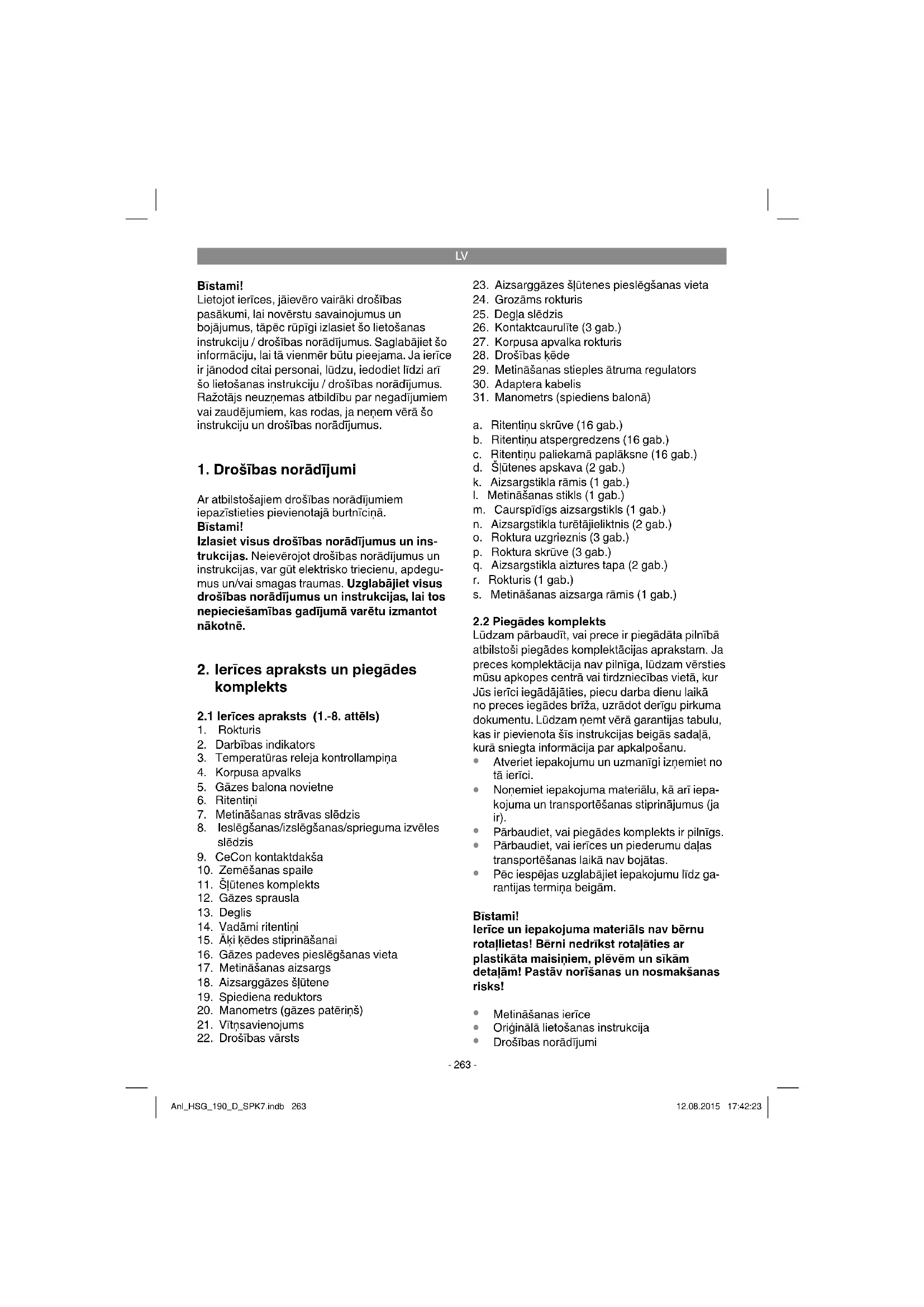 Tikai ES valstīm Neizmetiet elektroierīces sadzīves atkritumos! Saskaņā ar Eiropas direktīvu 2012/19/EK par nolietotajām elektriskajām un elektroniskajām ierīcēm un tās transponēšanu nacionālajā likumdošanā nolietotās elektroierīces ir jāsavāc atsevišķi un jānodod atkārtotai izmantošanai atbilstoši apkārtējās vides prasībām. Otrreizējā izmantošana kā alternatīva atpakaļnosūtīšanas prasībai: Tā vietā, lai nosūtītu atpakaļ nolietoto elektroierīci, tās īpašniekam kā alternatīva ir uzlikts pienākums sadarboties pienācīgas izmantošanas ietvaros īpašuma tiesību nodošanas gadījumā. Nolietoto ierīci šajā gadījumā var nodot arī atpakaļpieņemšanas uzņēmumā, kas veic tās likvidēšanu atbilstoši nacionālajam likumam par cirkulācijas saimniecību un atkritumiem. Tas neattiecas uz nolietotajām ierīcēm pievienoto piederumu detaļām un palīglīdzekļiem bez elektriskajām sastāvdaļām. Ražojuma dokumentācijas un pavaddokumentu pārdrukāšana vai citāda izplatīšana, arī fragmentāri ir atļauta tikai ar skaidru iSC GmbH piekrišanu. Paturētas tiesības veikt tehniskas izmaiņas Anl_HSG_190_D_SPK7.indb 271Anl_HSG_190_D_SPK7.indb 271 12.08.2015 17:42:2312.08.2015 17:42:23LV