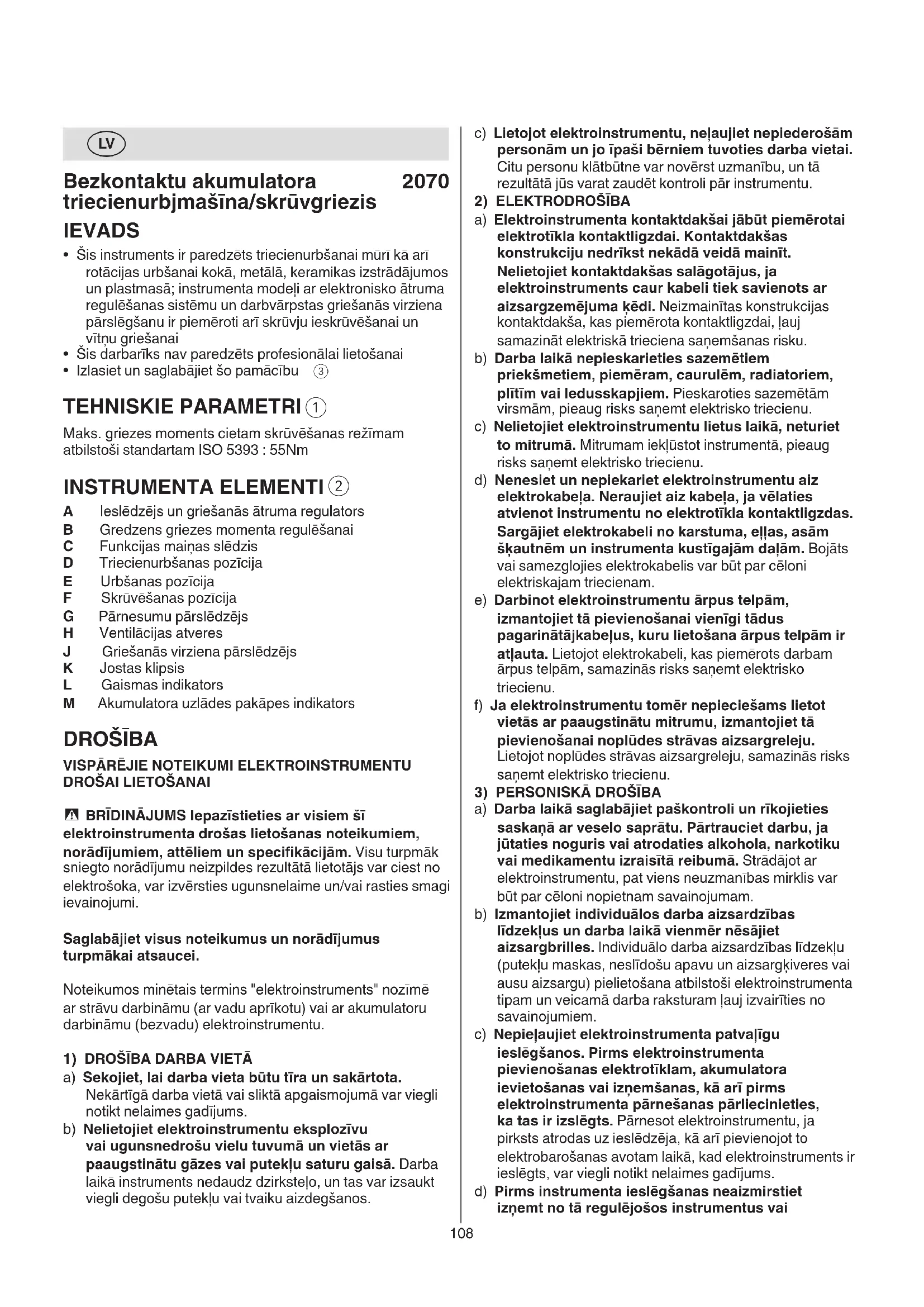 A Ieslēdzējs un griešanās ātruma regulators B Gredzens griezes momenta regulēšanai C Funkcijas maiņas slēdzis D Triecienurbšanas pozīcija E Urbšanas pozīcija F Skrūvēšanas pozīcija G Pārnesumu pārslēdzējs H Ventilācijas atveres J Griešanās virziena pārslēdzējs K Jostas klipsis L Gaismas indikators M Akumulatora uzlādes pakāpes indikators DROŠĪBA