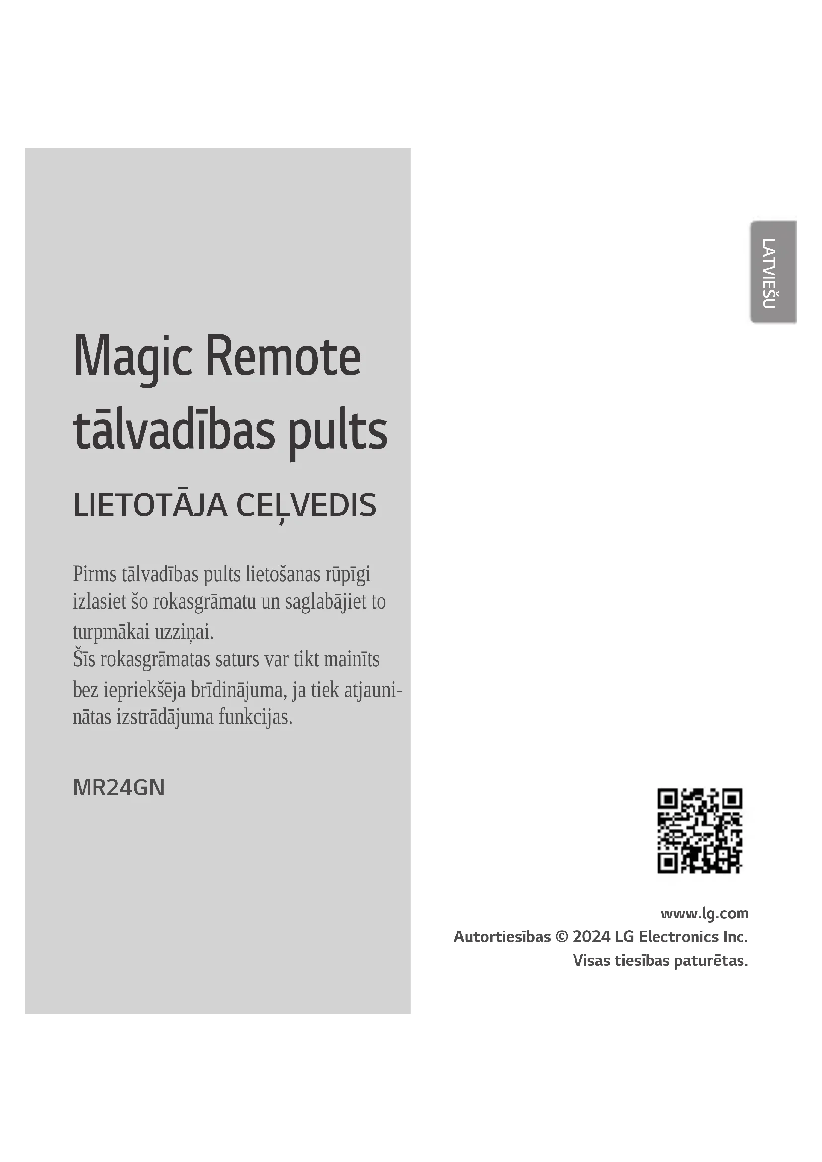 Pirms tālvadības pults lietošanas rūpīgi izlasiet šo rokasgrāmatu un saglabājiet to turpmākai uzziņai. Šīs rokasgrāmatas saturs var tikt mainīts bez iepriekšēja brīdinājuma, ja tiek atjauni- nātas izstrādājuma funkcijas. MR24GN www.lg.com Autortiesības © 2024 LG Electronics Inc. Visas tiesības paturētas. LATVIEŠU2 Pirms iepazīšanās ar šo rokasgrāmatu