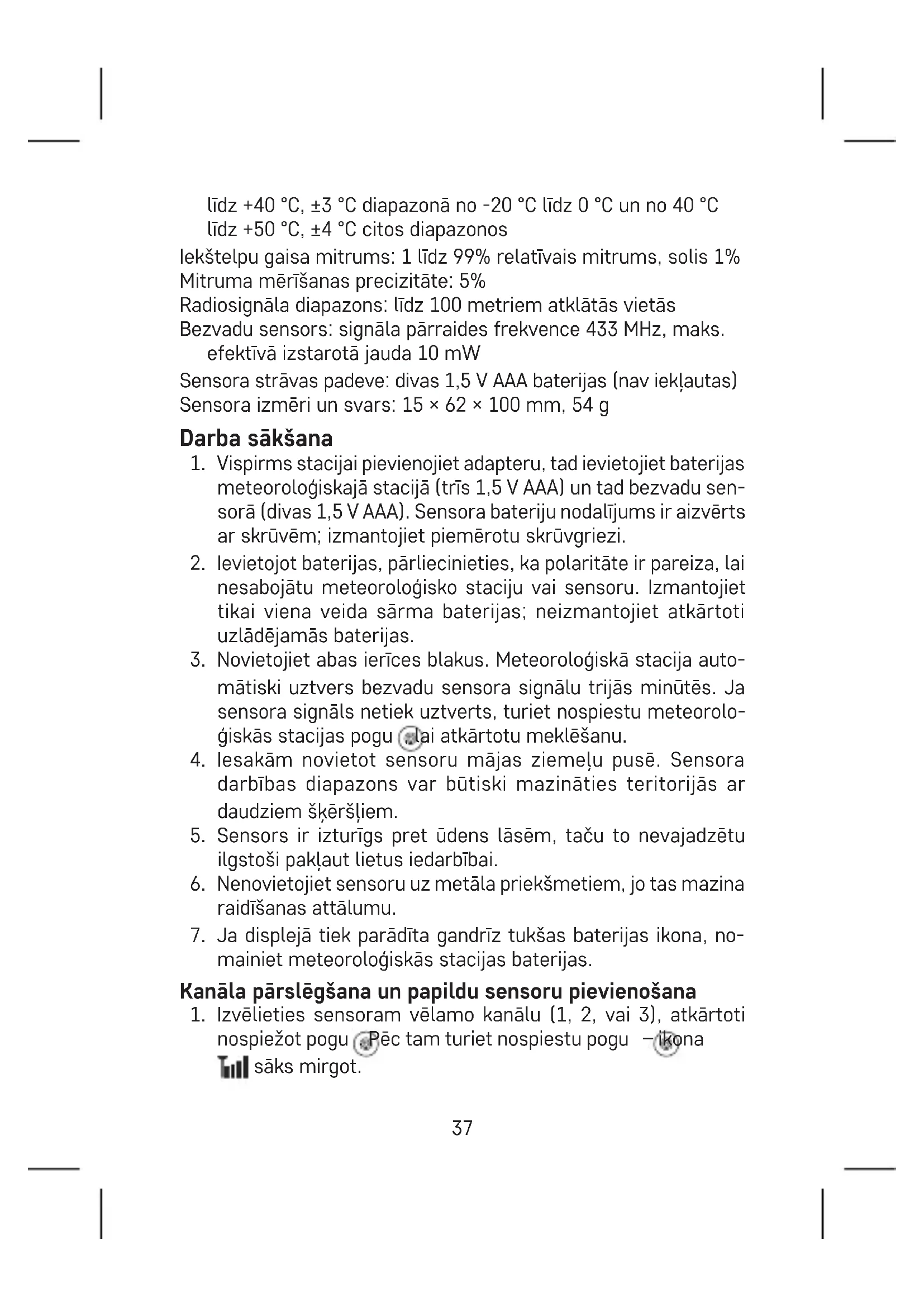 mātiski uztvers bezvadu sensora signālu trijās minūtēs. Ja sensora signāls netiek uztverts, turiet nospiestu meteorolo- ģiskās stacijas pogu , lai atkārtotu meklēšanu.