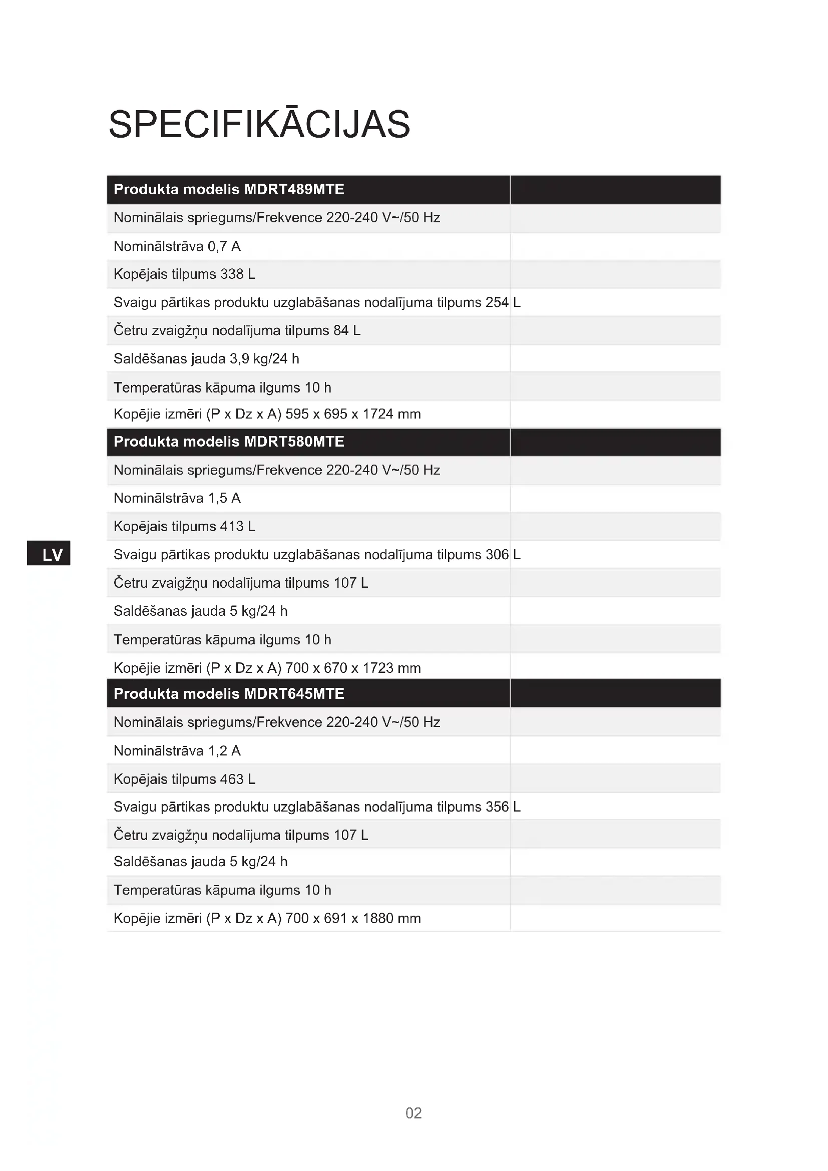 SPECIFIKĀCIJAS Produkta modelis MDRT580MTE Nominālais spriegums/Frekvence 220-240 V~/50 Hz Nominālstrāva 1,5 A Kopējais tilpums 413 L Svaigu pārtikas produktu uzglabāšanas nodalījuma tilpums 306 L Četru zvaigžņu nodalījuma tilpums 107 L Saldēšanas jauda 5 kg/24 h Temperatūras kāpuma ilgums 10 h Kopējie izmēri (P x Dz x A) 700 x 670 x 1723 mm Produkta modelis MDRT645MTE Nominālais spriegums/Frekvence 220-240 V~/50 Hz Nominālstrāva 1,2 A Kopējais tilpums 463 L Svaigu pārtikas produktu uzglabāšanas nodalījuma tilpums 356 L Četru zvaigžņu nodalījuma tilpums 107 L Saldēšanas jauda 5 kg/24 h Temperatūras kāpuma ilgums 10 h Kopējie izmēri (P x Dz x A) 700 x 691 x 1880 mm Produkta modelis MDRT489MTE Nominālais spriegums/Frekvence 220-240 V~/50 Hz Nominālstrāva 0,7 A Kopējais tilpums 338 L Svaigu pārtikas produktu uzglabāšanas nodalījuma tilpums 254 L Četru zvaigžņu nodalījuma tilpums 84 L Saldēšanas jauda 3,9 kg/24 h Temperatūras kāpuma ilgums 10 h Kopējie izmēri (P x Dz x A) 595 x 695 x 1724 mm03