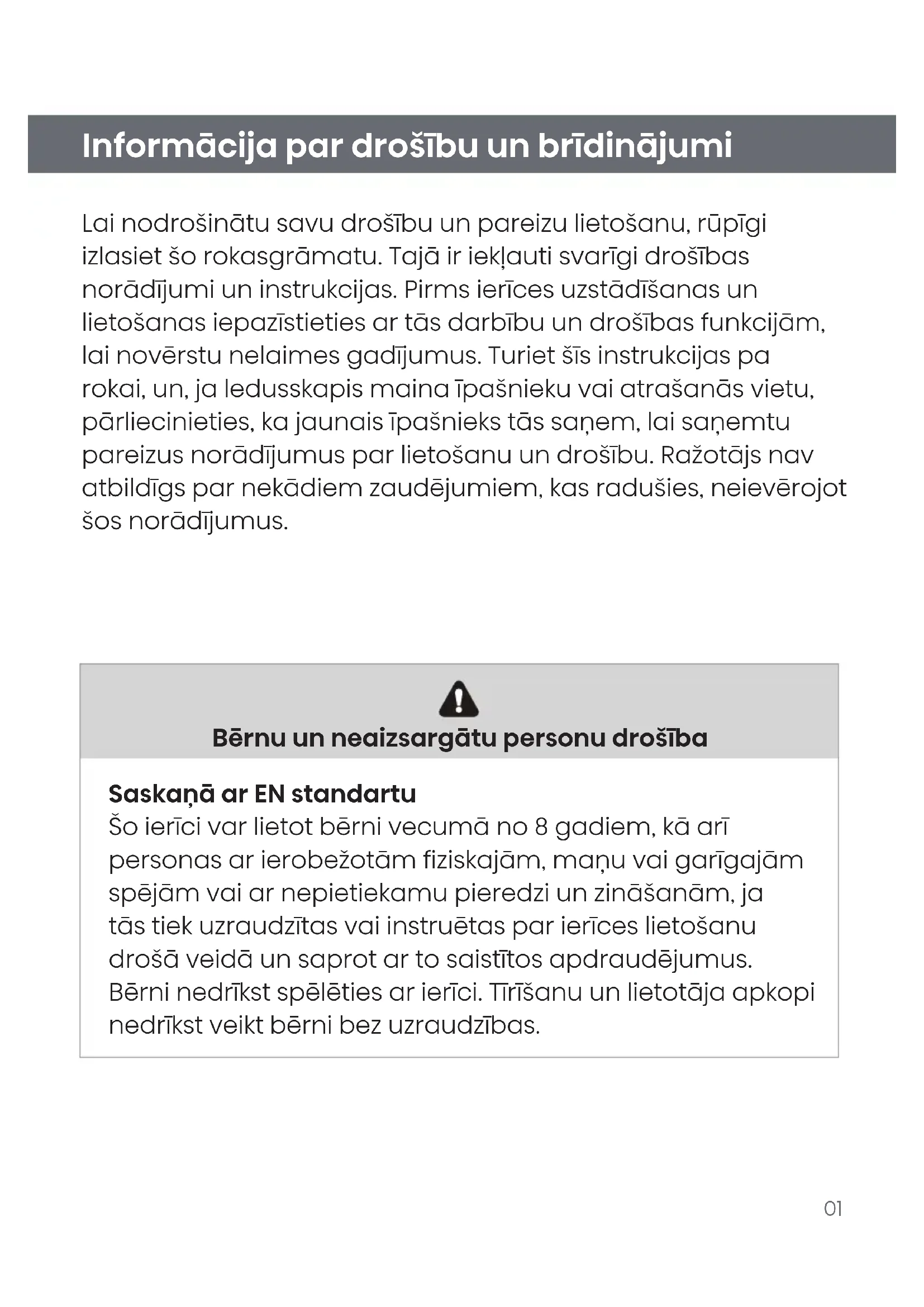 - Ierīces utilizācija Informācija par drošību un brīdinājumi Lai nodrošinātu savu drošību un pareizu lietošanu, rūpīgi izlasiet šo rokasgrāmatu. Tajā ir iekļauti svarīgi drošības norādījumi un instrukcijas. Pirms ierīces uzstādīšanas un lietošanas iepazīstieties ar tās darbību un drošības funkcijām, lai novērstu nelaimes gadījumus. Turiet šīs instrukcijas pa rokai, un, ja ledusskapis maina īpašnieku vai atrašanās vietu, pārliecinieties, ka jaunais īpašnieks tās saņem, lai saņemtu pareizus norādījumus par lietošanu un drošību. Ražotājs nav atbildīgs par nekādiem zaudējumiem, kas radušies, neievērojot šos norādījumus. Bērnu un neaizsargātu personu drošība Saskaņā ar EN standartu Šo ierīci var lietot bērni vecumā no 8 gadiem, kā arī personas ar ierobežotām fiziskajām, maņu vai garīgajām spējām vai ar nepietiekamu pieredzi un zināšanām, ja tās tiek uzraudzītas vai instruētas par ierīces lietošanu drošā veidā un saprot ar to saistītos apdraudējumus. Bērni nedrīkst spēlēties ar ierīci. Tīrīšanu un lietotāja apkopi nedrīkst veikt bērni bez uzraudzības.02 Bērnu un neaizsargātu personu drošība Saskaņā ar IEC standartu Ierīci nav paredzēts lietot personām (tostarp bērniem) ar fiziskiem vai garīgiem traucējumiem vai personām, kurām trūkst pieredzes un zināšanu, ja vien par viņu drošību atbildīgā persona nav nodrošinājusi uzraudzību vai sniegusi norādījumus par ierīces lietošanu. Lai novērstu nosmakšanas risku, visus iepakojuma materiālus novietojiet bērniem nepieejamā vietā. Atbrīvojoties no ierīces, atvienojiet to no tīkla, nogrieziet barošanas vadu ierīces tuvumā un noņemiet durvis, lai novērstu elektriskās strāvas trieciena vai iesprūšanas risku, bērniem spēlējoties. Nomainot vecāku ierīci, nodrošiniet, ka vecās ierīces aizslēgs vai atsperes slēdzene, ja tāda ir, tiek atvienota, lai novērstu nejaušu iesprūšanu. Informācija par drošību un brīdinājumi03 Informācija par drošību un brīdinājumi Vispārējā drošība p. 3501