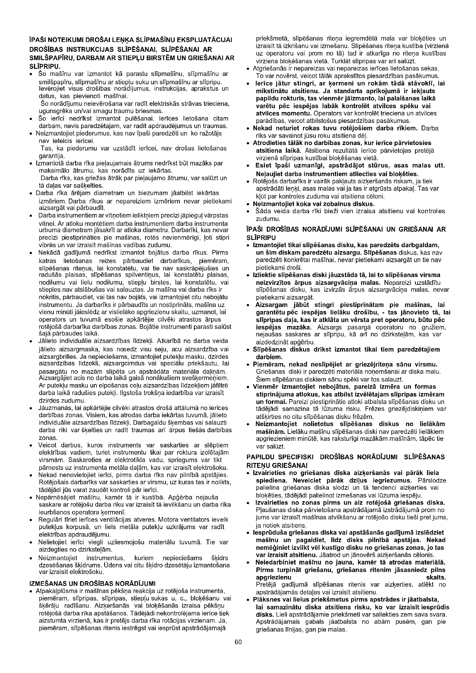 - Neizmantojiet nolietotus slīpēšanas diskus no lielākām mašīnām. Lielāku mašīnu slīpēšanas diski nav paredzēti lielākiem apgriezieniem minūtē, kas raksturīgi mazākām mašīnām, tāpēc tie var salūzt. PAPILDU SPECIFISKI DROŠĪBAS NORĀDĪJUMI SLĪPĒŠANAS