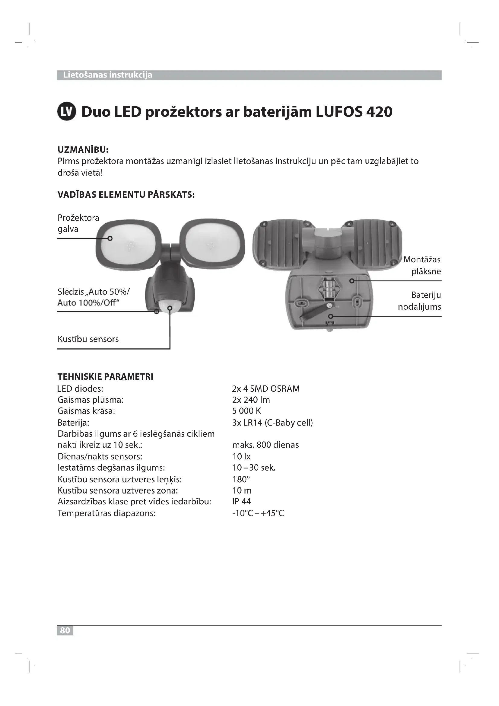 Ar slēdzi “AUTO 50%/AUTO 100%/OFF” var izvēlēties 50% vai 100% gaismu vai izslēgt to pavisam (8. att.). Šādā veidā var pagarināt baterijas kalpošanas laiku no 400 dienām (100% gaisma) līdz 800 dienām (50% gaisma). Prožektors ir aprīkots ar dienas/nakts sensoru un infrasarkano sensoru. Dienas/nakts sensors aktivizē prožektoru. Prožektors ieslēdzas automātiski, kad infrasarkanais sensors apkārtnē ir uztvēris kustības. Centieties nevērst kustību sensoru uz peldbaseinu, karstā gaisa nosūcēju izvadiem, kondicionēšanas iekārtām vai objektiem, kas pakļauti krasām temperatūras svārstībām. Izvai- rieties orientēt kustību sensoru uz kokiem un krūmiem vai vietām , kur varētu bieži uzturēties mājdzīvnieki. Kustību sensoru var horizontāli pagriezt uz labo vai kreiso pusi un šādi mainīt uztveres zonu. Piestiprinot prožektoru, ņemiet vērā, ka kustību sensors visjutīgāk reaģē uz kustībām, kas šķē rso sensora uztveres lauku, bet vismazāk sajūt kustības, kas taisnā virzienā tuvojas ierīcei. Kustību sensoram var iestatīt ieslēgta stāvokļa laiku (7. att.). Šai nolūkā pagrieziet kustību sensora galviņu tiktāl, līdz kļūst redzams iestatī šanas regulators. Ar šo regulatoru jūs varat izvēlēties jebkādu ieslēgta stāvokļa ilgumu robežās no 10 līdz 30sekundēm pēc tam, kad ir uztverta pēdējā kustība. Griežot TIME regulatoru pulksteņrādītāju kustības virzienā, ilgums pieaug, bet pretējā virzienā - samazinās. Kad lampa sāk mirgot, jānomaina baterijas. Nedaudz izskrūvējiet stiprinājuma skrūvi (9.1 att.). Nospiediet atbloķēšanas pogu (9.2 att.) un noņemiet prožektoru no montāžas plāksnes (9.3 att.). Ar “izņemšanas lentes” palīdzību izņemiet no bateriju nodalījuma baterijas (10. att.). Bateriju nodalījumā ievietojiet jaunās baterijas. Pirms tam ielieciet zem baterijām “izņemšanas lenti”. Bateriju nodalījumā ir parādīta pareizā bateriju polaritāte (11. att.). Nospiediet atbloķēšanas pogu (12.1 att.) un uzspiediet prožektoru uz pieskrūvētās montāžas plāksnes (12.2 att.). Cieši pievelciet stiprinājuma skrūvi (12.3 att.). APKOPE
