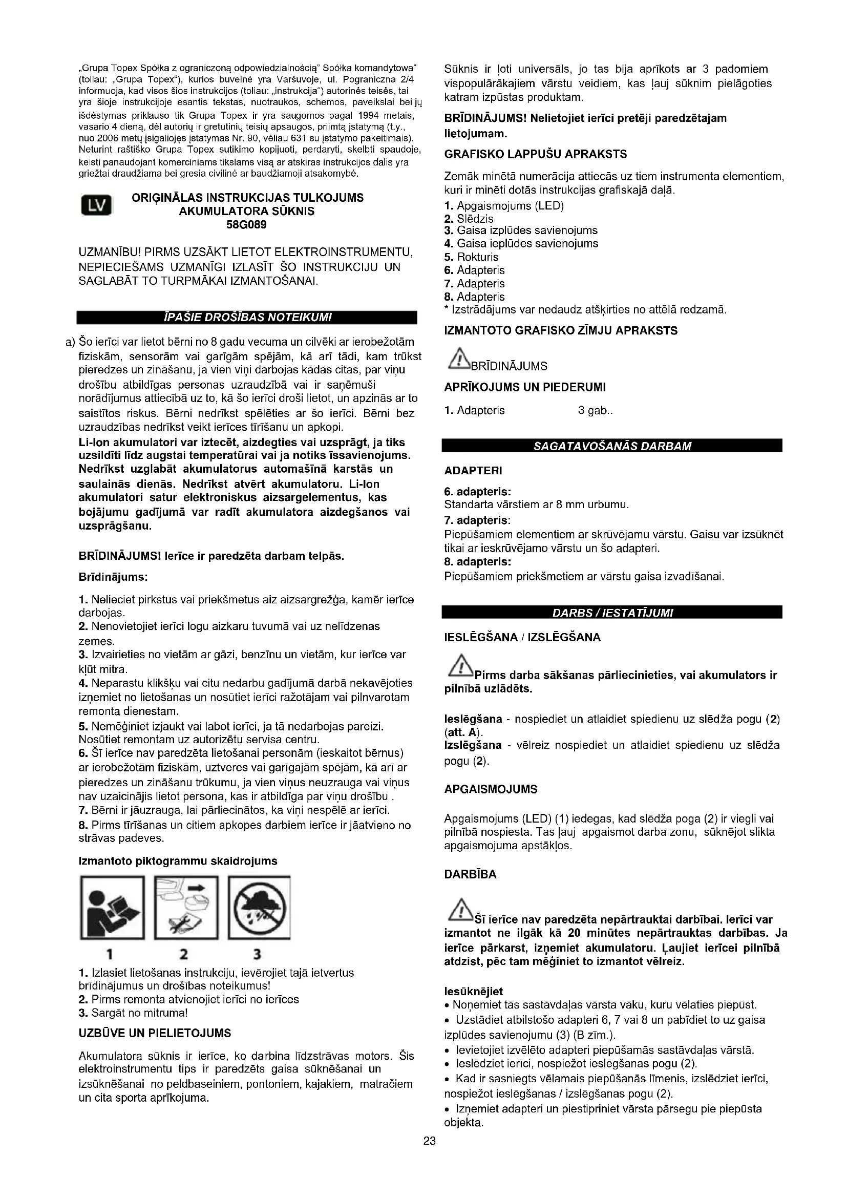 Akumulatora sūknis ir ierīce, ko darbina līdzstrāvas motors. Šis elektroinstrumentu tips ir paredzēts gaisa sūknēšanai un izsūknēšanai no peldbaseiniem, pontoniem, kajakiem, matračiem un cita sporta aprīkojuma. Sūknis ir ļoti universāls, jo tas bija aprīkots ar 3 padomiem vispopulārākajiem vārstu veidiem, kas ļauj sūknim pielāgoties katram izpūstas produktam. BRĪDINĀJUMS! Nelietojiet ierīci pretēji paredzētajam lietojumam.