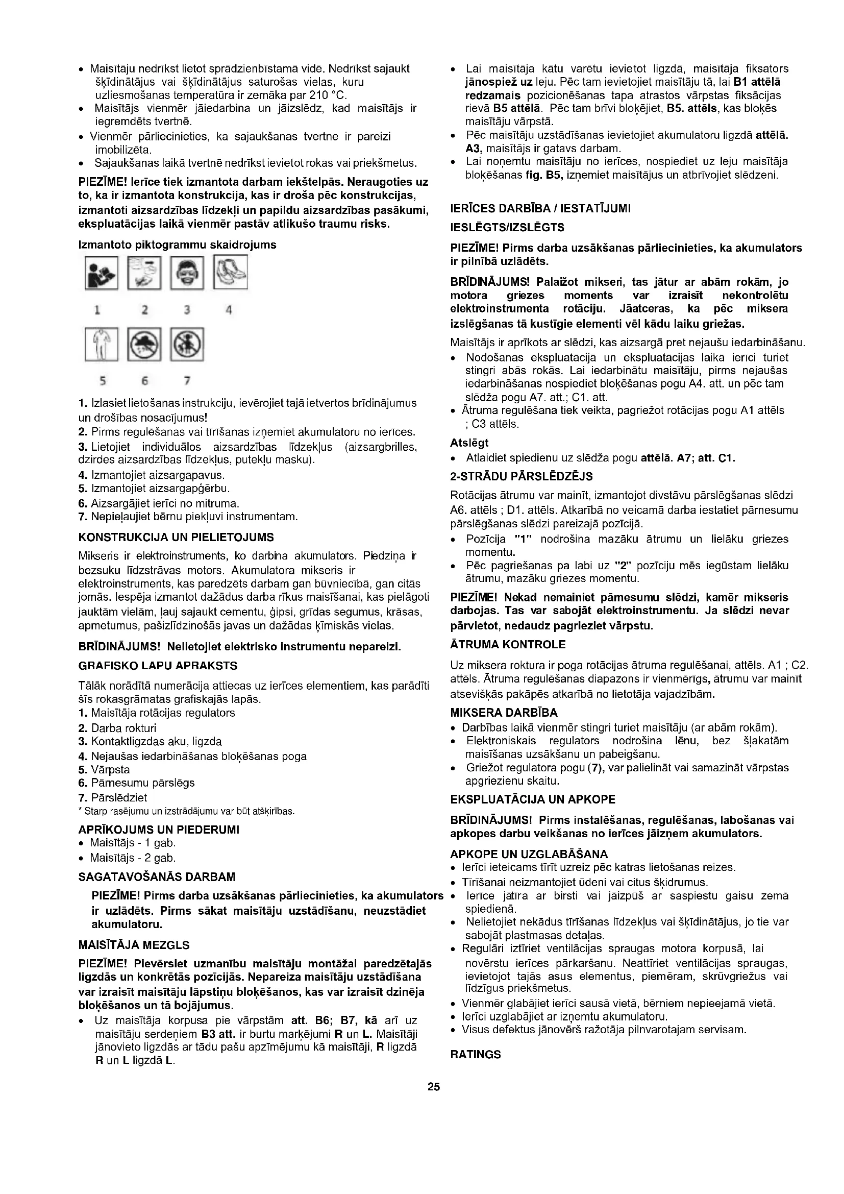 PIEZĪME! Pirms darba uzsākšanas pārliecinieties, ka akumulators ir pilnībā uzlādēts. BRĪDINĀJUMS! Palaižot mikseri, tas jātur ar abām rokām, jo motora griezes moments var izraisīt nekontrolētu elektroinstrumenta rotāciju. Jāatceras, ka pēc miksera izslēgšanas tā kustīgie elementi vēl kādu laiku griežas. Maisītājs ir aprīkots ar slēdzi, kas aizsargā pret nejaušu iedarbināšanu.