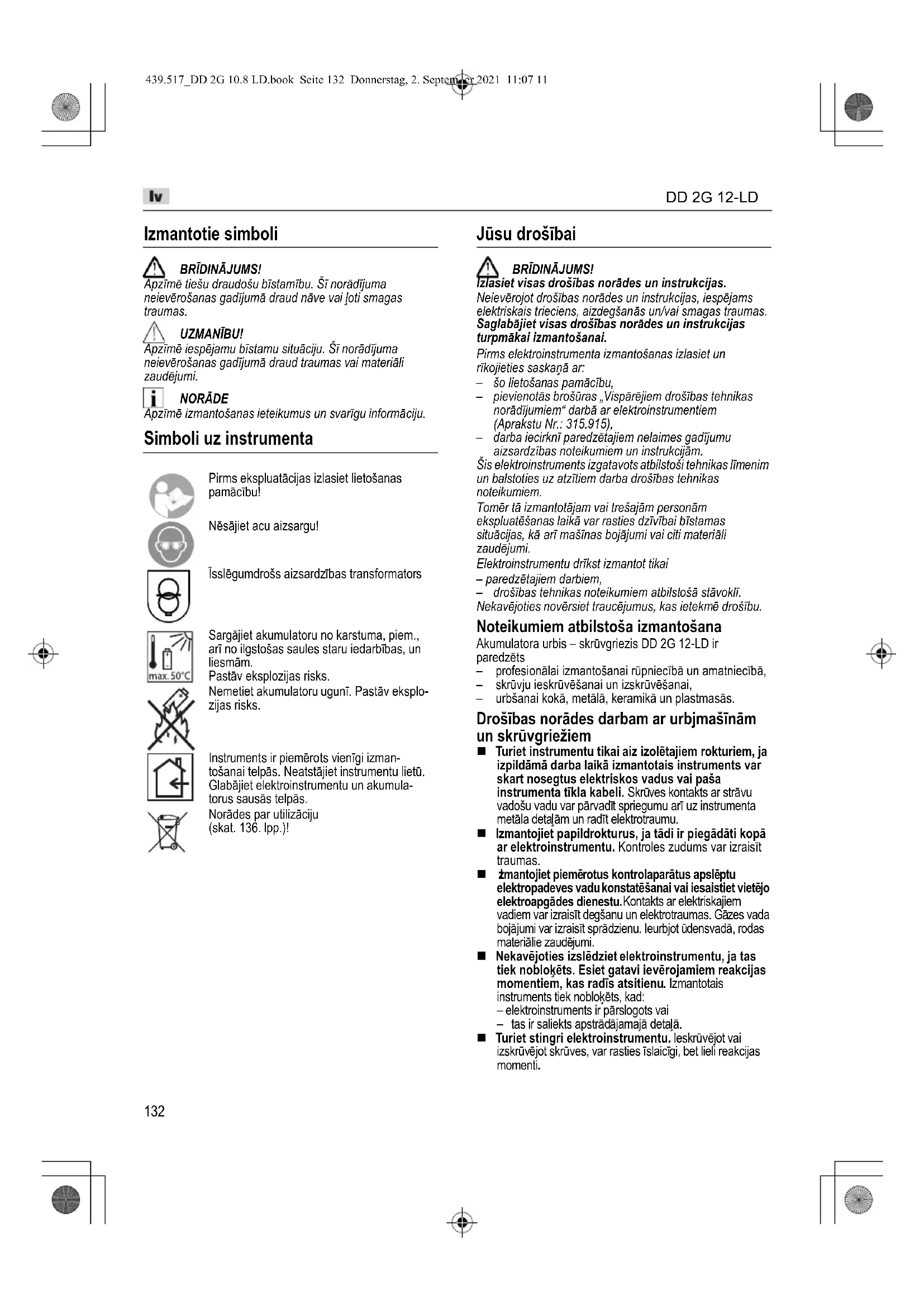 Izmantotie simboli BRĪDINĀJUMS! Apzīmē tiešu draudošu bīstamību. Šī norādījuma neievērošanas gadījumā draud nāve vai ļoti smagas traumas. UZMANĪBU! Apzīmē iespējamu bīstamu situāciju. Šī norādījuma neievērošanas gadījumā draud traumas vai materiāli zaudējumi. NORĀDE Apzīmē izmantošanas ieteikumus un svarīgu informāciju. Simboli uz instrumenta Jūsu drošībai BRĪDINĀJUMS! Izlasiet visas drošības norādes un instrukcijas. Neievērojot drošības norādes un instrukcijas, iespējams elektriskais trieciens, aizdegšanās un/vai smagas traumas. Saglabājiet visas drošības norādes un instrukcijas turpmākai izmantošanai. Pirms elektroinstrumenta izmantošanas izlasiet un rīkojieties saskaņā ar: – šo lietošanas pamācību, – pievienotās brošūras „Vispārējiem drošības tehnikas norādījumiem“ darbā ar elektroinstrumentiem (Aprakstu Nr.: 315.915), – darba iecirknī paredzētajiem nelaimes gadījumu aizsardzības noteikumiem un instrukcijām. Šis elektroinstruments izgatavots atbilstoši tehnikas līmenim un balstoties uz atzītiem darba drošības tehnikas noteikumiem. Tomēr tā izmantotājam vai trešajām personām ekspluatēšanas laikā var rasties dzīvībai bīstamas situācijas, kā arī mašīnas bojājumi vai citi materiāli zaudējumi. Elektroinstrumentu drīkst izmantot tikai – paredzētajiem darbiem, – drošības tehnikas noteikumiem atbilstošā stāvoklī. Nekavējoties novērsiet traucējumus, kas ietekmē drošību. Noteikumiem atbilstoša izmantošana Akumulatora urbis – skrūvgriezis DD 2G 12-LD ir paredzēts –profesionālai izmantošanai rūpniecībā un amatniecībā, –skrūvju ieskrūvēšanai un izskrūvēšanai, – urbšanai kokā, metālā, keramikā un plastmasās. Drošības norādes darbam ar urbjmašīnām un skrūvgriežiem Turiet instrumentu tikai aiz izolētajiem rokturiem, ja izpildāmā darba laikā izmantotais instruments var skart nosegtus elektriskos vadus vai paša instrumenta tīkla kabeli. Skrūves kontakts ar strāvu vadošu vadu var pārvadīt spriegumu arī uz instrumenta metāla detaļām un radīt elektrotraumu. Izmantojiet papildrokturus, ja tādi ir piegādāti kopā ar elektroinstrumentu. Kontroles zudums var izraisīt traumas.