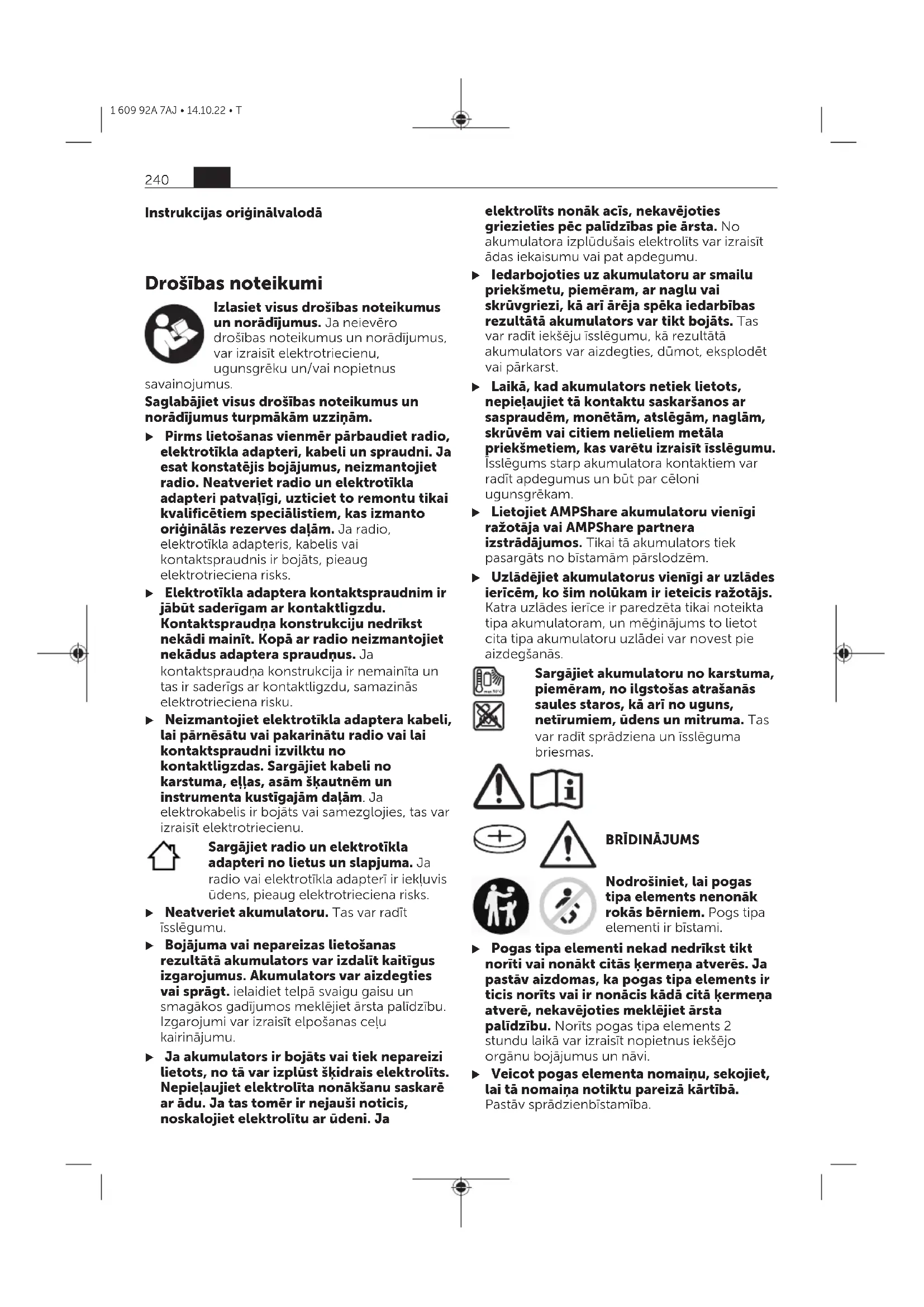 Nodrošiniet, lai pogas tipa elements nenonāk rokās bērniem. Pogs tipa elementi ir bīstami. u Pogas tipa elementi nekad nedrīkst tikt norīti vai nonākt citās ķermeņa atverēs. Ja pastāv aizdomas, ka pogas tipa elements ir ticis norīts vai ir nonācis kādā citā ķermeņa atverē, nekavējoties meklējiet ārsta palīdzību. Norīts pogas tipa elements 2 stundu laikā var izraisīt nopietnus iekšējo orgānu bojājumus un nāvi. u Veicot pogas elementa nomaiņu, sekojiet, lai tā nomaiņa notiktu pareizā kārtībā. Pastāv sprādzienbīstamība. 240 lv 1 609 92A 7AJ • 14.10.22 • Tu Lietojiet vienīgi šajā lietošanas pamācībā norādītās pogas tipa baterijas. Nelietojiet citas pogas tipa baterijas vai citus barošanas avotus. u Nemēģiniet atkārtoti uzlādēt pogas tipa elementu un nepieļaujiet īsslēguma veidošanos starp tā izvadiem. Pogas tipa elements var zaudēt hermētiskumu, sprāgt, aizdegties un savainot cilvēkus. u Nolietotos pogas tipa elementus izņemiet un utilizējiet atbilstoši spēkā esošajiem noteikumiem. Nolietotie pogas tipa elementi var zaudēt hermētiskumu un šī iemesla dēļ bojāt izstrādājumu vai savainot cilvēkus. u Nepārkarsējiet pogas tipa elementu un nemetiet to ugunī. Pogas tipa elements var zaudēt hermētiskumu, sprāgt, aizdegties un savainot cilvēkus. u Nebojājiet un neizjauciet pogas tipa elementu. Pogas tipa elements var zaudēt hermētiskumu, sprāgt, aizdegties un savainot cilvēkus. u Neļaujiet bojātajam pogas tipa elementam nonākt saskarē ar ūdeni. Izplūdušajam litijam saskaroties ar ūdeni, var veidoties ūdeņradis, kas var izraisīt aizdegšanos, sprādzienu vai savainot cilvēkus. Vārdiska preču zīme Bluetooth ®, kā arī grafiskie apzīmējumi (logotipi), ir Bluetooth SIG Inc. reģistrētās preču zīmes un īpašums. Ikkatras šīs vārdiskās preču zīmes/grafiskā apzīmējuma izmantošanas C. & E. Fein GmbHpamatā ir licence. Izstrādājuma un tā funkciju aprakstsLatviešu Ņemiet vērā attēlus lietošanas pamācības sākuma daļā. Attēlotās sastāvdaļasLatviešu Attēloto sastāvdaļu numerācija sakrīt ar numuriem radio attēlā, kas sniegts grafiskajā lappusē. (1) Displejs (2) Ieslēgšanas/izslēgšanas poga (3) Skaļrunis (4) Rokturis pārnešanai (5) Radiostaciju fiksētās noskaņošanas taustiņi (6) Statņa antena (7) Avota poga (8) Skaņas izslēgšanas taustiņš (9) Taustiņš meklēšanai uz augšu (10) Taustiņš meklēšanai uz leju (11) Bluetooth ® taustiņš (12) Akumulatora pārsegs (13) Akumulatora pārsega fiksācijas svira (14) Akumulatora turētājs (15) Pieslēgumu nodalījums (16) Akumulatora atbrīvošanas taustiņš