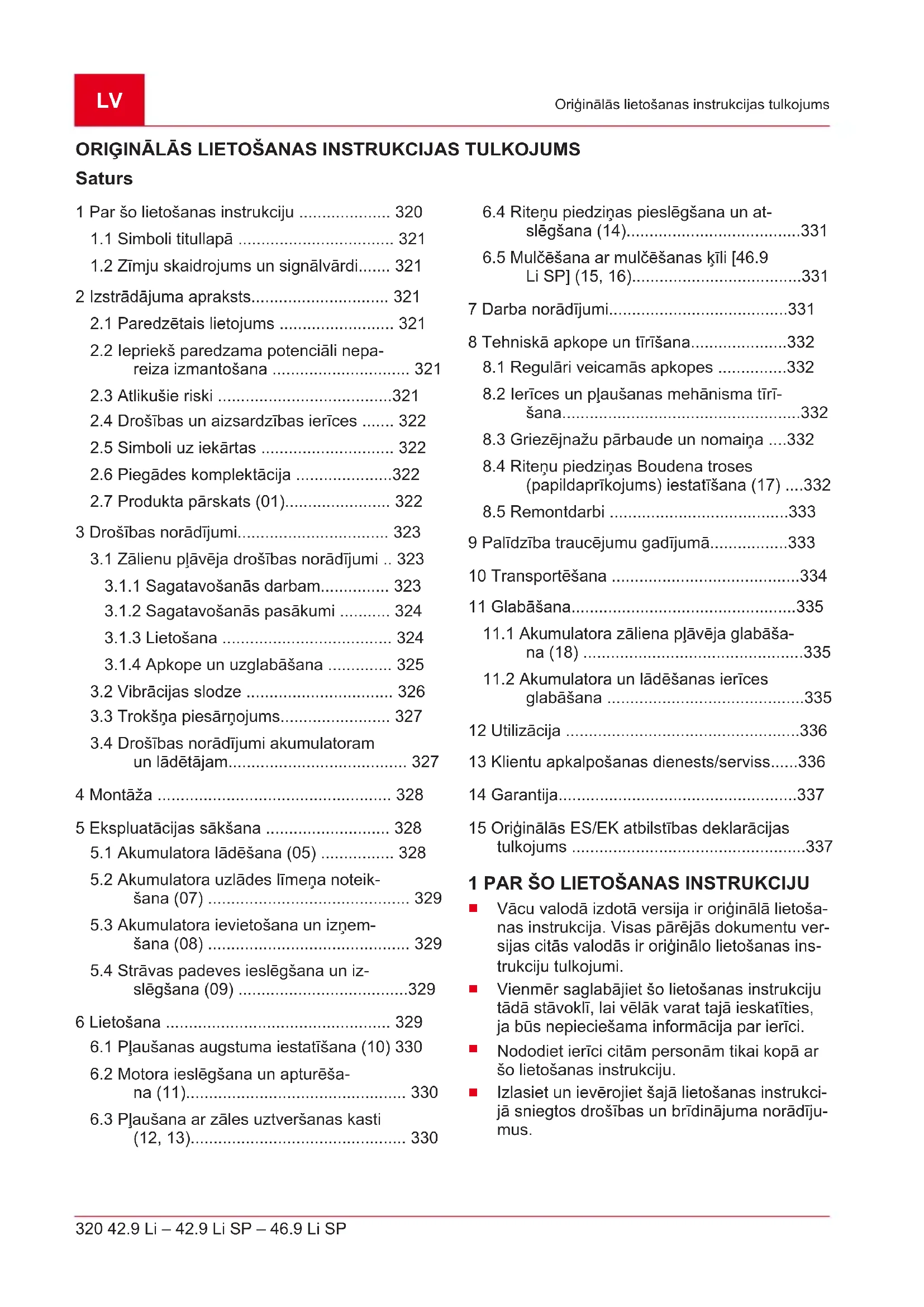94,2dB(A) / 96dB(A)LV 320 42.9 Li – 42.9 Li SP – 46.9 Li SP Oriģinālās lietošanas instrukcijas tulkojums ORIĢINĀLĀS LIETOŠANAS INSTRUKCIJAS TULKOJUMS Saturs 1 Par šo lietošanas instrukciju .................... 320