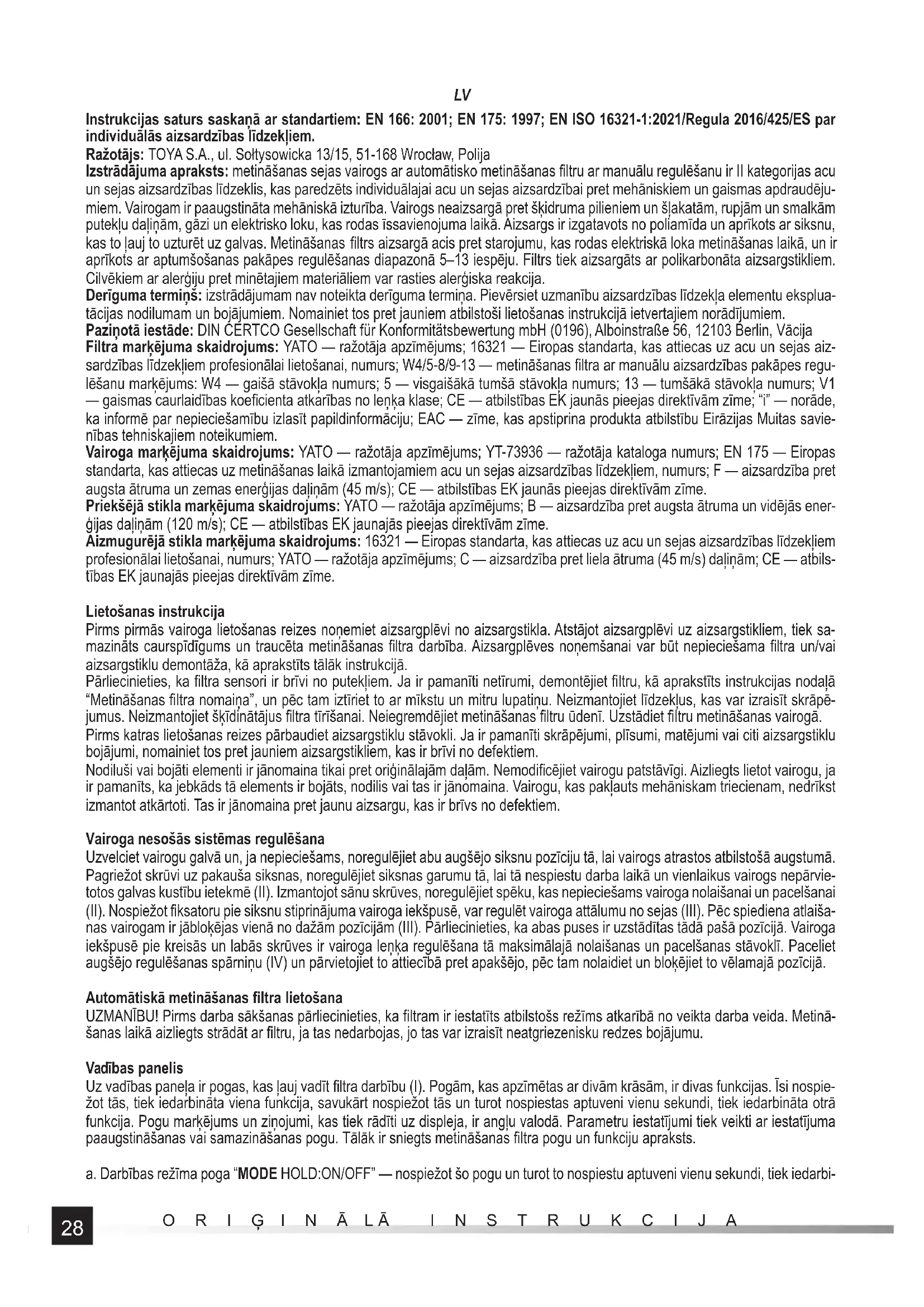 Instrukcijas saturs saskaņā ar standartiem: EN 166: 2001; EN 175: 1997; EN ISO 16321-1:2021/Regula 2016/425/ES par individuālās aizsardzības līdzekļiem. Ražotājs: TOYA S.A., ul. Sołtysowicka 13/15, 51-168 Wrocław, Polija Izstrādājuma apraksts: metināšanas sejas vairogs ar automātisko metināšanas fi ltru ar manuālu regulēšanu ir II kategorijas acu un sejas aizsardzības līdzeklis, kas paredzēts individuālajai acu un sejas aizsardzībai pret mehāniskiem un gaismas apdraudēju- miem. Vairogam ir paaugstināta mehāniskā izturība. Vairogs neaizsargā pret šķidruma pilieniem un šļakatām, rupjām un smalkām putekļu daļiņām, gāzi un elektrisko loku, kas rodas īssavienojuma laikā. Aizsargs ir izgatavots no poliamīda un aprīkots ar siksnu, kas to ļauj to uzturēt uz galvas. Metināšanas fi ltrs aizsargā acis pret starojumu, kas rodas elektriskā loka metināšanas laikā, un ir aprīkots ar aptumšošanas pakāpes regulēšanas diapazonā 5–13 iespēju. Filtrs tiek aizsargāts ar polikarbonāta aizsargstikliem. Cilvēkiem ar alerģiju pret minētajiem materiāliem var rasties alerģiska reakcija. Derīguma termiņš: izstrādājumam nav noteikta derīguma termiņa. Pievērsiet uzmanību aizsardzības līdzekļa elementu eksplua- tācijas nodilumam un bojājumiem. Nomainiet tos pret jauniem atbilstoši lietošanas instrukcijā ietvertajiem norādījumiem. Paziņotā iestāde: DIN CERTCO Gesellschaft für Konformitätsbewertung mbH (0196), Alboinstraße 56, 12103 Berlin, Vācija Filtra marķējuma skaidrojums: YATO — ražotāja apzīmējums; 16321 — Eiropas standarta, kas attiecas uz acu un sejas aiz- sardzības līdzekļiem profesionālai lietošanai, numurs; W4/5-8/9-13 — metināšanas fi ltra ar manuālu aizsardzības pakāpes regu- lēšanu marķējums: W4 — gaišā stāvokļa numurs; 5 — visgaišākā tumšā stāvokļa numurs; 13 — tumšākā stāvokļa numurs; V1 — gaismas caurlaidības koefi cienta atkarības no leņķa klase; CE — atbilstības EK jaunās pieejas direktīvām zīme; “i” — norāde, ka informē par nepieciešamību izlasīt papildinformāciju; EAC — zīme, kas apstiprina produkta atbilstību Eirāzijas Muitas savie- nības tehniskajiem noteikumiem. Vairoga marķējuma skaidrojums: YATO — ražotāja apzīmējums; YT-73936 — ražotāja kataloga numurs; EN 175 — Eiropas standarta, kas attiecas uz metināšanas laikā izmantojamiem acu un sejas aizsardzības līdzekļiem, numurs; F — aizsardzība pret augsta ātruma un zemas enerģijas daļiņām (45 m/s); CE — atbilstības EK jaunās pieejas direktīvām zīme. Priekšējā stikla marķējuma skaidrojums: YATO — ražotāja apzīmējums; B — aizsardzība pret augsta ātruma un vidējās ener- ģijas daļiņām (120 m/s); CE — atbilstības EK jaunajās pieejas direktīvām zīme. Aizmugurējā stikla marķējuma skaidrojums: 16321 — Eiropas standarta, kas attiecas uz acu un sejas aizsardzības līdzekļiem profesionālai lietošanai, numurs; YATO — ražotāja apzīmējums; C — aizsardzība pret liela ātruma (45 m/s) daļiņām; CE — atbils- tības EK jaunajās pieejas direktīvām zīme. Lietošanas instrukcija Pirms pirmās vairoga lietošanas reizes noņemiet aizsargplēvi no aizsargstikla. Atstājot aizsargplēvi uz aizsargstikliem, tiek sa- mazināts caurspīdīgums un traucēta metināšanas fi ltra darbība. Aizsargplēves noņemšanai var būt nepieciešama fi ltra un/vai aizsargstiklu demontāža, kā aprakstīts tālāk instrukcijā. Pārliecinieties, ka fi ltra sensori ir brīvi no putekļiem. Ja ir pamanīti netīrumi, demontējiet fi ltru, kā aprakstīts instrukcijas nodaļā “Metināšanas fi ltra nomaiņa”, un pēc tam iztīriet to ar mīkstu un mitru lupatiņu. Neizmantojiet līdzekļus, kas var izraisīt skrāpē- jumus. Neizmantojiet šķīdinātājus fi ltra tīrīšanai. Neiegremdējiet metināšanas fi ltru ūdenī. Uzstādiet fi ltru metināšanas vairogā. Pirms katras lietošanas reizes pārbaudiet aizsargstiklu stāvokli. Ja ir pamanīti skrāpējumi, plīsumi, matējumi vai citi aizsargstiklu bojājumi, nomainiet tos pret jauniem aizsargstikliem, kas ir brīvi no defektiem. Nodiluši vai bojāti elementi ir jānomaina tikai pret oriģinālajām daļām. Nemodifi cējiet vairogu patstāvīgi. Aizliegts lietot vairogu, ja ir pamanīts, ka jebkāds tā elements ir bojāts, nodilis vai tas ir jānomaina. Vairogu, kas pakļauts mehāniskam triecienam, nedrīkst izmantot atkārtoti. Tas ir jānomaina pret jaunu aizsargu, kas ir brīvs no defektiem. Vairoga nesošās sistēmas regulēšana Uzvelciet vairogu galvā un, ja nepieciešams, noregulējiet abu augšējo siksnu pozīciju tā, lai vairogs atrastos atbilstošā augstumā. Pagriežot skrūvi uz pakauša siksnas, noregulējiet siksnas garumu tā, lai tā nespiestu darba laikā un vienlaikus vairogs nepārvie- totos galvas kustību ietekmē (II). Izmantojot sānu skrūves, noregulējiet spēku, kas nepieciešams vairoga nolaišanai un pacelšanai (II). Nospiežot fi ksatoru pie siksnu stiprinājuma vairoga iekšpusē, var regulēt vairoga attālumu no sejas (III). Pēc spiediena atlaiša- nas vairogam ir jābloķējas vienā no dažām pozīcijām (III). Pārliecinieties, ka abas puses ir uzstādītas tādā pašā pozīcijā. Vairoga iekšpusē pie kreisās un labās skrūves ir vairoga leņķa regulēšana tā maksimālajā nolaišanas un pacelšanas stāvoklī. Paceliet augšējo regulēšanas spārniņu (IV) un pārvietojiet to attiecībā pret apakšējo, pēc tam nolaidiet un bloķējiet to vēlamajā pozīcijā. Automātiskā metināšanas fi ltra lietošana UZMANĪBU! Pirms darba sākšanas pārliecinieties, ka fi ltram ir iestatīts atbilstošs režīms atkarībā no veikta darba veida. Metinā- šanas laikā aizliegts strādāt ar fi ltru, ja tas nedarbojas, jo tas var izraisīt neatgriezenisku redzes bojājumu. Vadības panelis Uz vadības paneļa i