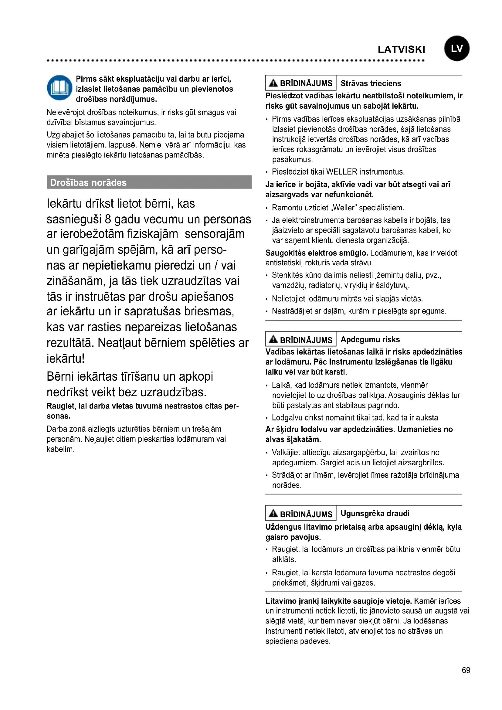LATVISKI70 Strāvas kabeli drīkst iespraust tikai tam paredzētās strāvas kontaktligzdās vai adapteros. Pārbaudiet,vaitīkla spriegumssaskanarnorādēmuzdatuplāksnītes. Pieslēdzietierīcipiekontaktligzdastikaitad,kadtāir izslēgta. Draudžiama laidą naudoti ne pagal paskirtį.Nenesiet ierīci,turotaizkabeļa.Netraukitekištukoiškištukiniolizdo, paėmęužlaido.Saugokitelaidąnuokarščio,alyvos, netraukiteperaštriuskraštus. Bkite atids. Rīkojietiesuzmanīgi.Darbusveicietrūpīgi. Nenaudokitelitavimoįrankio,kainegalitesusikoncentruoti. Stenkitės, kad kno padėtis btų tinkama. Jūsųdarbo vietaturibūtiergonomiška.Darbulaikāstrādājietpareizā pozīcijā,jopretējāgadījumāvarveidotiesnepareizastāja. Lodāmuru drīkst lietot tikai tad, ja tas ir tehniski nevainojamā stāvoklī.Aizliegtsdeaktivizētaizsargierīces. Nekavējoties novērsiet traucējumus un bojājumus. Pirms katrasiekārtas/instrumentalietošanasrūpīgijāpārbauda, vaiaizsardzībasierīcesdarbojasnevainojamiunatbilstoši paredzētajammērķim.Pārbaudiet,vaikustīgāsdaļas darbojasnevainojamiunneiesprūst,kāarīpārliecinieties, vaidaļasnavbojātas.Lainodrošinātutehniskinevainojamu ierīceslietošanu,visāmdaļāmirjābūtpareiziuzstādītāmun jāatbilstvisiemnosacījumiem. Izmantojiet pareizo instrumentu. Izmantojiet tikai piederu- musarakstānorādītusvairažotājaapstiprinātuspiederumus unpapildierīces.WELLERpiederumusvaipapildierīces izmantojiettikaikopāaroriģinālajāmWELLERierīcēm.Citu instrumentuunpiederumulietošanavarradītsavainojuma draudus. Nostipriniet instrumentu. Lainofiksēt sagatavi, izmantojietspriegotājierīces. Izmantojiet lodēšanas dmu atskšanas ierīci. Ja ir uzstādītaslodēšanasdūmuatsūkšanasierīčupieslēgšanai paredzētasiekārtas,pārliecinieties,kašīsierīcesir pieslēgtasuntiekpareizilietotas. Atbilstoša lietošana StrāvaspadevesierīceWELLERlodāmuriem.Izmantojiet lodēšanasstacijutikaiatbilstīgilietošanaspamācībā norādītajammērķim–lodēšanai,ievērojotšeitnorādītos nosacījumus. Ierīcidrīkstizmantotvienīgiiekštelpāsunistabas temperatūrā.Sargājietierīcinomitrumauntiešiemsaules stariem.