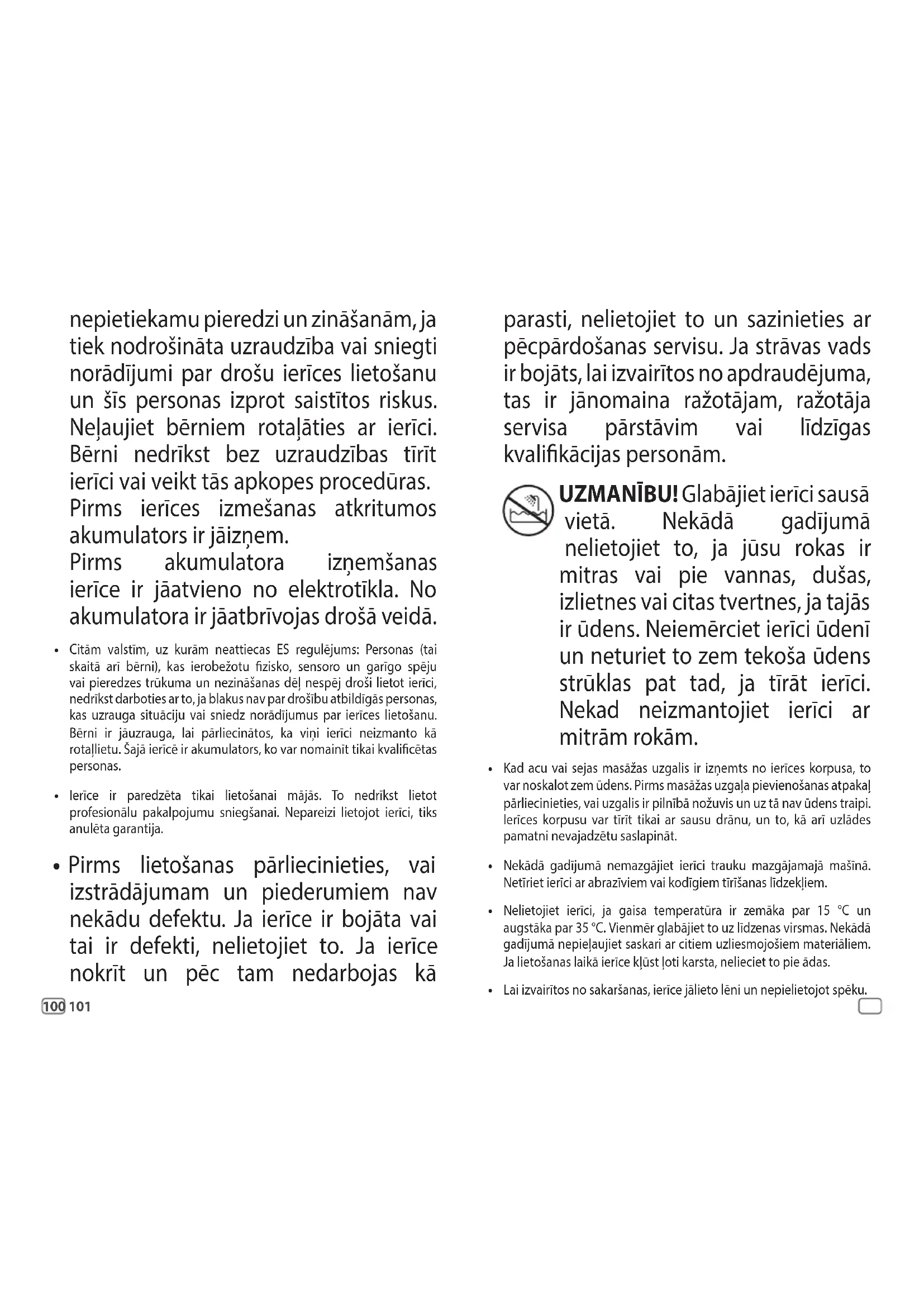 Valstīm, uz kurām attiecas ESregulējums (CE marķējums): Šo ierīci nedrīkst lietot bērni. Ierīci var izmantot personas ar ierobežotām ziskām, uztveres vai garīgām spējām, vai ar100 101 nepietiekamu pieredzi un zināšanām, ja tiek nodrošināta uzraudzība vai sniegti norādījumi par drošu ierīces lietošanu un šīs personas izprot saistītos riskus. Neļaujiet bērniem rotaļāties ar ierīci. Bērni nedrīkst bez uzraudzības tīrīt ierīci vai veikt tās apkopes procedūras. Pirms ierīces izmešanas atkritumos akumulators ir jāizņem. Pirms akumulatora izņemšanas ierīce ir jāatvieno no elektrotīkla. No akumulatora ir jāatbrīvojas drošā veidā.