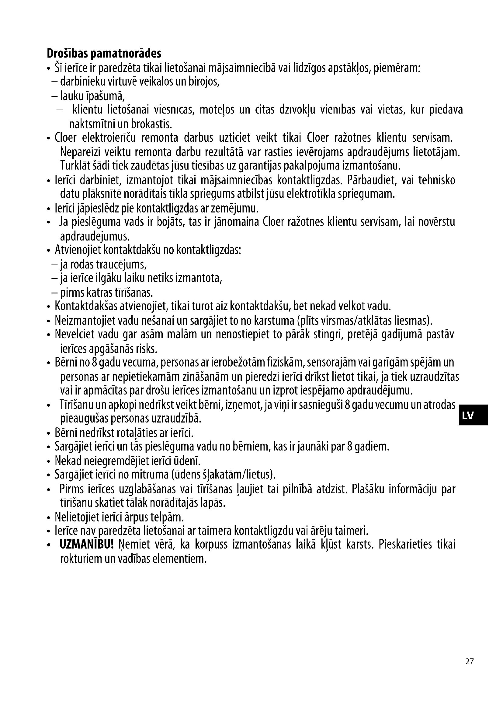- Bērni no 8 gadu vecuma, personas ar ierobežotām fiziskām, sensorajām vai garīgām spējām un personas ar nepietiekamām zināšanām un pieredzi ierīci drīkst lietot tikai, ja tiek uzraudzītas vai ir apmācītas par drošu ierīces izmantošanu un izprot iespējamo apdraudējumu.