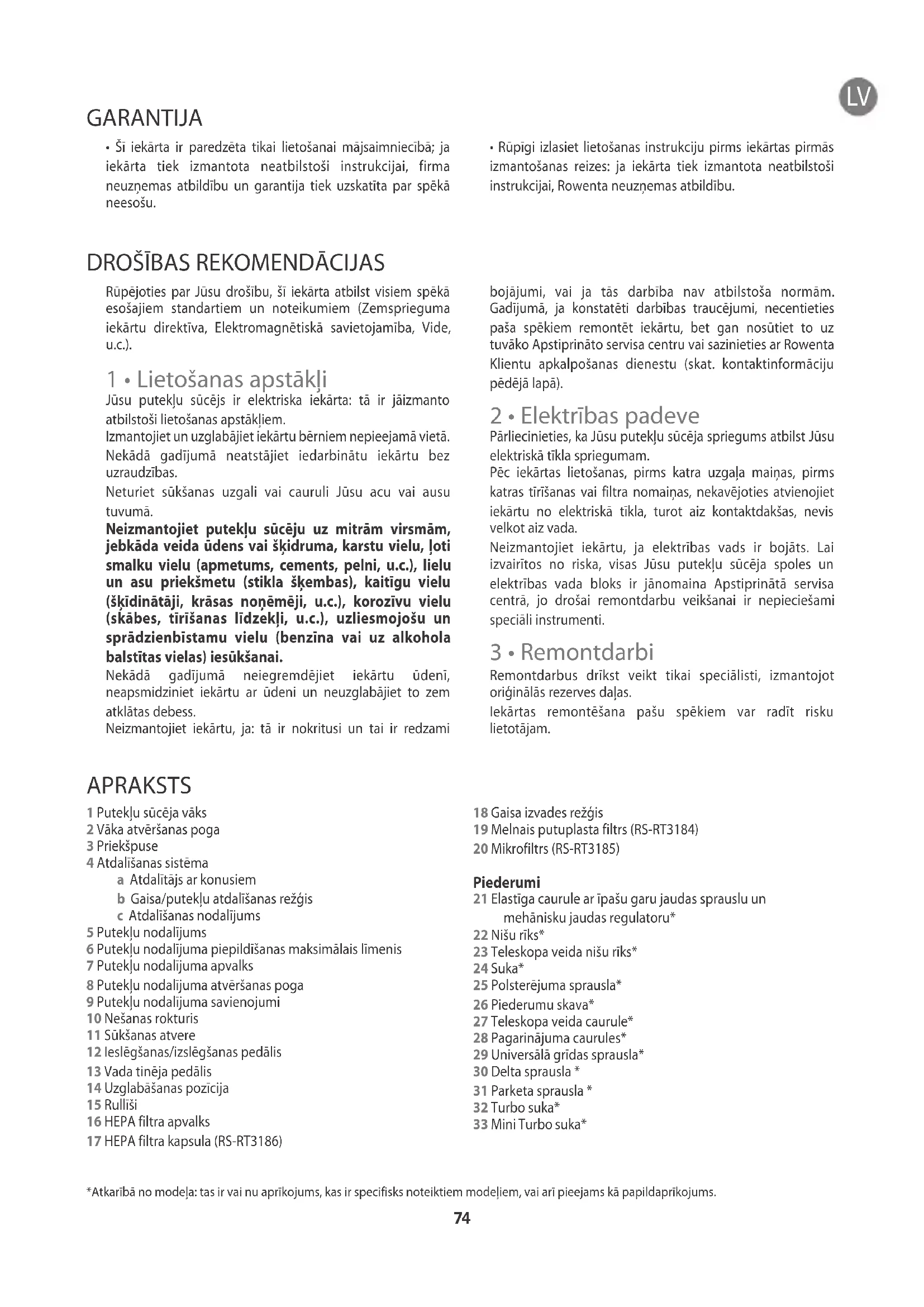 Rūpējoties par Jūsu drošību, šī iekārta atbilst visiem spēkā esošajiem standartiem un noteikumiem (Zemsprieguma iekārtu direktīva, Elektromagnētiskā savietojamība, Vide, u.c.). 1 • Lietošanas apstākļi Jūsu putekļu sūcējs ir elektriska iekārta: tā ir jāizmanto atbilstoši lietošanas apstākļiem. Izmantojiet un uzglabājiet iekārtu bērniem nepieejamā vietā. Nekādā gadījumā neatstājiet iedarbinātu iekārtu bez uzraudzības. Neturiet sūkšanas uzgali vai cauruli Jūsu acu vai ausu tuvumā. Neizmantojiet putekļu sūcēju uz mitrām virsmām, jebkāda veida ūdens vai šķidruma, karstu vielu, ļoti smalku vielu (apmetums, cements, pelni, u.c.), lielu un asu priekšmetu (stikla šķembas), kaitīgu vielu (šķīdinātāji, krāsas noņēmēji, u.c.), korozīvu vielu (skābes, tīrīšanas līdzekļi, u.c.), uzliesmojošu un sprādzienbīstamu vielu (benzīna vai uz alkohola balstītas vielas) iesūkšanai. Nekādā gadījumā neiegremdējiet iekārtu ūdenī, neapsmidziniet iekārtu ar ūdeni un neuzglabājiet to zem atklātas debess. Neizmantojiet iekārtu, ja: tā ir nokritusi un tai ir redzami bojājumi, vai ja tās darbība nav atbilstoša normām. Gadījumā, ja konstatēti darbības traucējumi, necentieties paša spēkiem remontēt iekārtu, bet gan nosūtiet to uz tuvāko Apstiprināto servisa centru vai sazinieties ar Rowenta Klientu apkalpošanas dienestu (skat. kontaktinformāciju pēdējā lapā). 2 • Elektrības padeve Pārliecinieties, ka Jūsu putekļu sūcēja spriegums atbilst Jūsu elektriskā tīkla spriegumam. Pēc iekārtas lietošanas, pirms katra uzgaļa maiņas, pirms katras tīrīšanas vai filtra nomaiņas, nekavējoties atvienojiet iekārtu no elektriskā tīkla, turot aiz kontaktdakšas, nevis velkot aiz vada. Neizmantojiet iekārtu, ja elektrības vads ir bojāts. Lai izvairītos no riska, visas Jūsu putekļu sūcēja spoles un elektrības vada bloks ir jānomaina Apstiprinātā servisa centrā, jo drošai remontdarbu veikšanai ir nepieciešami speciāli instrumenti. 3 • Remontdarbi Remontdarbus drīkst veikt tikai speciālisti, izmantojot oriģinālās rezerves daļas. Iekārtas remontēšana pašu spēkiem var radīt risku lietotājam. APRAKSTS 1 Putekļu sūcēja vāks 2 Vāka atvēršanas poga 3 Priekšpuse 4 Atdalīšanas sistēma a Atdalītājs ar konusiem b Gaisa/putekļu atdalīšanas režģis c Atdalīšanas nodalījums 5 Putekļu nodalījums 6 Putekļu nodalījuma piepildīšanas maksimālais līmenis 7 Putekļu nodalījuma apvalks 8 Putekļu nodalījuma atvēršanas poga 9 Putekļu nodalījuma savienojumi 10 Nešanas rokturis 11 Sūkšanas atvere 12 Ieslēgšanas/izslēgšanas pedālis 13 Vada tinēja pedālis 14 Uzglabāšanas pozīcija 15 Rullīši 16 HEPA filtra apvalks 17 HEPA filtra kapsula (RS-RT3186) 18 Gaisa izvades režģis 19 Melnais putuplasta filtrs (RS-RT3184) 20 Mikrofiltrs (RS-RT3185) Piederumi 21 Elastīga caurule ar īpašu garu jaudas sprauslu un mehānisku jaudas regulatoru* 22 Nišu rīks* 23 Teleskopa veida nišu rīks* 24 Suka* 25 Polsterējuma sprausla* 26 Piederumu skava* 27 Teleskopa veida caurule* 28 Pagarinājuma caurules* 29 Universālā grīdas sprausla* 30 Delta sprausla * 31 Parketa sprausla * 32 Turbo suka* 33 Mini Turbo suka* *Atkarībā no modeļa: tas ir vai nu aprīkojums, kas ir specifisks noteiktiem modeļiem, vai arī pieejams kā papildaprīkojums.