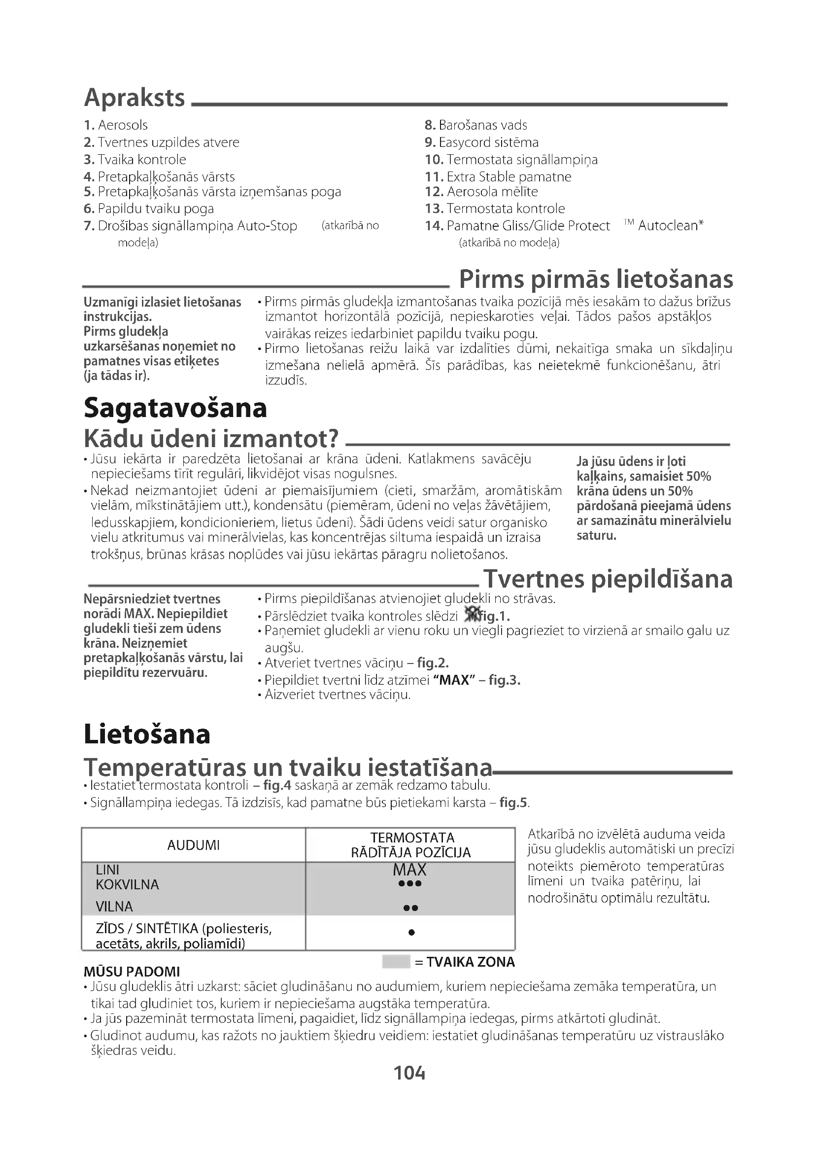 - Iestatiet temperatūru atkarībā no gludināmā auduma.• Pārslēdziet tvaika slēdzi uz – fig.1.• Varat sākt gludināt, kad izdziest signāllampiņa. Papildu funkcijas Pamatne Gliss/Glide Protect