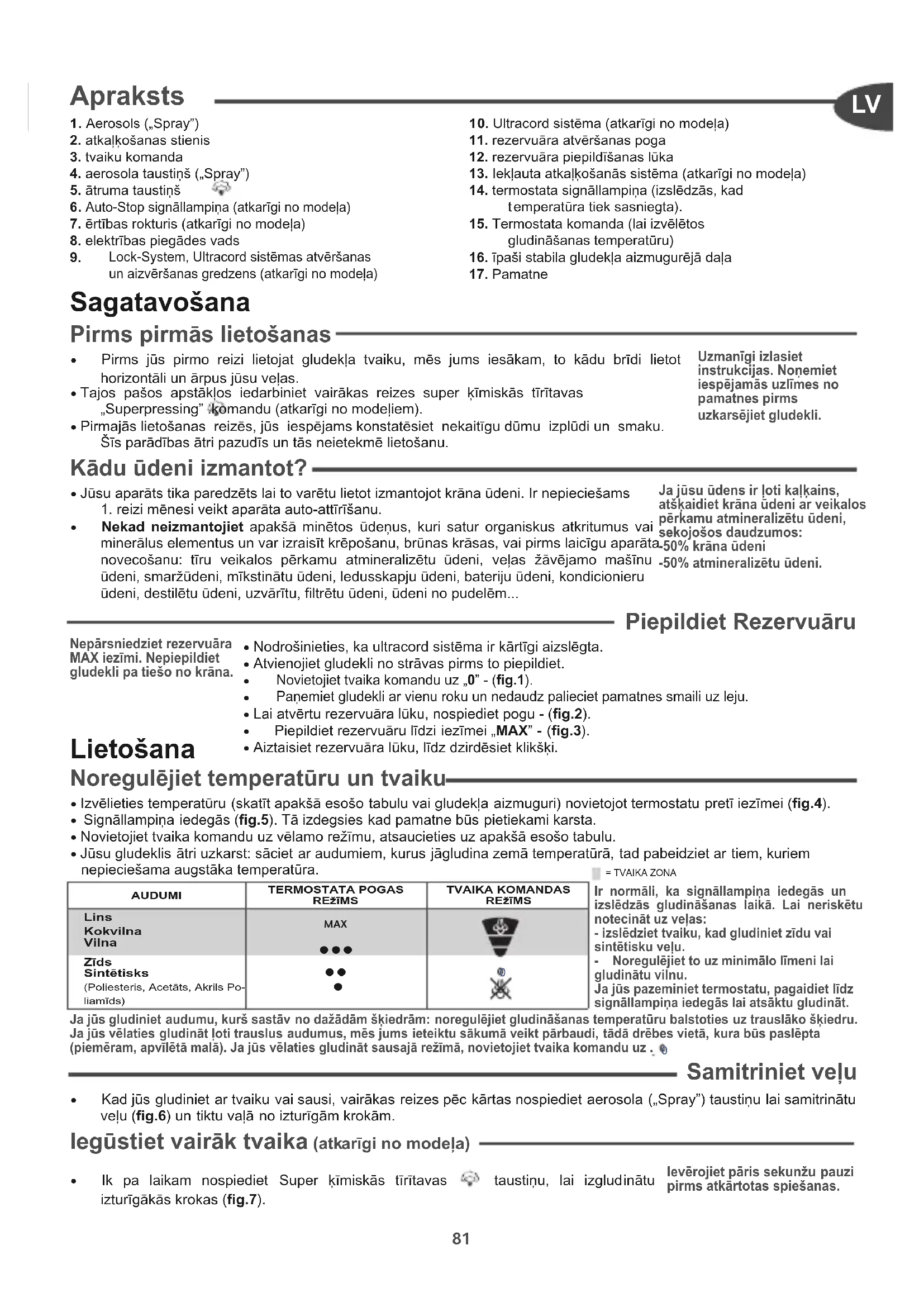 . Aerosols („Spray”)2. atkaļķošanas stienis 3. tvaiku komanda4. aerosola taustiņš („Spray”)5. ātruma taustiņš . Auto-Stop signāllampiņa (atkarīgi no modeļa)7. ērtības rokturis (atkarīgi no modeļa)8. elektrības piegādes vads Lock-System, Ultracord sistēmas atvēršanasun aizvēršanas gredzens (atkarīgi no modeļa) 0. Ultracord sistēma (atkarīgi no modeļa)11. rezervuāra atvēršanas poga12. rezervuāra piepildīšanas lūka13. Iekļauta atkaļķošanās sistēma (atkarīgi no modeļa)14. termostata signāllampiņa (izslēdzās, kad emperatūra tiek sasniegta).15. Termostata komanda (lai izvēlētosgludināšanas temperatūru)16. īpaši stabila gludekļa aizmugurējā daļa17. Pamatne Sagatavošana Kādu ūdeni izmantot?