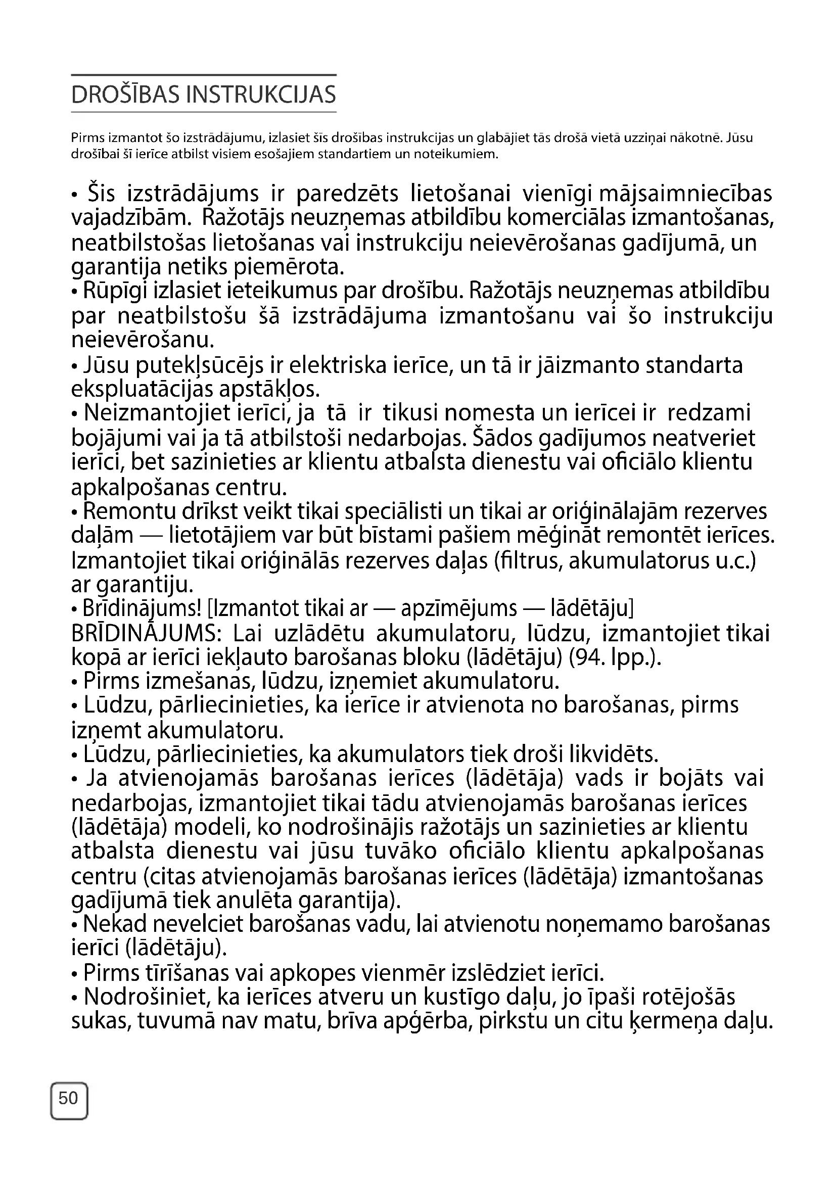 - Remontu drīkst veikt tikai speciālisti un tikai ar oriģinālajām rezerves daļām — lietotājiem var būt bīstami pašiem mēģināt remontēt ierīces. Izmantojiet tikai oriģinālās rezerves daļas (ltrus, akumulatorus u.c.) ar garantiju.
