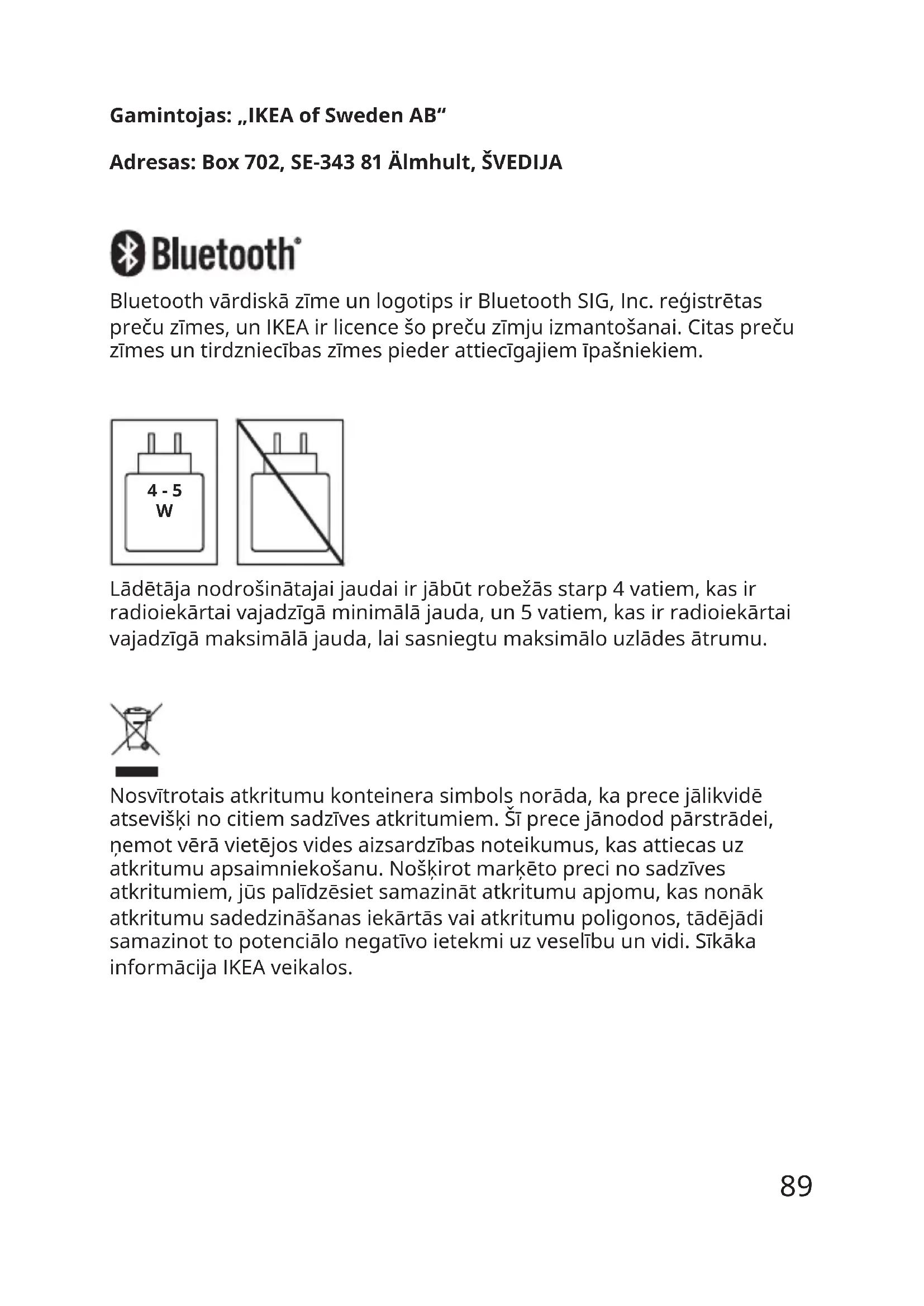 Lādētājanodrošinātajaijaudaiirjābūtrobežāsstarp4vatiem,kasir radioiekārtaivajadzīgāminimālājauda,un5vatiem,kasirradioiekārtai vajadzīgāmaksimālājauda,laisasniegtumaksimālouzlādesātrumu. Nosvītrotaisatkritumukonteinerasimbolsnorāda,kaprecejālikvidē atsevišķinocitiemsadzīvesatkritumiem.Šīprecejānododpārstrādei, ņemotvērāvietējosvidesaizsardzībasnoteikumus,kasattiecasuz atkritumuapsaimniekošanu.Nošķirotmarķētoprecinosadzīves atkritumiem,jūspalīdzēsietsamazinātatkritumuapjomu,kasnonāk atkritumusadedzināšanasiekārtāsvaiatkritumupoligonos,tādējādi samazinottopotenciālonegatīvoietekmiuzveselībuunvidi.Sīkāka informācijaIKEAveikalos.90