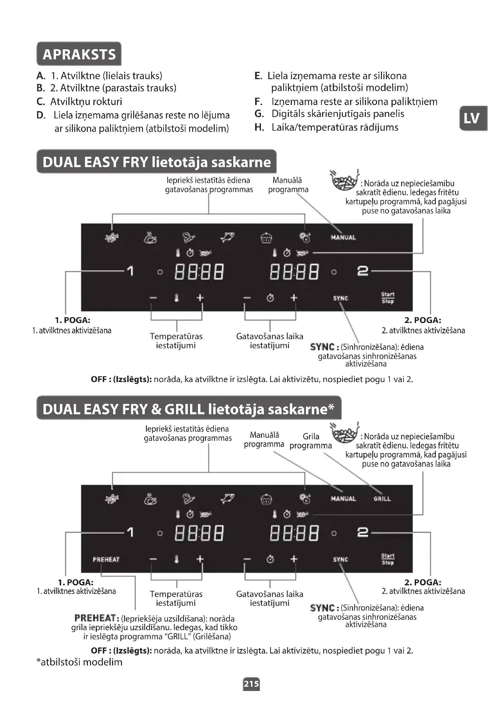 APRAKSTS A. 1. Atvilktne (lielais trauks) B. 2. Atvilktne (parastais trauks) C. Atvilktņu rokturi D. Liela izņemama grilēšanas reste no lējuma ar silikona paliktņiem (atbilstoši modelim) E. Liela izņemama reste ar silikona paliktņiem (atbilstoši modelim) F. Izņemama reste ar silikona paliktņiem G. Digitāls skārienjutīgais panelis H. Laika/temperatūras rādījums DUAL EASY FRY lietotāja saskarne DUAL EASY FRY & GRILL lietotāja saskarne* OFF : (Izslēgts): norāda, ka atvilktne ir izslēgta. Lai aktivizētu, nospiediet pogu 1 vai 2. OFF : (Izslēgts): norāda, ka atvilktne ir izslēgta. Lai aktivizētu, nospiediet pogu 1 vai 2. : (Iepriekšēja uzsildīšana): norāda grila iepriekšēju uzsildīšanu. Iedegas, kad tikko ir ieslēgta programma “GRILL” (Grilēšana) *atbilstoši modelim Iepriekš iestatītās ēdiena gatavošanas programmas : Norāda uz nepieciešamību sakratīt ēdienu. Iedegas fritētu kartupeļu programmā, kad pagājusi puse no gatavošanas laika Manuālā programma
