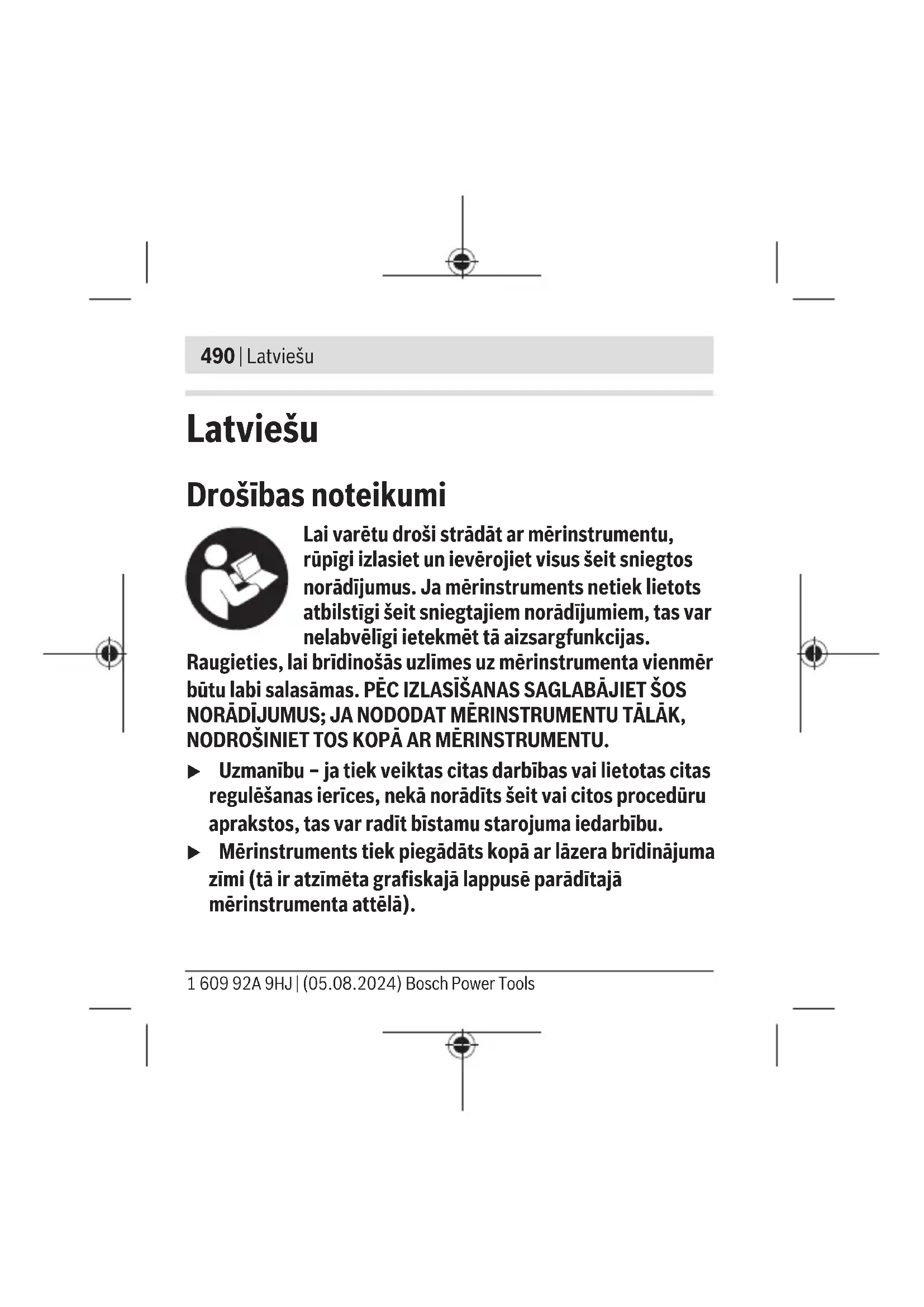 piei 20–25°C D) Norādītās vērtības attiecas uz normāliem un labvēlīgiem apkārtējās vides apstākļiem (piemēram, nav vibrāciju, nav miglas, nav dūmu, nav tiešu saules staru). Ja ir ievērojamas temperatūras svārstības, mērinstruments var darboties neprecīzi. E) Parasti ir vērojams tikai elektronenevadošs piesārņojums, taču dažkārt ir sagaidāma kondensācijas izraisītas pagaidu elektrovadāmības parādīšanās. F) Svars ar sienas stiprinājumu un bez baterijām/akumulatora Mērinstrumenta viennozīmīgai identifikācijai kalpo sērijas numurs (11), kas atrodams uz tā marķējuma plāksnītes. Bosch Power Tools 1 609 92A 9HJ | (05.08.2024)498 | Latviešu Mērinstrumenta elektrobarošana Bateriju ievietošana/nomaiņa Mērinstrumenta darbināšanai ieteicams izmantot sārma-mangāna baterijas vai akumulatorus. Lai atvērtu baterijas nodalījuma vāciņu(8), uzspiediet uz fiksatora(7), tad noņemiet baterijas nodalījuma vāciņu. Ievietojiet nodalījumā baterijas vai akumulatorus. Ievērojiet pareizu bateriju pievienošanas polaritāti, kas attēlota bateriju nodalījumā. Vienmēr vienlaicīgi nomainiet visas baterijas vai akumulatorus. Izmantojiet tikai vienādas ietilpības baterijas vai akumulatorus, kas pagatavoti vienā ražotājfirmā. u Ja mērinstruments ilgāku laiku netiek lietots, izņemiet no tā baterijas vai akumulatorus. Ilgstoši uzglabājot baterijas un akumulatorus mērinstrumentā, tie var korodēt. 1 609 92A 9HJ | (05.08.2024) Bosch Power ToolsLatviešu | 499 Lietošana Uzsākot lietošanu u Sargājiet mērinstrumentu no mitruma un saules staru tiešas iedarbības. u Nepakļaujiet instrumentu ļoti augstas vai ļoti zemas temperatūras iedarbībai un straujām temperatūras izmaiņām. Piemēram, neatstājiet mērinstrumentu uz ilgāku laiku automašīnā. Lielu temperatūras svārstību gadījumā pirms mērinstrumenta lietošanas nogaidiet, līdz tā temperatūra izlīdzinās ar apkārtējās vides temperatūru. Ekstremālu temperatūras vērtību vai strauju temperatūras izmaiņu iedarbība uz mērinstrumentu var nelabvēlīgi ietekmēt tā precizitāti. u Sargājiet mērinstrumentu no stipriem triecieniem, neļaujiet tam krist. Mērinstrumenta bojājumi var nelabvēlīgi ietekmēt tā precizitāti. Ja mērinstruments ir saņēmis stipru triecienu vai kritis, pārbaudiet tā precizitāti, savietojot lāzera stara veidotās līnijas ar kādu zināmu līmenisku vai statenisku atskaites līniju. Bosch Power Tools 1 609 92A 9HJ | (05.08.2024)500 | Latviešu u Vienmēr veidojiet atzīmes lāzera stara veidotās līnijas vai punkta vidū. Lāzera stara projicētā apļa diametrs vai līnijas platums mainās līdz ar attālumu no lāzera. Ieslēgšana un izslēgšana Lai ieslēgtu mērinstrumentu punktu režīmā, pārbīdiet ieslēdzēju/izslēdzēju(2) vienu pakāpi lāzera stara izvadlūkas virzienā (slēdža pozīcija●). Lai ieslēgtu mērinstrumentu līniju režmā, pabīdiet ieslēdzēju/ izslēdzēju(2) līdz atdurei lāzera stara izvadlūkas virzienā (slēdža pozīcija—). Mērinstruments tūlīt pēc ieslēgšanas atkarībā no izvēlētā darbības režīma raida lāzera staru no izvadlūkas(6) (punkta režīms) vai (1) (līnijas režīms). u Nevērsiet lāzera staru citu personu vai mājdzīvnieku virzienā un neskatieties lāzera starā pat no liela attāluma. Lai izslēgtu mērinstrumentu, pārbīdiet ieslēdzēju/izslēdzēju (2) līdz atdurei OFF virzienā. u Neatstājiet ieslēgtu mērinstrumentu bez uzraudzības un pēc lietošanas to izslēdziet. Lāzera stars var apžilbināt tuvumā esošās personas. 1 609 92A 9HJ | (05.08.2024) Bosch Power ToolsLatviešu | 501 Mērinstrumenta pozicionēšana (skat.attēluA) Norādīto nivelēšanas precizitāti var panākt tikai tad, ja mērinstruments ir pareizi novietots: – Izlīdzinot horizontāli, izmantojot izlīdzināšanas burbuli (4), mērinstrumenta alumīnija atbalsta (12) virsmai jābūt pavērstai uz leju. – Lai veiktu vertikālu izlīdzināšanu, izmantojot vertikālās izlīdzināšanas burbuli (5), lāzera stara izvadlūkām(6) un (1) jābūt pavērstām uz augšu, un mērinstrumenta alumīnija atbalsta virsmai (12) uz kreiso pusi. Pielietošanas iespējas Izlīdzināšana ar lāzera līnijas palīdzību (līnijas režīms) Līniju režīmā ir iespējams, piemēram, izlīdzināt priekšmetus uz sienas: – horizontāli vienu otram blakus (mērinstruments novietots horizontāli), – vertikāli vienu virs otra (mērinstruments novietots vertikāli), – jebkurā vēlamajā leņķī (mērinstruments pavērsts ar stiprinājuma pagriežamo skrūvi(14)). Bosch Power Tools 1 609 92A 9HJ | (05.08.2024)502 | Latviešu Novietojiet mērinstrumentu ar magnētu(9) tieši uz vertikālas magnētiskas virsmas vai izmantojiet turētāju(13). Lai piestiprinātu turētāju(13) pie sienas, ir 2 iespējas: – Piespraužot (skat.attēluB): novietojiet turētāju(13) uz sienas. Iespraudiet komplektā iekļautās tapas(18) caur turētāja atvērumiem sienā (atkarībā no sienas veida – vertikāli vai 45° leņķī). – Piekarinot: novietojiet turētāju(13) ar atveri aizmugurē uz skrūves vai naglas, kas ir nedaudz izvirzīta no sienas. Turētāja aizmugurei ir jāpieguļ sienai. Raugieties, lai turētājs(13) būtu droši nofiksēts uz sienas. Novietojiet mērinstrumentu ar magnētu(9) uz turētāja montāžas stiprinājuma (15). Norāde: horizontālā izlīdzināšana, izmantojot lāzera līniju, ir iespējama tikai uz sienas, uz kuras ir piestiprināts mērinstruments. Pat tad ja lāzera līnija ir redzama uz blakus esošajām sienām, tas nenozīmē, ka tā uz šīm sienām ir horizontāla. Novietošana vēlamajā leņķī (skat.attēluC): pavērsiet mērinstrumentu, kas atrodas turētājā, horizontālā stāvoklī. Pēc tam pagrieziet turētāja pagriežamo skrūvi(14) tā, lai 0° atzīme 1 609 92A 9HJ | (05.08.2024) Bosch Power ToolsLatviešu | 503 atrastos zem mēr
