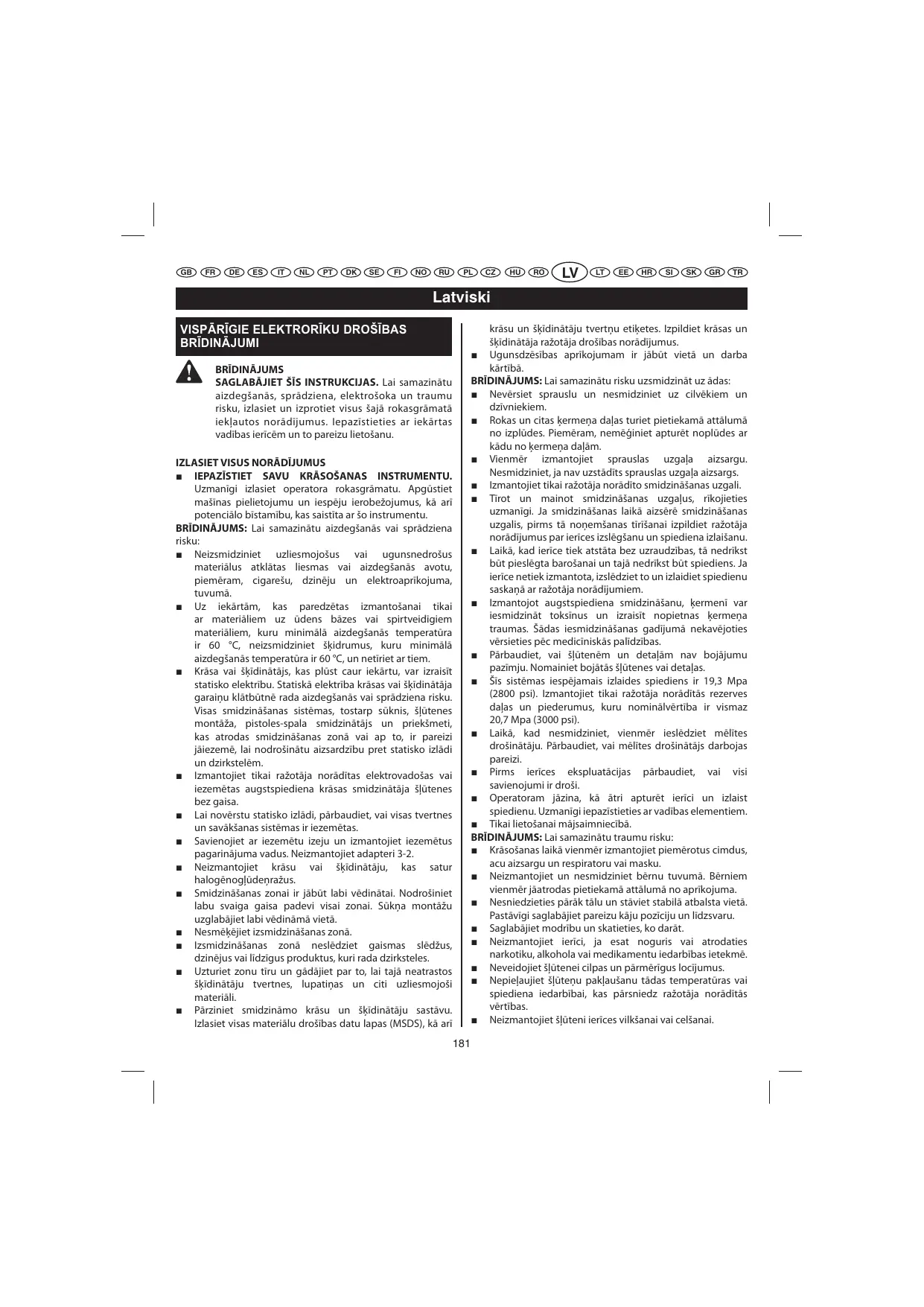 Gardez la zone de travail exempte de bidons de peinture ou de solvant, de chiffons, et autres éléments inflammables. Connaissez la composition des peintures et solvants vaporisés. Lisez toute la Fiche Technique SantéSécurité (MSDS) du produit et les étiquettes situées sur les bidons de peinture et de solvant. Respectez les instructions de sécurité du fabricant de peinture et de solvant. Des extincteurs doivent être présents et en état de fonctionner. AVERTISSEMENT: Pour réduire les risque d’injection dans la peau: Ne faites pas pointer le pistolet ou le jet vers des personnes ou des animaux. Eloignez les mains et les autres parties du corps de la sortie de déversement. Par exemple, ne tentez pas de stopper une fuite avec une partie quelconque de votre corps. Utilisez toujours la protection de buse. Ne vaporisez pas sans que la protection de buse ne soit en place. N’utilisez que les buses indiquées par le fabricant. Soyez prudent lors du nettoyage et du changement de buse. Au cas où la buse se boucherait au cours de l’utilisation, suivez les instructions du fabricant pour arrêter l’appareil et relâcher la pression avant de démonter la buse en vue de son nettoyage. Ne laissez pas l’appareil sans surveillance lorsqu’il est alimenté ou sous pression. Lorsque l’appareil n’est pas utilisé, arrêtez-le et relâchez la pression en suivant les indications du fabricant. Le jet haute pression est capable d’injecter des toxines dans le corps et de provoquer de graves blessures. En cas d’injection, contactez immédiatement un médecin. Vérifiez que les flexibles et autres éléments sont exempts de signes d’endommagement. Remplacez tout flexible ou élément endommagé. Ce système est capable de produire une pression de 19.3 MPa (2800 psi). N’utilisez que des accessoires ou pièces de rechange recommandés par le fabricant et conçus pour supporter au moins 20.7 MPa (3000 psi) de pression. Verrouillez toujours la gâchette hors des périodes d’utilisation. Vérifiez que le verrouillage de la gâchette fonctionne correctement. Vérifiez le bon verrouillage des raccords avant de mettre l’appareil en marche. Sachez comment rapidement arrêter l’appareil et en relâcher la pression. Familiarisez-vous avec les commandes.
