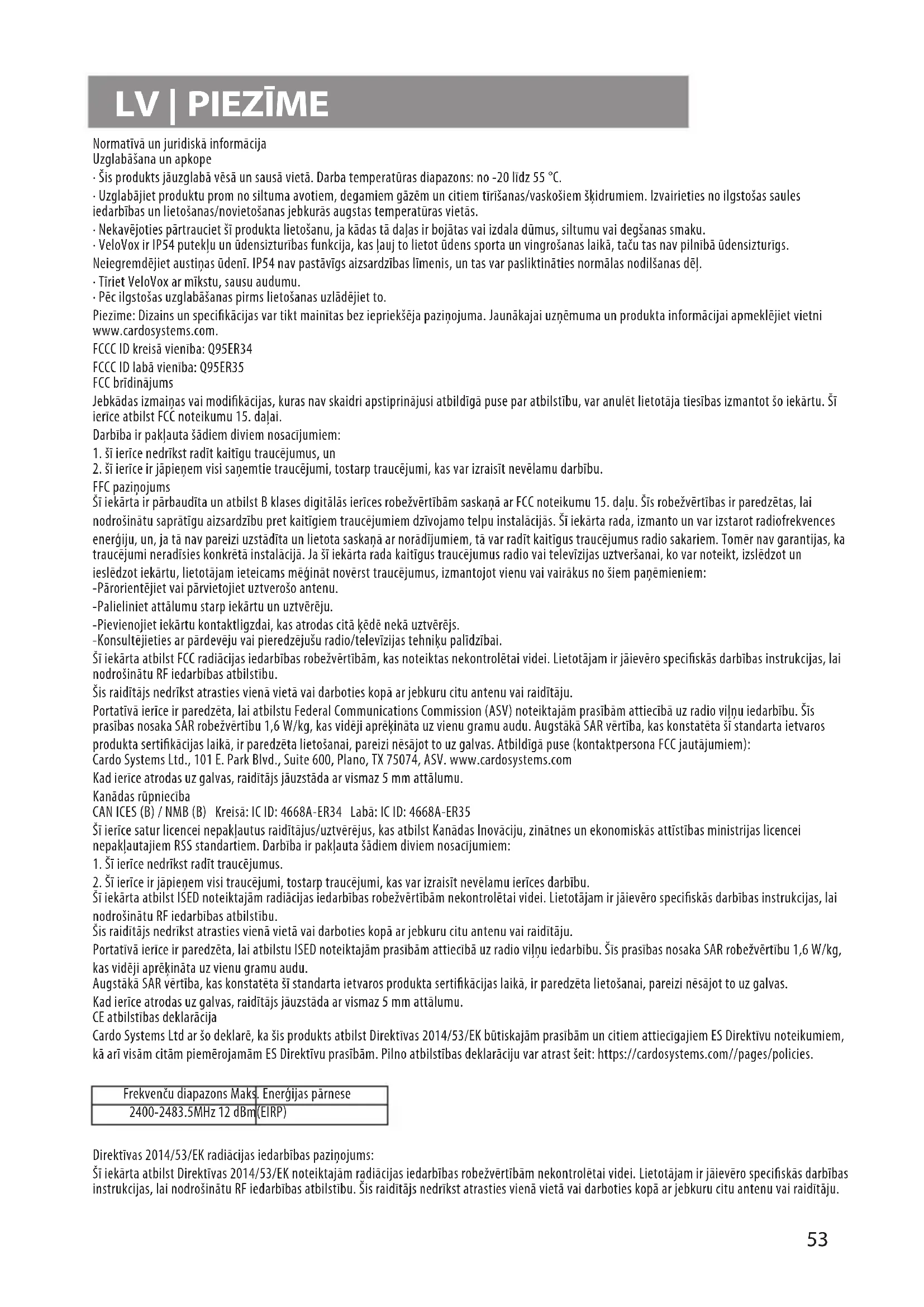 53Portatīvā ierīce ir paredzēta, lai atbilstu Eiropas Savienības tirgū noteiktajām prasībām attiecībā uz radio viļņu iedarbību. Šīs prasības nosaka SAR robežvērtību 2 W/kg, kas vidēji aprēķināta uz desmit gramiem audu. Augstākā SAR vērtība, kas konstatēta šī standarta ietvaros produkta sertifikācijas laikā, ir 0,453 W/kg (10 g), paredzot lietošanai, pareizi nēsājot to uz galvas. Kad ierīce atrodas uz galvas, raidītājs jāuzstāda ar vismaz 5 mm attālumu. Lielbritānijas atbilstības deklarācija Ar šo Cardo Systems deklarē, ka radioiekārta Lazer VeloVox atbilst Radioiekārtu noteikumiem 6.1a, 6.1b un 6.2 RER 2017 (SI 2017/1206). Pilno Lielbritānijas atbilstības deklarācijas tekstu var atrast šādā interneta adresē: https://cardosystems.com/pages/legal-policies. Uzlādes temperatūra: Akumulatora uzlādes temperatūras robežas: no 0° līdz 40°C (no 32° līdz 104°F). AC/DC adapteri: Uzlādējot no kontaktligzdas, pārliecinieties, ka pievienojamais AC/DC adapters atbilst šādiem kritērijiem: Ieeja: 100–240 V, 50/60 Hz, minimālā strāva 0,04 A; izeja: 5 V līdzstrāva, maksimālā strāva 1 A. Uzlāde
