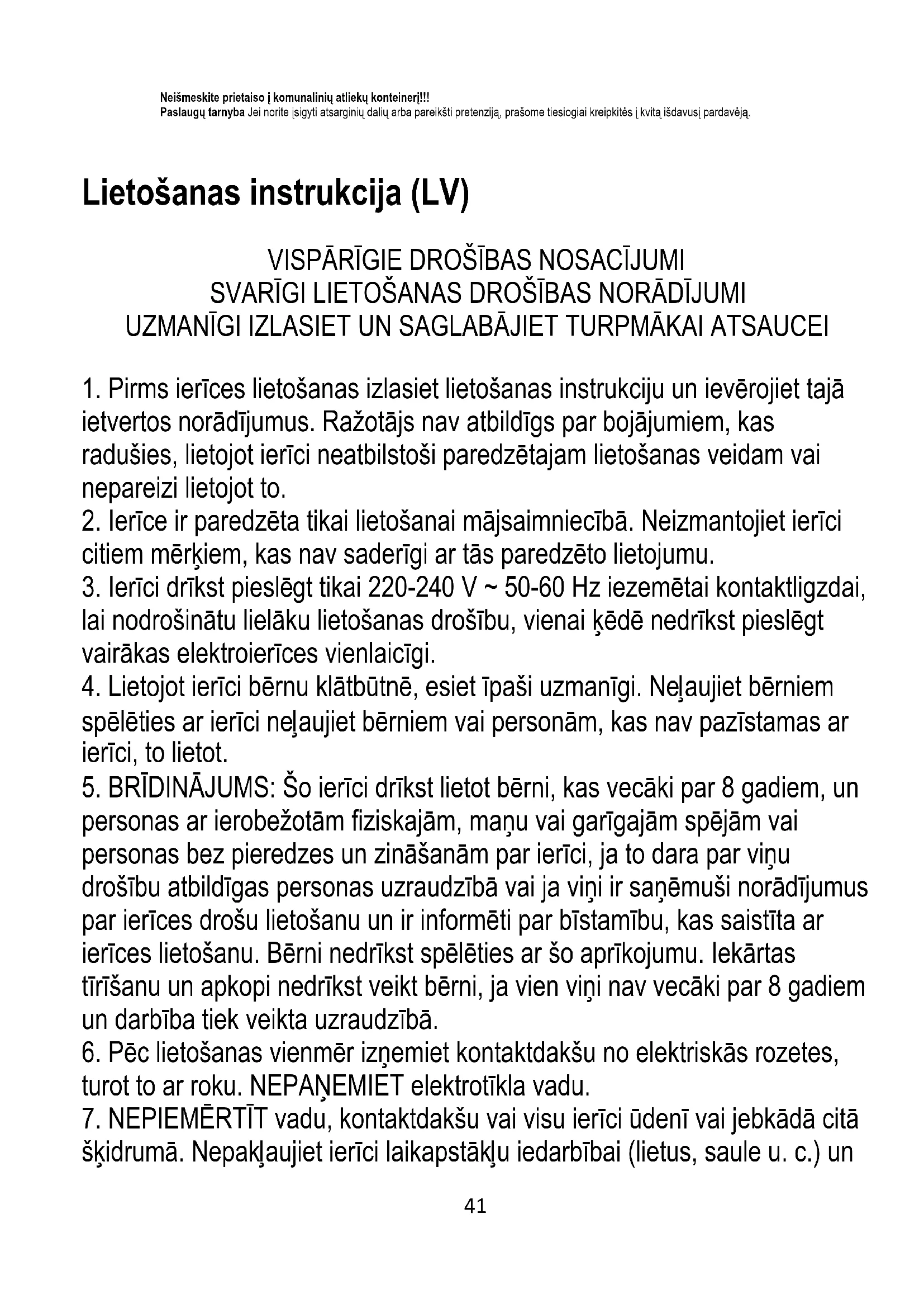 7. NEPIEMĒRTĪT vadu, kontaktdakšu vai visu ierīci ūdenī vai jebkādā citā