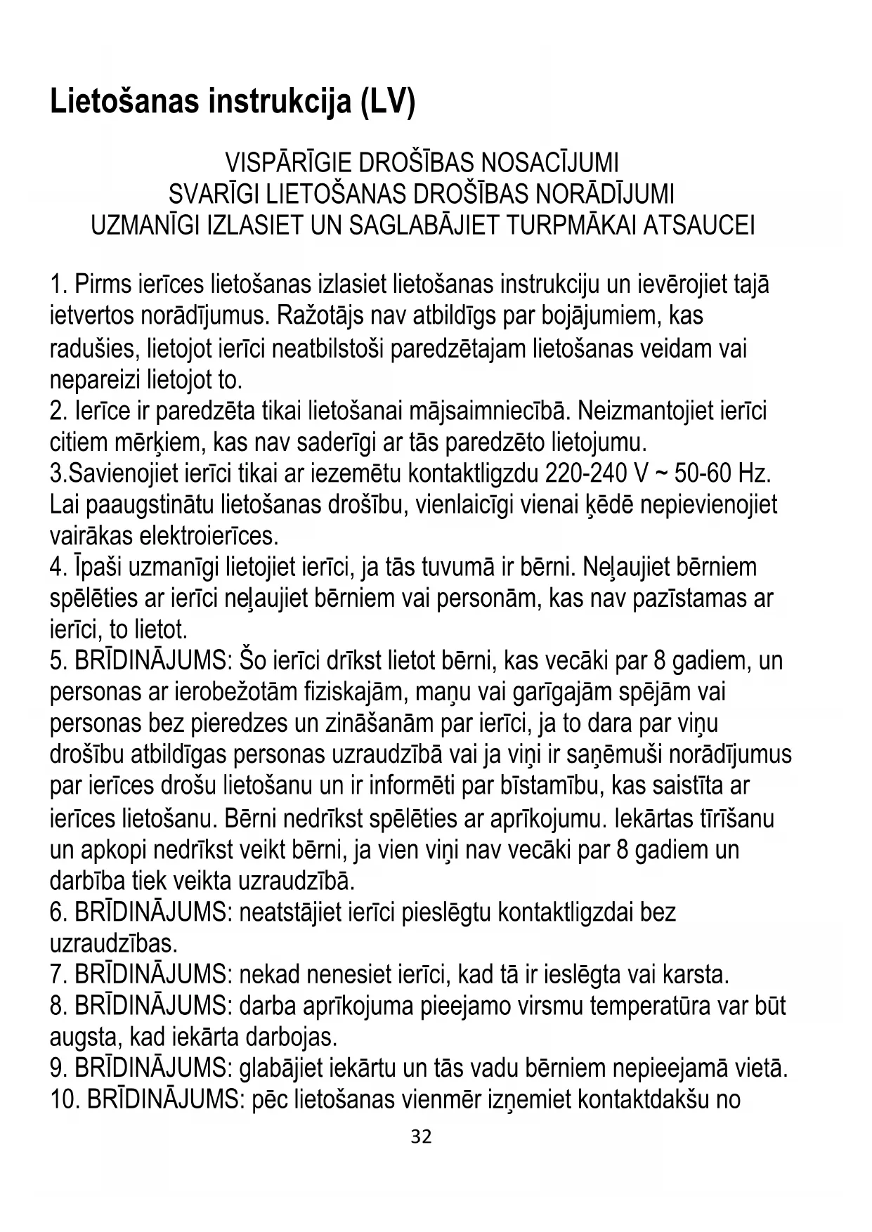 citiem mērķiem, kas nav saderīgi ar tās paredzēto lietojumu. 3.Savienojiet ierīci tikai ar iezemētu kontaktligzdu 220-240 V ~ 50-60 Hz. Lai paaugstinātu lietošanas drošību, vienlaicīgi vienai ķēdē nepievienojiet vairākas elektroierīces.