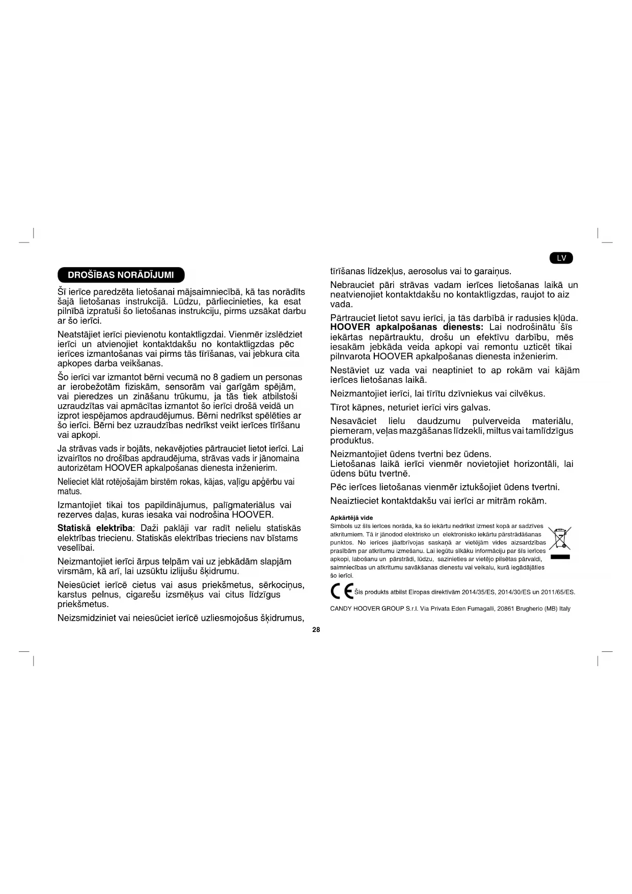 Šī ierīce paredzēta lietošanai mājsaimniecībā, kā tas norādīts šajā lietošanas instrukcijā. Lūdzu, pārliecinieties, ka esat pilnībā izpratuši šo lietošanas instrukciju, pirms uzsākat darbu ar šo ierīci. Neatstājiet ierīci pievienotu kontaktligzdai. Vienmēr izslēdziet ierīci un atvienojiet kontaktdakšu no kontaktligzdas pēc ierīces izmantošanas vai pirms tās tīrīšanas, vai jebkura cita apkopes darba veikšanas. Šo ierīci var izmantot bērni vecumā no 8 gadiem un personas ar ierobežotām ziskām, sensorām vai garīgām spējām, vai pieredzes un zināšanu trūkumu, ja tās tiek atbilstoši uzraudzītas vai apmācītas izmantot šo ierīci drošā veidā un izprot iespējamos apdraudējumus. Bērni nedrīkst spēlēties ar šo ierīci. Bērni bez uzraudzības nedrīkst veikt ierīces tīrīšanu vai apkopi. Ja strāvas vads ir bojāts, nekavējoties pārtrauciet lietot ierīci. Lai izvairītos no drošības apdraudējuma, strāvas vads ir jānomaina autorizētam HOOVER apkalpošanas dienesta inženierim. Nelieciet klāt rotējošajām birstēm rokas, kājas, vaļīgu apģērbu vai matus. Izmantojiet tikai tos papildinājumus, palīgmateriālus vai rezerves daļas, kuras iesaka vai nodrošina HOOVER. Statiskā elektrība: Daži paklāji var radīt nelielu statiskās elektrības triecienu. Statiskās elektrības trieciens nav bīstams veselībai. Neizmantojiet ierīci ārpus telpām vai uz jebkādām slapjām virsmām, kā arī, lai uzsūktu izlijušu šķidrumu. Neiesūciet ierīcē cietus vai asus priekšmetus, sērkociņus, karstus pelnus, cigarešu izsmēķus vai citus līdzīgus priekšmetus. Neizsmidziniet vai neiesūciet ierīcē uzliesmojošus šķidrumus, tīrīšanas līdzekļus, aerosolus vai to garaiņus. Nebrauciet pāri strāvas vadam ierīces lietošanas laikā un neatvienojiet kontaktdakšu no kontaktligzdas, raujot to aiz vada. Pārtrauciet lietot savu ierīci, ja tās darbībā ir radusies kļūda. HOOVER apkalpošanas dienests: Lai nodrošinātu šīs iekārtas nepārtrauktu, drošu un efektīvu darbību, mēs iesakām jebkāda veida apkopi vai remontu uzticēt tikai pilnvarota HOOVER apkalpošanas dienesta inženierim. Nestāviet uz vada vai neaptiniet to ap rokām vai kājām ierīces lietošanas laikā. Neizmantojiet ierīci, lai tīrītu dzīvniekus vai cilvēkus. Tīrot kāpnes, neturiet ierīci virs galvas. Nesavāciet lielu daudzumu pulverveida materiālu, piemeram, veļas mazgāšanas līdzekli, miltus vai tamlīdzīgus produktus. Neizmantojiet ūdens tvertni bez ūdens. Lietošanas laikā ierīci vienmēr novietojiet horizontāli, lai ūdens būtu tvertnē. Pēc ierīces lietošanas vienmēr iztukšojiet ūdens tvertni. Neaiztieciet kontaktdakšu vai ierīci ar mitrām rokām. Apkārtējā vide Simbols uz šīs ierīces norāda, ka šo iekārtu nedrīkst izmest kopā ar sadzīves atkritumiem. Tā ir jānodod elektrisko un elektronisko iekārtu pārstrādāšanas punktos. No ierīces jāatbrīvojas saskaņā ar vietējām vides aizsardzības prasībām par atkritumu izmešanu. Lai iegūtu sīkāku informāciju par šīs ierīces apkopi, labošanu un pārstrādi, lūdzu, sazinieties ar vietējo pilsētas pārvaldi, saimniecības un atkritumu savākšanas dienestu vai veikalu, kurā iegādājāties šo ierīci. Šis produkts atbilst Eiropas direktīvām 2014/35/ES, 2014/30/ES un 2011/65/ES. CANDY HOOVER GROUP S.r.l. Via Privata Eden Fumagalli, 20861 Brugherio (MB) Italy LV29 *Tikai noteiktiem modeļiem **Var mainīties atkarībā no modeļa IEPAZĪSTIET SAVU TĪRĪTĀJU