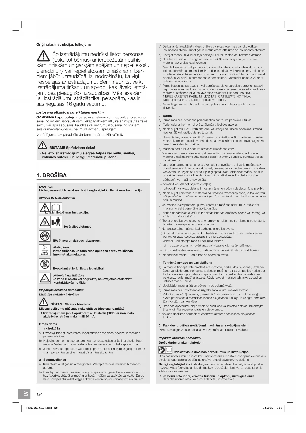 - Pirkuma čeka uzrādīšana. Garantija nav attiecināma uz detaļu un komponentu (piemēram, nažu, nažu stiprinājuma daļu, turbīnu, apgaismes līdzekļu, ķīļsiksnu un zob- siksnu, darba ratu, gaisa filtru, aizdedzes sveču) normālu nodilumu, optiskām izmaiņām, kā arī uz dilstošajām un patērējamajām detaļām. Šī ražotāja garantija paredz vienīgi izstrādājuma apmaiņu un remontu saskaņā ar iepriekš minētajiem nosacījumiem. Citu mums kā ražotājam izvirzītu prasību apmierināšana, piemēram, zaudējumu atlīdzināšanu, ražotāja garantija neparedz. Šī ražotāja garantija neskar likumā un līgumā noteiktās garantijas prasības, ko lietotājs var izvirzīt pret veikalu / pārdevēju. Ražotāja garantijas spēkā esamību un darbību reglamentē Vācijas Federatīvās Republikas tiesību akti. Iestājoties garantijas gadījumam, lūdzam nosūtīt defektīvo izstrādājumu kopā ar pirkuma čeka kopiju un kļūmes aprakstu uz aizmugurē norādīto GARDENA servisa adresi, pilnībā apmaksājot pasta izdevumus. Dilstošas detaļas: Pūšanas caurule un sprausla ir dilstošas detaļas, tāpēc garantija uz tiem nav attiecināma. 14890-20.960.01.indd 128 23.09.20 12:52129 Produktbezeichnung: Description of the product: Désignation du produit : Beschrijving van het product: Beskrivning av produkten: Beskrivelse af produktet: Tuotteen kuvaus: Descrizione del prodotto: Descripción del producto: Descrição do produto: Opis produktu: A termék leírása: Popis výrobku: Popis produktu: Περιγραφή του προϊόντος: Opis izdelka: Opis proizvoda: Descrierea produsului: Описание на продукта: Toote kirjeldus: Gaminio aprašas: Izstrādājuma apraksts: Akku-Laubbläser Battery Blower Souffleur de feuilles à batterie Accu-bladblazer Batteridriven lövblås Accu-løvblæser Akkulehtipuhallin Soffiatore per foglie a batteria Soplador de hojas con Accu Soprador de folhagem a bateria Akumulatorowa dmuchawa do liści Akkumulátoros lombfúvó Akumulátorový foukač listí Akumulátorový fúkač lístia Φυσητήρας φύλλων μπαταρίας Akumulatorski puhalnik za listje Baterijski puhač za lišće Suflantă de frunze cu acumulator Акумулаторна моторна метла за листа Akuga lehepuhur Akumuliatorinis lapų pūstuvas Ar akumulatoru darbināms lapu pūtējs Produkttyp: Product type: Type de produit : Producttype: Produkttyp: Produkttype: Tuotetyyppi: Tipo adi prodotto: Tipo de producto: Tipo de produto: Typ produktu: Terméktípus: Druh výrobku: Typ produktu: Τύπος προϊόντος: Vrsta izdelka: Vrsta proizvoda: Tip produs: Тип продукт: Tootetüüp: Gaminio tipas: Produkta veids: PowerJet 18V P4A Artikelnummer: Article number: Référence : Artikelnummer: Artikelnummer: Artikelnummer: Tuotenumero: Codice articolo: Referencia: Número de referência: Numer katalogowy: Cikkszámok: Objednací číslo: Objednávacie číslo: Κωδικός είδους: Številka izdelka: Kataloški broj: Cod articol: Артикул номер: Artiklinumber: Dalies numeris: Artikula numurs: