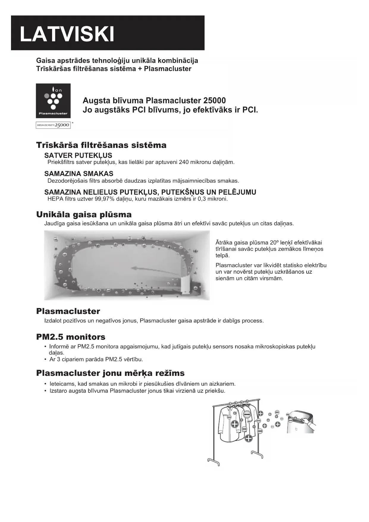 JEGYZETLATVISKI Gaisa apstrādes tehnoloģiju unikāla kombinācija Trīskāršas filtrēšanas sistēma + Plasmacluster Augsta blīvuma Plasmacluster 25000 Jo augstāks PCI blīvums, jo efektīvāks ir PCI. Trīskārša filtrēšanas sistēma