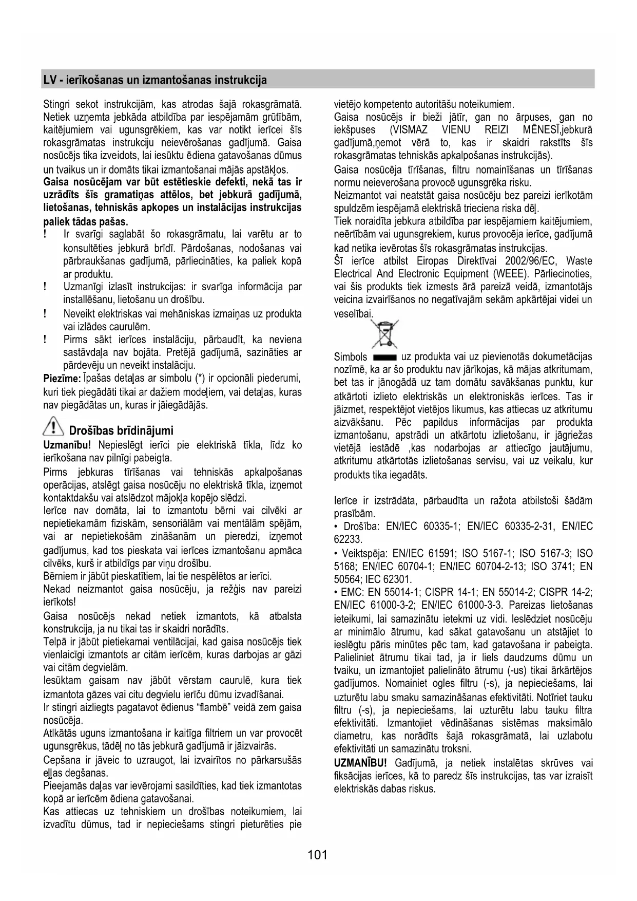 spragtelėjimas). Jei apšvietimas neveiks, prieš kviesdami techninę pagalbą, patikrinkite, ar lempas įstatėte teisinga pozicija.101 LV - ierīkošanas un izmantošanas instrukcija Stingri sekot instrukcijām, kas atrodas šajā rokasgrāmatā. Netiek uzņemta jebkāda atbildība par iespējamām grūtībām, kaitējumiem vai ugunsgrēkiem, kas var notikt ierīcei šīs rokasgrāmatas instrukciju neievērošanas gadījumā. Gaisa nosūcējs tika izveidots, lai iesūktu ēdiena gatavošanas dūmus un tvaikus un ir domāts tikai izmantošanai mājās apstākļos. Gaisa nosūcējam var būt estētieskie defekti, nekā tas ir uzrādīts šīs gramatiņas attēlos, bet jebkurā gadījumā, lietošanas, tehniskās apkopes un instalācijas instrukcijas paliek tā das pašas. ! Ir svarīgi saglabāt šo rokasgrāmatu, lai varētu ar to konsultēties jebkurā brīdī. Pārdošanas, nodošanas vai pārbraukšanas gadījumā, pārliecināties, ka paliek kopā ar produktu. ! Uzmanīgi izlasīt instrukcijas: ir svarīga informācija par installēšanu, lietošanu un drošību. ! Neveikt elektriskas vai mehāniskas izmaiņas uz produkta vai izlādes caurulēm. ! Pirms sākt ierīces instalāciju, pārbaudīt, ka neviena sastāvdaļa nav bojāta. Pretējā gadījumā, sazināties ar pārdevēju un neveikt instalāciju. Piezīme: Īpašas detaļas ar simbolu (*) ir opcionāli piederumi, kuri tiek piegādāti tikai ar dažiem modeļiem, vai detaļas, kuras nav piegādātas un, kuras ir jāiegādājās. Drošības brīdinājumi Uzmanību! Nepieslēgt ierīci pie elektriskā tīkla, līdz ko ierīkošana nav pilnīgi pabeigta. Pirms jebkuras tīrīšanas vai tehniskās apkalpošanas operācijas, atslēgt gaisa nosūcēju no elektriskā tīkla, izņemot kontaktdakšu vai atslēdzot mājokļa kopējo slēdzi. Ierīce nav domāta, lai to izmantotu bērni vai cilvēki ar nepietiekamām fiziskām, sensoriālām vai mentālām spējām, vai ar nepietiekošām zināšanām un pieredzi, izņemot gadījumus, kad tos pieskata vai ierīces izmantošanu apmāca cilvēks, kurš ir atbildīgs par viņu droš ību. Bērniem ir jābūt pieskatītiem, lai tie nespēlētos ar ierīci. Nekad neizmantot gaisa nosūcēju, ja režģis nav pareizi ierīkots! Gaisa nosūcējs nekad netiek izmantots, kā atbalsta konstrukcija, ja nu tikai tas ir skaidri norādīts. Telpā ir jābūt pietiekamai ventilācijai, kad gaisa nosūcējs tiek vienlaicīgi izmantots ar citām ierīcēm, kuras darbojas ar gāzi vai citām degvielām. Iesūktam gaisam nav jābūt vērstam caurulē, kura tiek izmantota gāzes vai citu degvielu ierīču dūmu izvadīšanai. Ir stingri aizliegts pagatavot ēdienus “flambē” veidā zem gaisa nosūcēja. Atlk ātās uguns izmantošana ir kaitīga filtriem un var provocēt ugunsgrēkus, tādēļ no tās jebkurā gadījumā ir jāizvairās. Cepšana ir jāveic to uzraugot, lai izvairītos no pārkarsušās eļļas degšanas. Pieejamās daļas var ievērojami sasildīties, kad tiek izmantotas kopā ar ierīcēm ēdiena gatavošanai. Kas attiecas uz tehniskiem un drošības noteikumiem, lai izvadītu dūmus, tad ir nepieciešams stingri pieturēties pie vietējo kompetento autoritāšu noteikumiem. Gaisa nosūcējs ir bieži jātīr, gan no ārpuses, gan no iekšpuses (VISMAZ VIENU REIZI MĒNESĪ,jebkurā gadījumā,ņemot vērā to, kas ir skaidri rakst īts šīs rokasgrāmatas tehniskās apkalpošanas instrukcijās). Gaisa nosūcēja tīrīšanas, filtru nomainīšanas un tīrīšanas normu neieverošana provocē ugunsgrēka risku. Neizmantot vai neatstāt gaisa nosūcēju bez pareizi ierīkotām spuldzēm iespējamā elektriskā trieciena riska dēļ. Tiek noraidīta jebkura atbildība par iespējamiem kaitējumiem, neērtībām vai ugunsgrekiem, kurus provocēja ierīce, gadījumā kad netika ievērotas šīs rokasgrāmatas instrukcijas. Šī ierīce atbilst Eiropas Direktīvai 2002/96/EC, Waste Electrical And Electronic Equipment (WEEE). Pārliecinoties, vai šis produkts tiek izmests ārā pareizā veidā, izmantotājs veicina izvairīšanos no negatīvajām sekām apkārtējai videi un veselībai. Simbols uz produkta vai uz pievienotās dokumetācijas nozīmē, ka ar šo produktu nav jārīkojas, kā mājas atkritumam, bet tas ir jānogādā uz tam domātu savākšanas punktu, kur atkārtoti izlieto elektriskās un elektroniskās ierīces. Tas ir jāizmet, respektējot vietējos likumus, kas attiecas uz atkritumu aizvākšanu. Pēc papildus informācijas par produkta izmantošanu, apstrādi un atkārtotu izlietošanu, ir jāgriežas vietējā iestādē ,kas nodarbojas ar attiecīgo jautājumu, atkritumu atkārtotās izlietošanas servisu, vai uz veikalu, kur produkts tika iegadāts. Ierīce ir izstrādāta, pārbaudīta un ražota atbilstoši šādām prasībām.