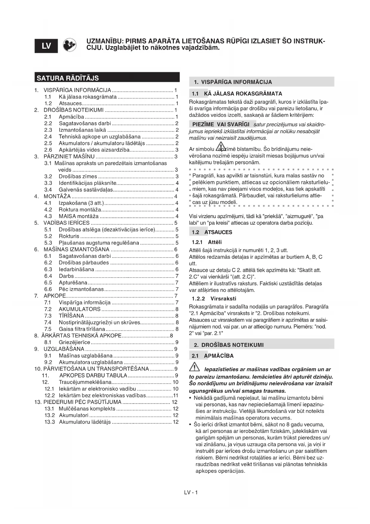 SVARĪGI Turpmāk izklāstītie drošības noteikumi ietver noteikumus, kuri ir ietverti attiecīgajā akumulatora un aku- mulatoru lādētāja rokasgrāmatā, kura ir pievienota mašīnai.LV - 3