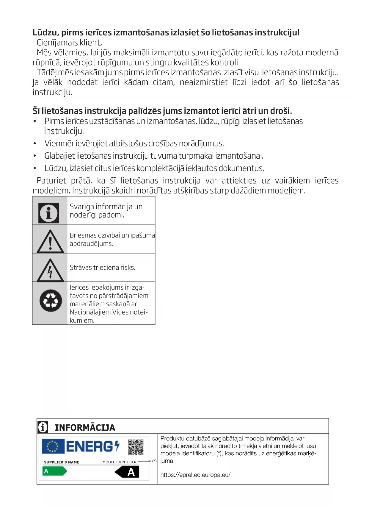Produktu datubāzē saglabātajai modeļa informācijai var piekļūt, ievadot tālāk norādīto tīmekļa vietni un meklējot jūsu modeļa identifikatoru (*), kas norādīts uz enerģētikas marķē- juma.https://eprel.ec.europa.eu/