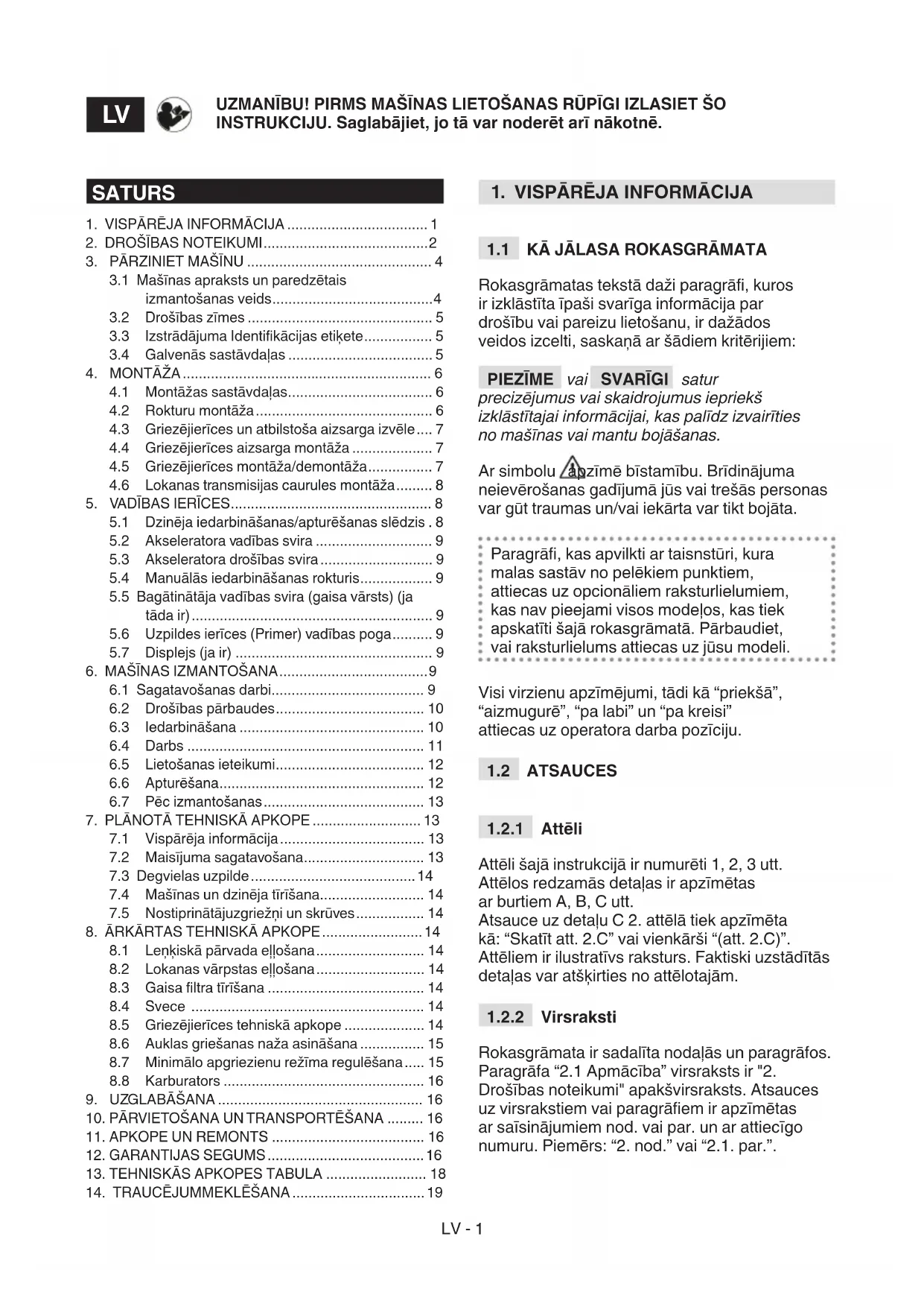 Rokasgrāmata ir sadalīta nodaļās un paragrāfos. Paragrāfa “2.1 Apmācība” virsraksts ir "2. Drošības noteikumi" apakšvirsraksts. Atsauces uz virsrakstiem vai paragrāem ir apzīmētas ar saīsinājumiem nod. vai par. un ar attiecīgo numuru. Piemērs: “2. nod.” vai “2.1. par.”. UZMANĪBU! PIRMS MAŠĪNAS LIETOŠANAS RŪPĪGI IZLASIET ŠO INSTRUKCIJU. Saglabājiet, jo tā var noderēt arī nākotnē.