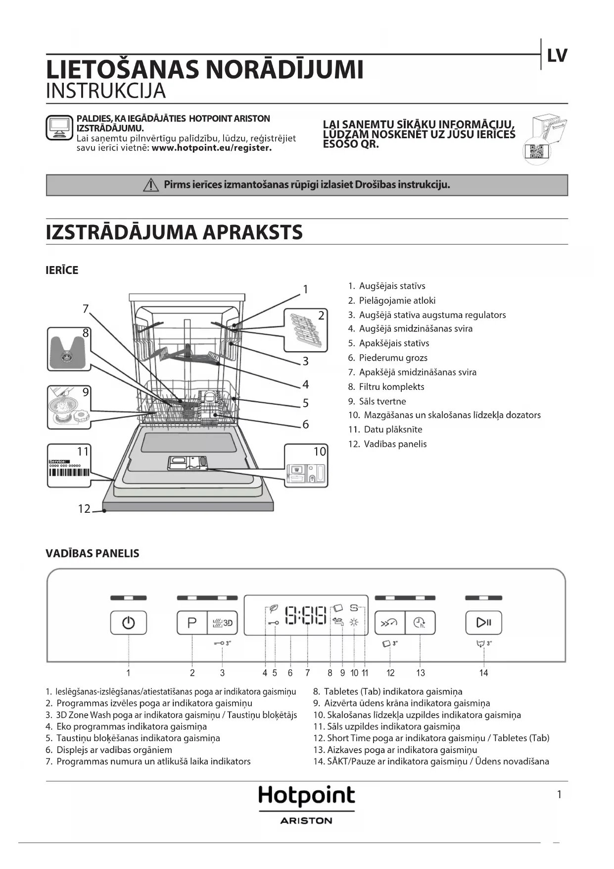 1. Ieslēgšanas-izslēgšanas/atiestatīšanas poga ar indikatora gaismiņu2. Programmas izvēles poga ar indikatora gaismiņu3. 3D Zone Wash poga ar indikatora gaismiņu / Taustiņu bloķētājs4. Eko programmas indikatora gaismiņa5. Taustiņu bloķēšanas indikatora gaismiņa6. Displejs ar vadības orgāniem7. Programmas numura un atlikušā laika indikators8. Tabletes (Tab) indikatora gaismiņa9. Aizvērta ūdens krāna indikatora gaismiņa10. Skalošanas līdzekļa uzpildes indikatora gaismiņa11. Sāls uzpildes indikatora gaismiņa12. Short Time poga ar indikatora gaismiņu / Tabletes (Tab)13. Aizkaves poga ar indikatora gaismiņu14. SĀKT/Pauze ar indikatora gaismiņu / Ūdens novadīšanaPALDIES, KA IEGĀDĀJĀTIES HOTPOINT ARISTON IZSTRĀDĀJUMU. Lai saņemtu pilnvērtīgu palīdzību, lūdzu, reģistrējiet savu ierīci vietnē: www.hotpoint.eu/register.LAI SAŅEMTU SĪKĀKU INFORMĀCIJU, LŪDZAM NOSKENĒT UZ JŪSU IERĪCES ESOŠO QR.2