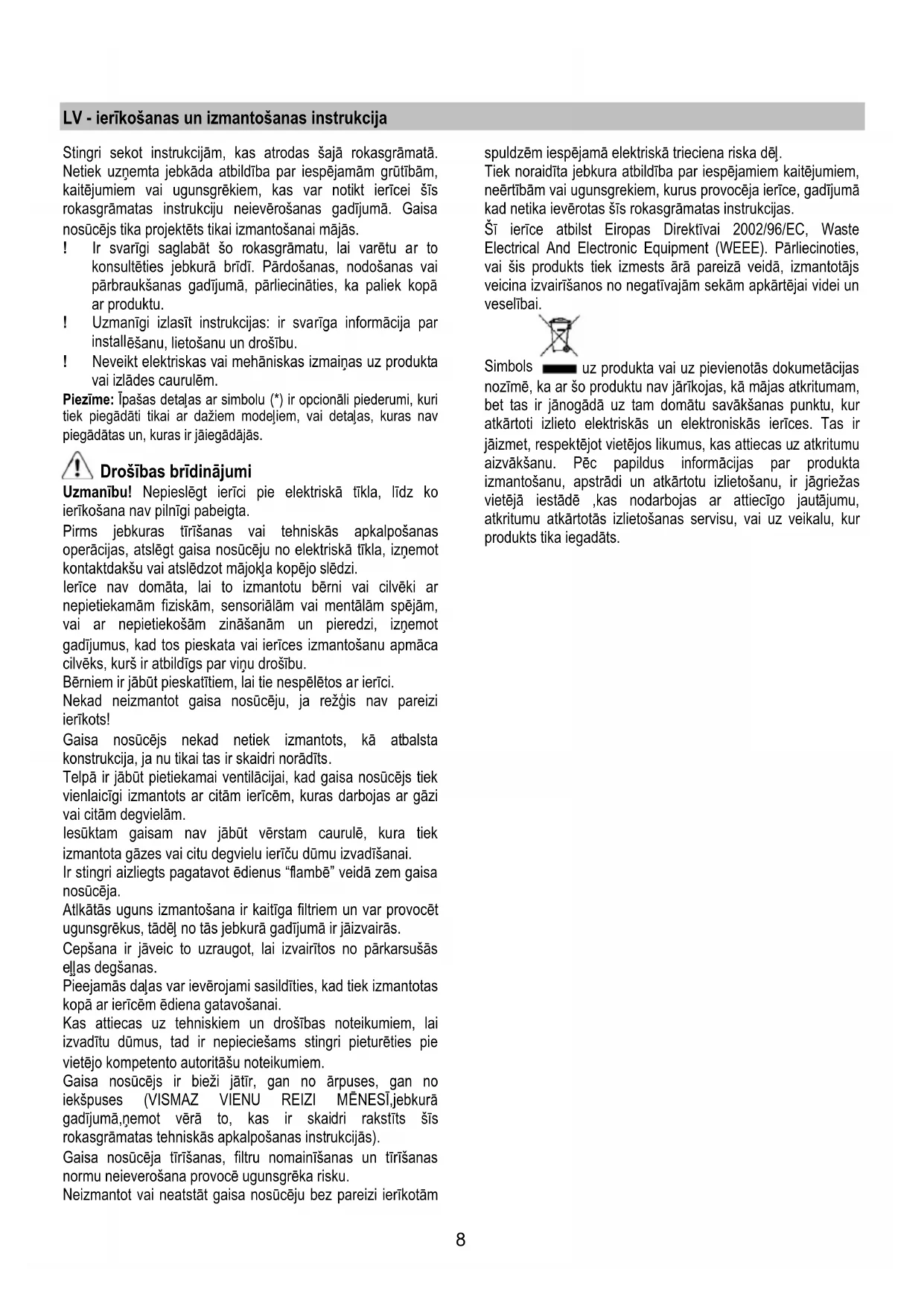 种类 瓦数 插座 象形图 卤素灯 28W E14 白炽灯 40W E14 FOG0024249 Ed.09/20118 LV - ierīkošanas un izmantošanas instrukcija Stingri sekot instrukcijām, kas atrodas šajā rokasgrāmatā. Netiek uzņemta jebkāda atbildība par iespējamām grūtībām, kaitējumiem vai ugunsgrēkiem, kas var notikt ierīcei šīs rokasgrāmatas instrukciju neievērošanas gadījumā. Gaisa nosūcējs tika projektēts tikai izmantošanai mājās. ! Ir svarīgi saglabāt šo rokasgrāmatu, lai varētu ar to konsultēties jebkurā brīdī. Pārdošanas, nodošanas vai pārbraukšanas gadījumā, pārliecināties, ka paliek kopā ar produktu. ! Uzmanīgi izlasīt instrukcijas: ir svarīga informācija par install ēšanu, lietošanu un drošību. ! Neveikt elektriskas vai mehāniskas izmaiņas uz produkta vai izlādes caurulēm. Piezīme: Īpašas detaļas ar simbolu (*) ir opcionāli piederumi, kuri tiek piegādāti tikai ar dažiem modeļiem, vai detaļas, kuras nav piegādātas un, kuras ir jāiegādājās. Drošības brīdinājumi Uzmanību! Nepieslēgt ierīci pie elektriskā tīkla, līdz ko ierīkošana nav pilnīgi pabeigta. Pirms jebkuras tīrīšanas vai tehniskās apkalpošanas operācijas, atslēgt gaisa nosūcēju no elektriskā tīkla, izņemot kontaktdakšu vai atslēdzot mājokļa kopējo slēdzi. Ierīce nav domāta, lai to izmantotu bērni vai cilvēki ar nepietiekamām fiziskām, sensoriālām vai mentālām spējām, vai ar nepietiekošām zināšanām un pieredzi, izņemot gadījumus, kad tos pieskata vai ierīces izmantošanu apmāca cilvēks, kurš ir atbildīgs par viņu droš ību. Bērniem ir jābūt pieskatītiem, lai tie nespēlētos ar ierīci. Nekad neizmantot gaisa nosūcēju, ja režģis nav pareizi ierīkots! Gaisa nosūcējs nekad netiek izmantots, kā atbalsta konstrukcija, ja nu tikai tas ir skaidri norādīts. Telpā ir jābūt pietiekamai ventilācijai, kad gaisa nosūcējs tiek vienlaicīgi izmantots ar citām ierīcēm, kuras darbojas ar gāzi vai citām degvielām. Iesūktam gaisam nav jābūt vērstam caurulē, kura tiek izmantota gāzes vai citu degvielu ierīču dūmu izvadīšanai. Ir stingri aizliegts pagatavot ēdienus “flambē” veidā zem gaisa nosūcēja. Atlk ātās uguns izmantošana ir kaitīga filtriem un var provocēt ugunsgrēkus, tādēļ no tās jebkurā gadījumā ir jāizvairās. Cepšana ir jāveic to uzraugot, lai izvairītos no pārkarsušās eļļas degšanas. Pieejamās daļas var ievērojami sasildīties, kad tiek izmantotas kopā ar ierīcēm ēdiena gatavošanai. Kas attiecas uz tehniskiem un drošības noteikumiem, lai izvadītu dūmus, tad ir nepieciešams stingri pieturēties pie vietējo kompetento autoritāšu noteikumiem. Gaisa nosūcējs ir bieži jātīr, gan no ārpuses, gan no iekšpuses (VISMAZ VIENU REIZI MĒNESĪ,jebkurā gadījumā,ņemot vērā to, kas ir skaidri rakst īts šīs rokasgrāmatas tehniskās apkalpošanas instrukcijās). Gaisa nosūcēja tīrīšanas, filtru nomainīšanas un tīrīšanas normu neieverošana provocē ugunsgrēka risku. Neizmantot vai neatstāt gaisa nosūcēju bez pareizi ierīkotām spuldzēm iespējamā elektriskā trieciena riska dēļ. Tiek noraidīta jebkura atbildība par iespējamiem kaitējumiem, neērtībām vai ugunsgrekiem, kurus provocēja ierīce, gadījumā kad netika ievērotas šīs rokasgrāmatas instrukcijas. Šī ierīce atbilst Eiropas Direktīvai 2002/96/EC, Waste Electrical And Electronic Equipment (WEEE). Pārliecinoties, vai šis produkts tiek izmests ārā pareizā veidā, izmantotājs veicina izvairīšanos no negatīvajām sekām apkārtējai videi un veselībai. Simbols uz produkta vai uz pievienotās dokumetācijas nozīmē, ka ar šo produktu nav jārīkojas, kā mājas atkritumam, bet tas ir jānogādā uz tam domātu savākšanas punktu, kur atkārtoti izlieto elektriskās un elektroniskās ierīces. Tas ir jāizmet, respektējot vietējos likumus, kas attiecas uz atkritumu aizvākšanu. Pēc papildus informācijas par produkta izmantošanu, apstrādi un atkārtotu izlietošanu, ir jāgriežas vietējā iestādē ,kas nodarbojas ar attiecīgo jautājumu, atkritumu atkārtotās izlietošanas servisu, vai uz veikalu, kur produkts tika iegadāts.9 Izmantošana Gaisa nosūcējs ir veidots, lai to izmantotu iesūkšanas versijā ar evakuāciju uz ārpusi vai filtrēšanas versijā ar iekšējo recirkulāciju. Iesūkšanas versija Gaisa nosūcējam ir gaisa augšējā izeja B, kas ir domāta dūmu izvadīšanai uz ārpusi (izvadīšanas caurule un stiprinājuma spailes nav piegādātas). Attēls 1 Versija ar filtru Gadijuma, ja nav iespejams izvadit dumus un tvaikus uz arpusi, var izmantot gaisa nosuceju versija ar filtru, ierikojot 1 vai 2 aktivo oglu filtrus (*). Dumi un tvaiki tiek atkartoti apstradati virtuve. Attēls 2 Modeļi bez iesūkšanas motora darbojas tikai iesūkšanas versijā un tiem ir jābūt pievienotiem pie perifēriskas iesūkšanas vienības (nav piegādāta ar ierīci). Savienosanas instrukcijas ir sniegtas kopā ar perifērisko vienību. Ierīkošana Attēls 3-4-5-6-7-8-9-10 Minimālam attālumam starp plīts virsmu, kur tiek novietoti tilpumi un viszemākās gaisa nosūcēja daļas nav jābūt mazākam par 50cm elektriskās plīts gadījumā un 65cm gāzes un kombinētas virtuves gadījumā. Gadījumā, ja ierīkošanas instrukcijās gāzes ierīcei tiek precizēts lielāks attālums, ir nepieciešams to ievērot. Elektriskā pieslēgšana Tīkla spriegumam ir jāatbilst spriegumam, kurš ir atzīmēts uz īpašas etiķetes, kura atrodas gaisa nosūcēja iekšpusē. Ja nosūcējam ir kontaktdakša, pievienot to rozetei, kura atbilst pastāvošiem likumiem un atrodas pieejamā zonā arī pēc installēšanas. Ja gaisa nosūcējam nav kontaktdakšas (tieša pieslēgšana pie elektriskās sistēmas) vai arī kontaktdakša neatrodas pieejamā zonā, arī pēc installēšanas, pielietot normām atbilstošu bipolāru slēdzi, kurš no