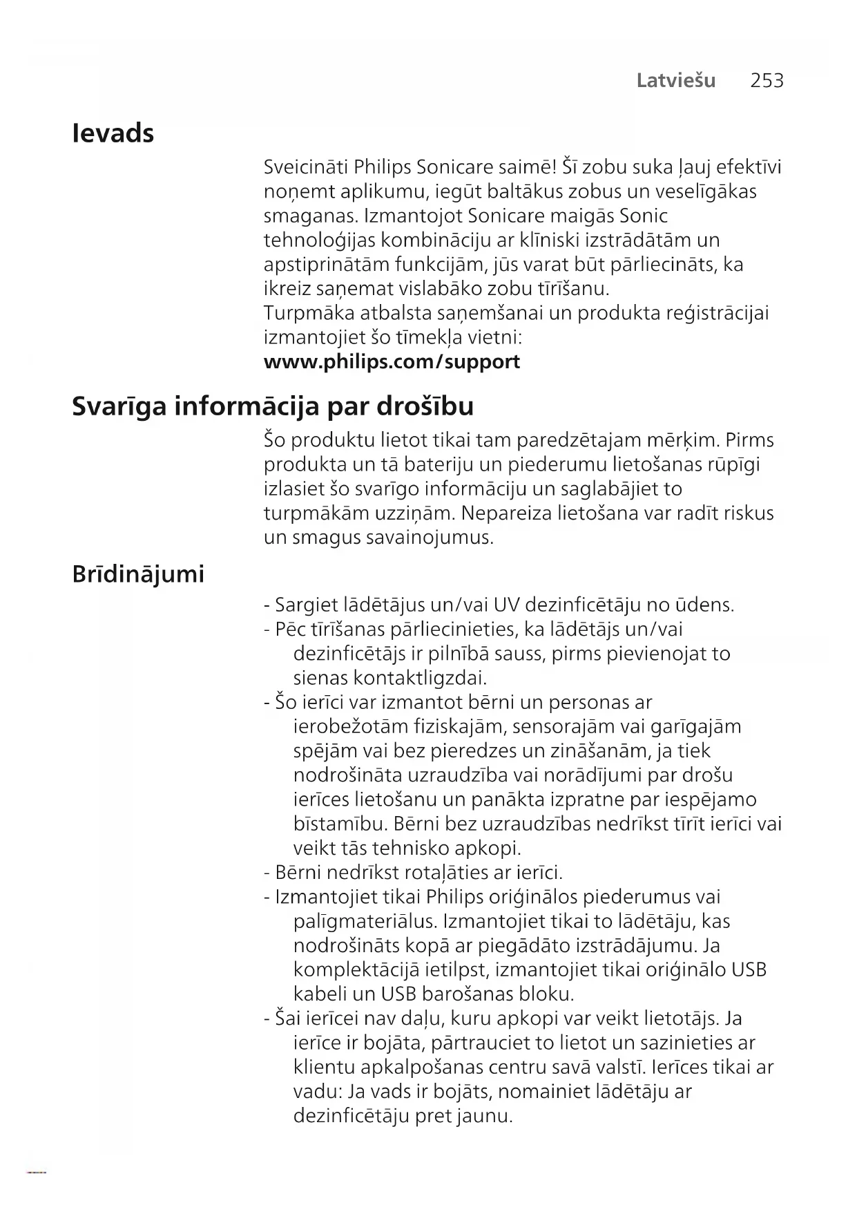 Latviešu Ievads Sveicināti Philips Sonicare saimē! Šī zobu suka ļauj efektīvi noņemt aplikumu, iegūt baltākus zobus un veselīgākas smaganas. Izmantojot Sonicare maigās Sonic tehnoloģijas kombināciju ar klīniski izstrādātām un apstiprinātām funkcijām, jūs varat būt pārliecināts, ka ikreiz saņemat vislabāko zobu tīrīšanu. Turpmāka atbalsta saņemšanai un produkta reģistrācijai izmantojiet šo tīmekļa vietni: www.philips.com/support Svarīga informācija par drošību Šo produktu lietot tikai tam paredzētajam mērķim. Pirms produkta un tā bateriju un piederumu lietošanas rūpīgi izlasiet šo svarīgo informāciju un saglabājiet to turpmākām uzziņām. Nepareiza lietošana var radīt riskus un smagus savainojumus. Brīdinājumi - Sargiet lādētājus un/vai UV dezinficētāju no ūdens. - Pēc tīrīšanas pārliecinieties, ka lādētājs un/vai dezinficētājs ir pilnībā sauss, pirms pievienojat to sienas kontaktligzdai. - Šo ierīci var izmantot bērni un personas ar ierobežotām fiziskajām, sensorajām vai garīgajām spējām vai bez pieredzes un zināšanām, ja tiek nodrošināta uzraudzība vai norādījumi par drošu ierīces lietošanu un panākta izpratne par iespējamo bīstamību. Bērni bez uzraudzības nedrīkst tīrīt ierīci vai veikt tās tehnisko apkopi. - Bērni nedrīkst rotaļāties ar ierīci. - Izmantojiet tikai Philips oriģinālos piederumus vai palīgmateriālus. Izmantojiet tikai to lādētāju, kas nodrošināts kopā ar piegādāto izstrādājumu. Ja komplektācijā ietilpst, izmantojiet tikai oriģinālo USB kabeli un USB barošanas bloku. - Šai ierīcei nav daļu, kuru apkopi var veikt lietotājs. Ja ierīce ir bojāta, pārtrauciet to lietot un sazinieties ar klientu apkalpošanas centru savā valstī. Ierīces tikai ar vadu: Ja vads ir bojāts, nomainiet lādētāju ar dezinficētāju pret jaunu.254 Latviešu - Neizmantojiet lādētāju un/vai dezinficētāju ārpus telpām vai karstu virsmu tuvumā. - Nemazgājiet nevienu izstrādājuma daļu trauku mazgājamajā mašīnā. - Šī ierīce ir paredzēta tikai zobu, smaganu un mēles tīrīšanai. - Dezinficētāju vienmēr glabājiet bērniem nepieejamā vietā. - Nelietojiet dezinficētāju, ja UVgaismas spuldze nenodziest vai vāks ir atvērts. UV gaisma var bojāt cilvēka acis un ādu. - Dezinficētāju izmantojiet tikai tad, ja ir uzstādīts aizsargekrāns. - Nepieskarieties dezinficētāja UV gaismas spuldzei, kamēr tā ir karsta. - Pārtrauciet lietot sukas uzgali, ja tās sari ir saspiesti vai saliekti. Nomainiet sukas uzgali ik pēc 3mēnešiem vai agrāk, ja tam ir redzamas nolietojuma pazīmes. - Nepieļaujiet tiešu saskari ar izstrādājumiem, kas satur ēteriskās eļļas vai kokosriekstu eļļu. Saskare ar eļļu var sekmēt sariņu izkrišanu. - Pārtrauciet ierīces lietošanu un konsultējieties ar savu zobārstu/ārstu, ja pēc lietošanas rodas pārmērīga asiņošana, ja pēc 1 lietošanas nedēļas turpinās asiņošana vai ja Jums rodas diskomforts vai sāpes. - Ja pēdējo divu mēnešu laikā jums ir bijušas mutes vai smaganu operācijas, pirms šīs ierīces lietošanas konsultējieties ar zobārstu. - Ja jums ir elektrokardiostimulators vai cita implantēta ierīce, pirms lietošanas konsultējieties ar ārstu vai implantētās ierīces ražotāju. - Ja jums radušās medicīniska rakstura šaubas, pirms šīs ierīces lietošanas konsultējieties ar ārstu. - Šī ir personīgās higiēnas ierīce, un tā nav paredzēta lietošanai vairākiem pacientiem zobārstniecības praksē vai iestādē. Bateriju drošības norādījumi - Šajā ierīcē ir baterijas, kuras izņemt drīkst tikai kvalificēts speciālists.255 Latviešu - Šo produktu lietot tikai tam paredzētajam mērķim. Pirms produkta, tā bateriju un piederumu lietošanas rūpīgi izlasiet šo svarīgo informāciju un saglabājiet to turpmākām uzziņām. Nepareiza lietošana var radīt riskus un smagus savainojumus. Komplektā iekļautie piederumi dažādiem produktiem var atšķirties. - Izmantojiet tikai oriģinālos Philips piederumus un patēriņa preces. Izmantojiet tikai noņemamo barošanas bloku TCBxxxx, HX6100, HX6110, HX6160 vai WAAxxxx. - Nenovietojiet produktu un baterijas uguns tuvumā, kā arī nepakļaujiet tos tiešu saules staru vai augstas temperatūras iedarbībai. - Ja produkts pārlieku sakarst vai izdala smaku, maina krāsu vai uzlāde notiek ilgāk nekā parasti, pārtrauciet produkta lietošanu un uzlādi, un sazinieties ar Philips. - Izstrādājumus un to baterijas nedrīkst likt mikroviļņu krāsnīs vai uz indukcijas plītīm. - Neatveriet, nepārveidojiet, necaurduriet, nebojājiet vai neizjauciet izstrādājumu vai bateriju, lai novērstu bateriju sakaršanu vai indīgu vai bīstamu vielu noplūdi. Neizraisiet īsslēgumu, nepārlādējiet baterijas vai neveiciet to atgriezenisku uzlādi. - Šajā iekārtā iekļautas baterijas, kas nav nomaināmas. Kad baterija ir nokalpojusi, atbilstoši atbrīvojieties no ierīces, skatiet sadaļu Pārstrāde. - Ja baterijas ir bojātas vai ja tām radusies noplūde, izvairieties no saskares ar ādu vai acīm. Ja tā tomēr notiek, nekavējoties rūpīgi skalojiet ar ūdeni un vērsieties pēc medicīniskas palīdzības. - Rīkojoties ar baterijām, pārliecinieties, ka gan jūsu rokas, gan arī izstrādājums un baterijas ir sausi. - Lai pēc bateriju izņemšanas tām nerastos īsslēgums, neļaujiet bateriju kontaktiem saskarties ar metāla priekšmetiem (piem., monētām, matu sprādzēm, gredzeniem). Netiniet baterijas alumīnija folijā. Pirms likvidējat, aptiniet bateriju spailes ar līmlentu vai ievietojiet baterijas plastmasas maisiņā. - Uzlādējiet un lietojiet ierīci no 0°C līdz 40°C temperatūrā.256 Latviešu Uzglabāšanas un pārvadāšanas nosacījumi Temperatūra: no -10°C līdz 60°C. Elektromagnētiskie lauki (EML) Šī Philips ierīce atbilst visiem piemērojamajiem sta